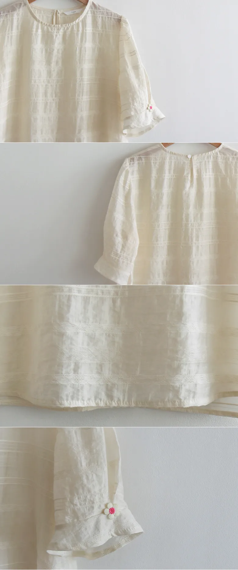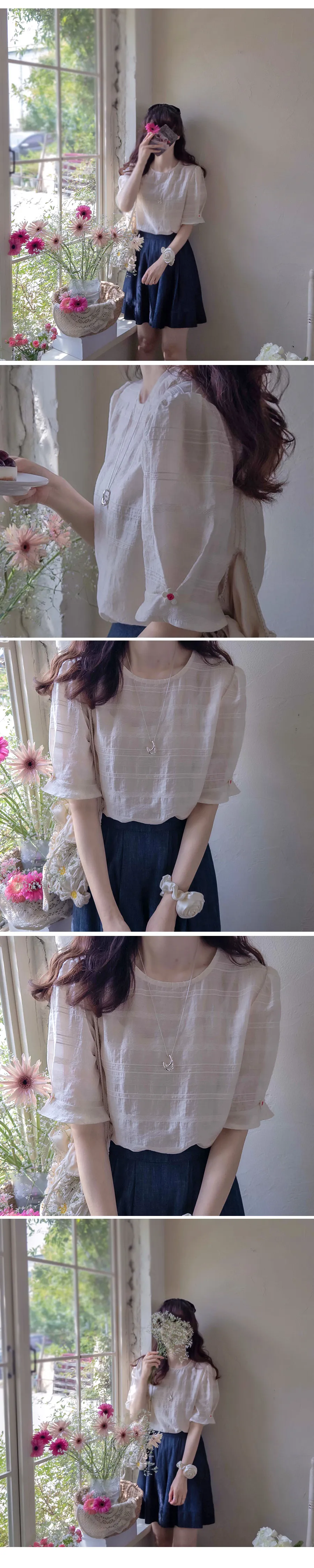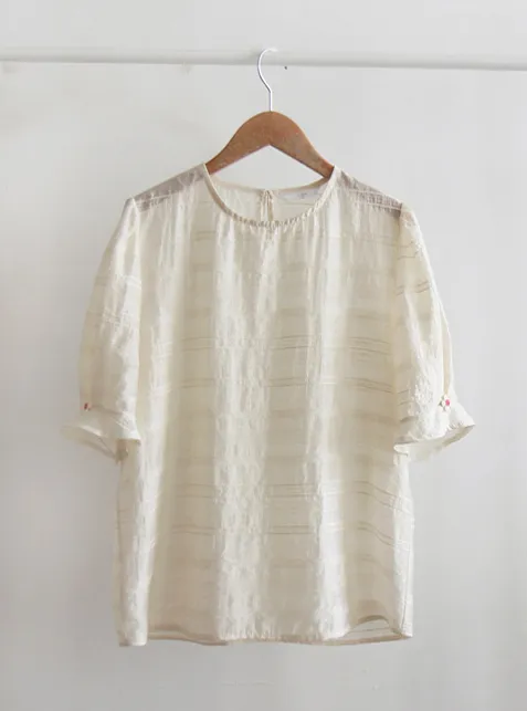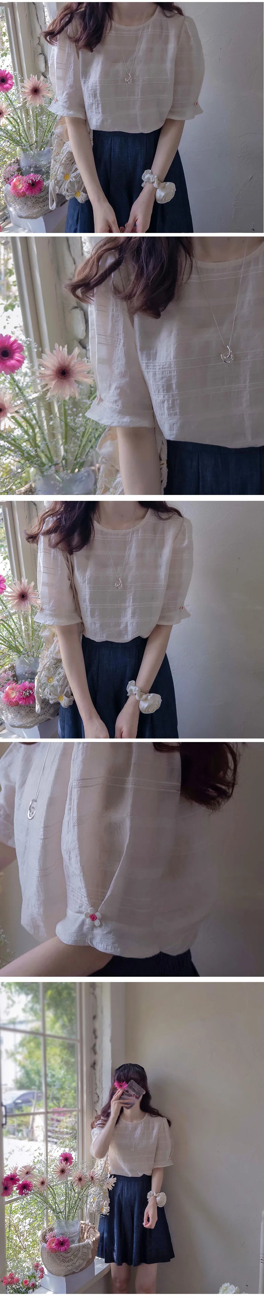 [天絲55%、人造絲27%、尼龍18%的清涼面料] [可愛輕盈的上衣] [袖子採用與肩同寬的泡泡袖設計,並飾有花朵裝飾,增添可愛氣息] [夏季面料,帶有細膩純淨的條紋刺繡,盡顯精緻優雅]