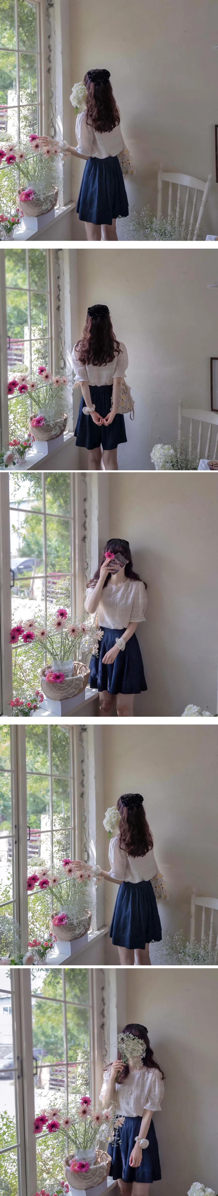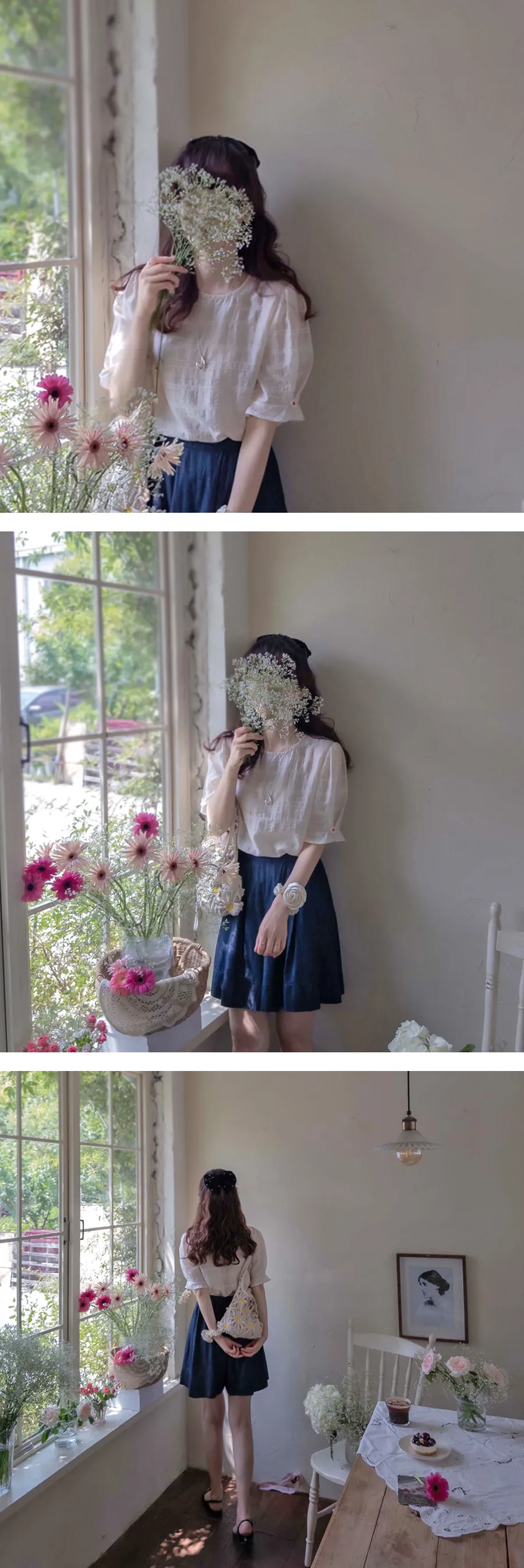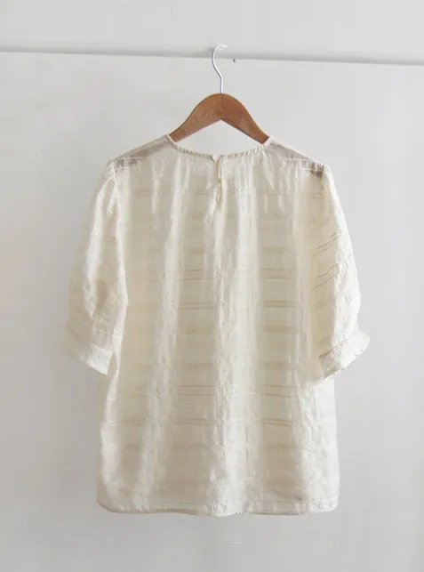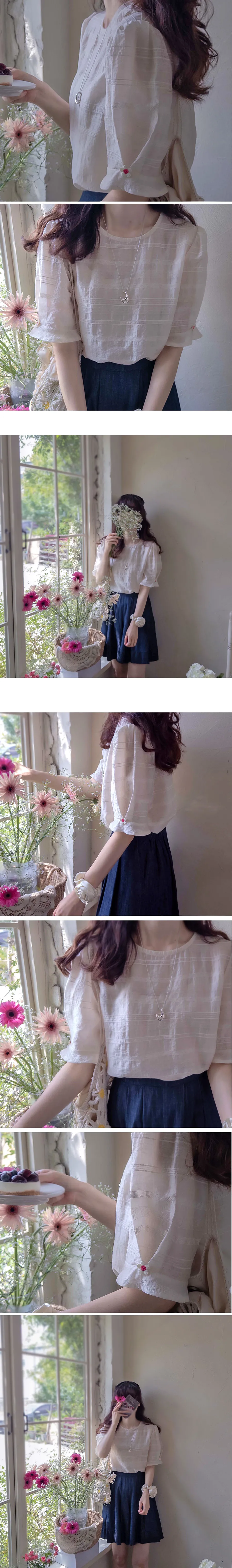 [天絲55%、人造絲27%、尼龍18%的清涼面料] [可愛輕盈的上衣] [袖子採用與肩同寬的泡泡袖設計,並飾有花朵裝飾,增添可愛氣息] [夏季面料,帶有細膩純淨的條紋刺繡,盡顯精緻優雅]