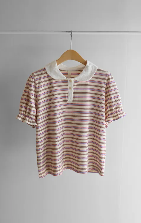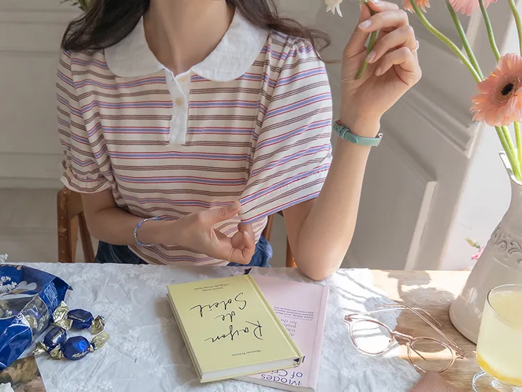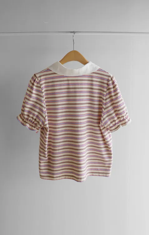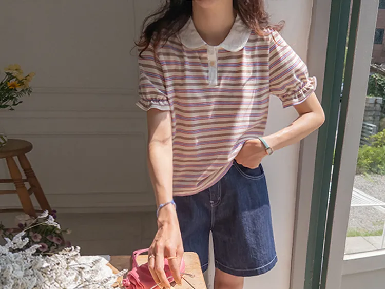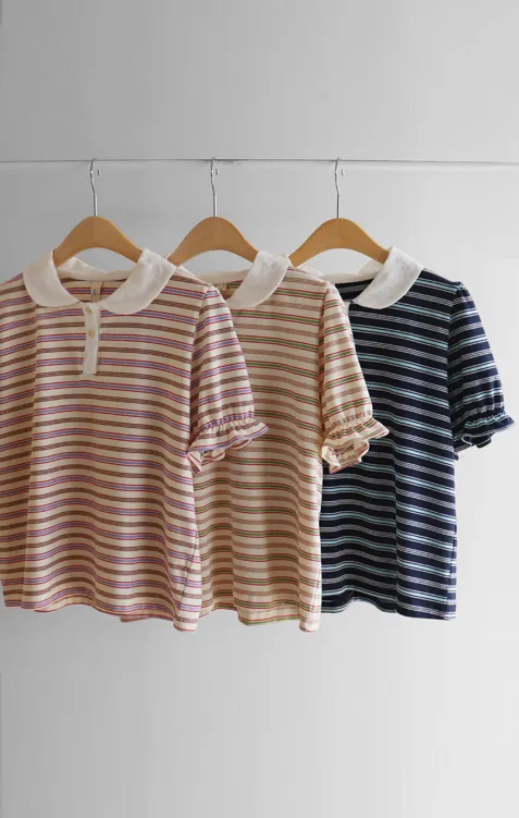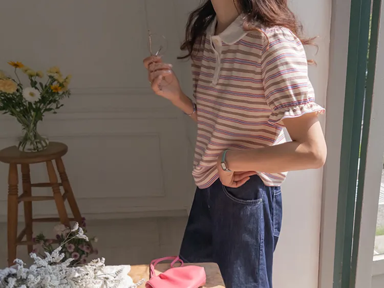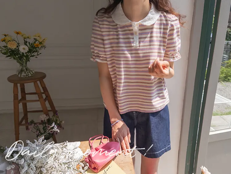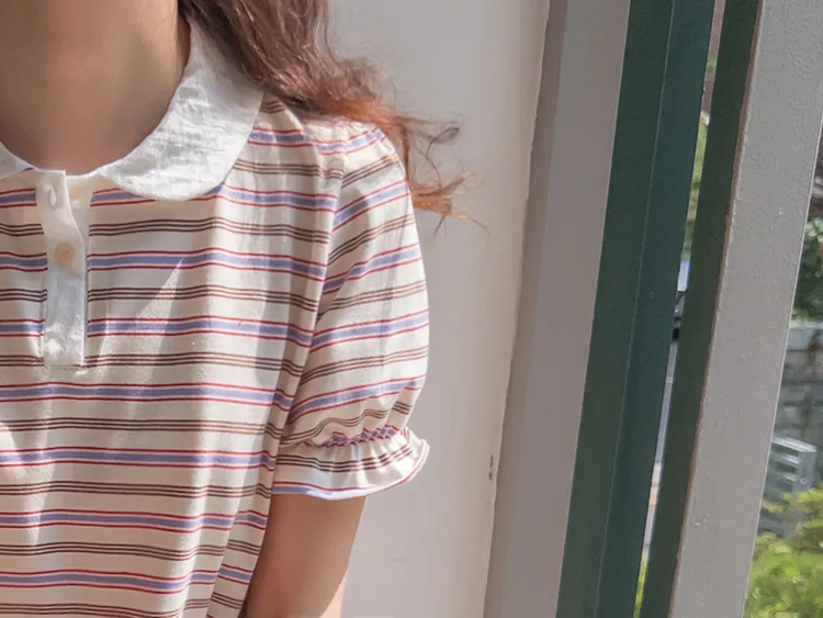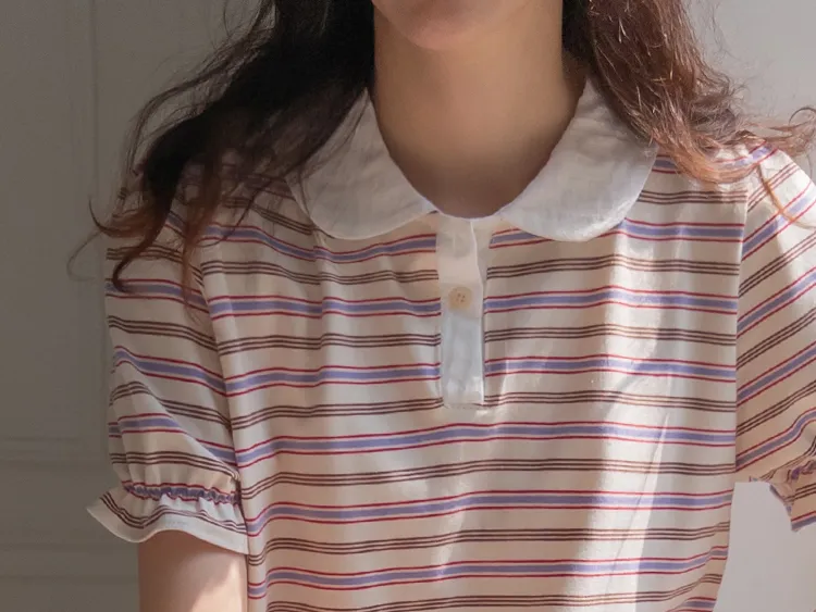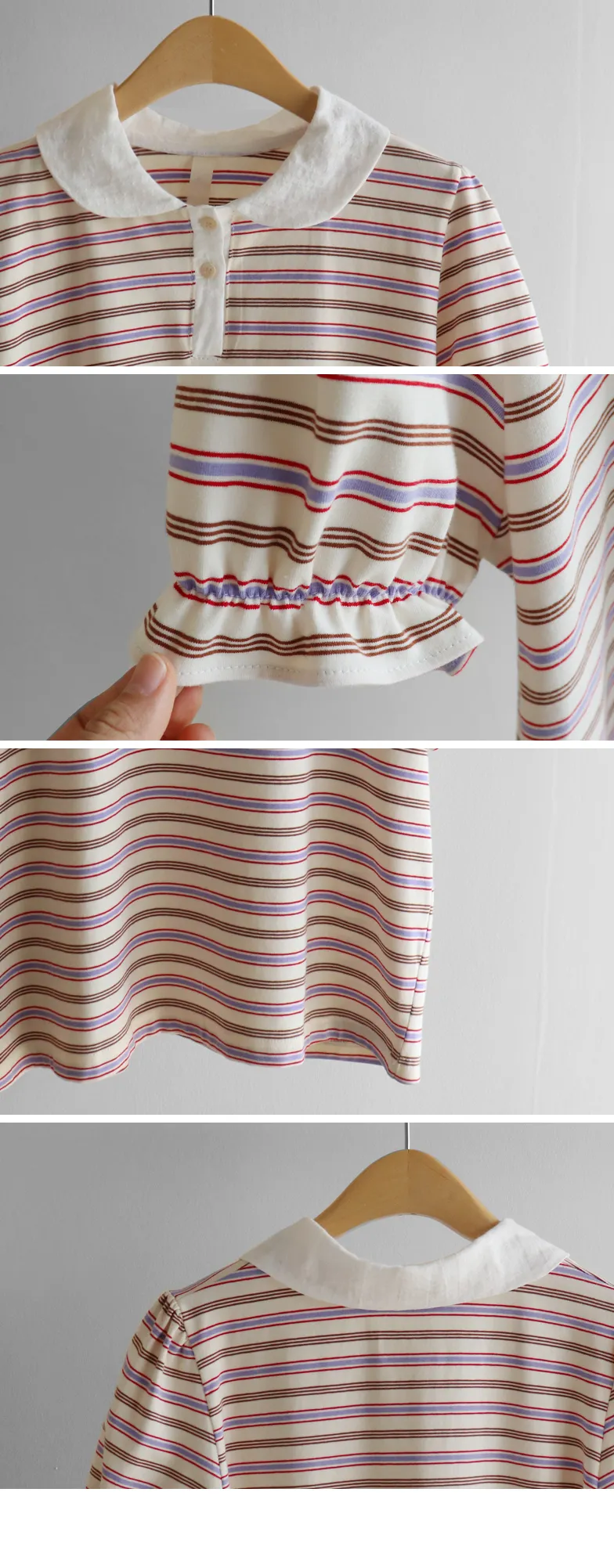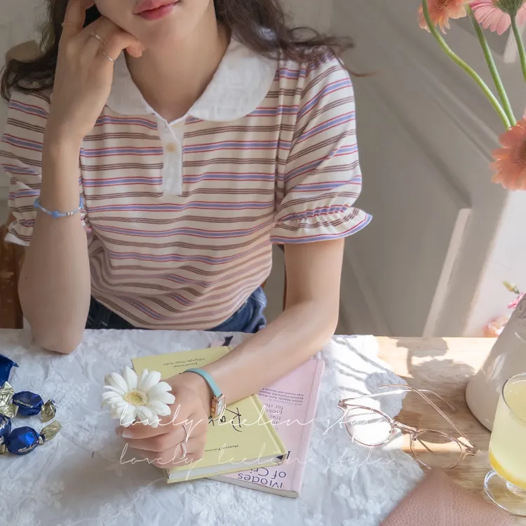 可愛袖口束摺邊半排扣圓領色彩條紋上衣