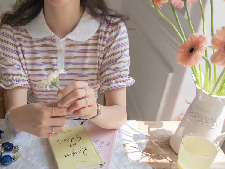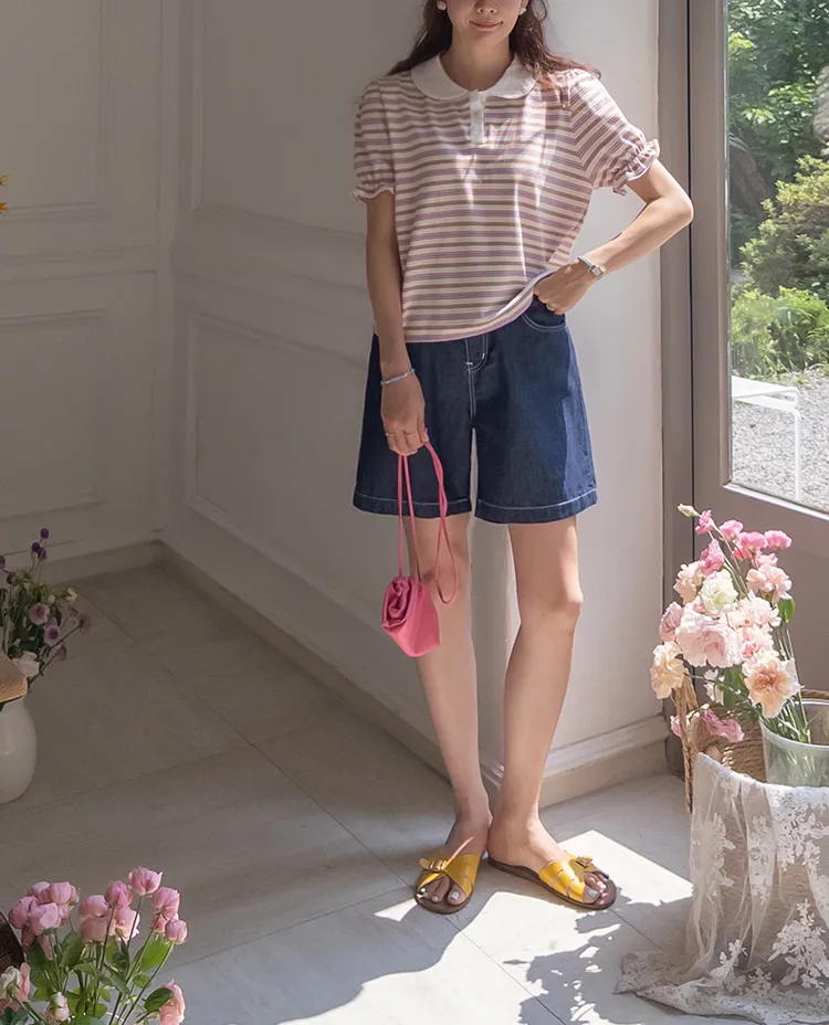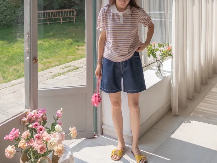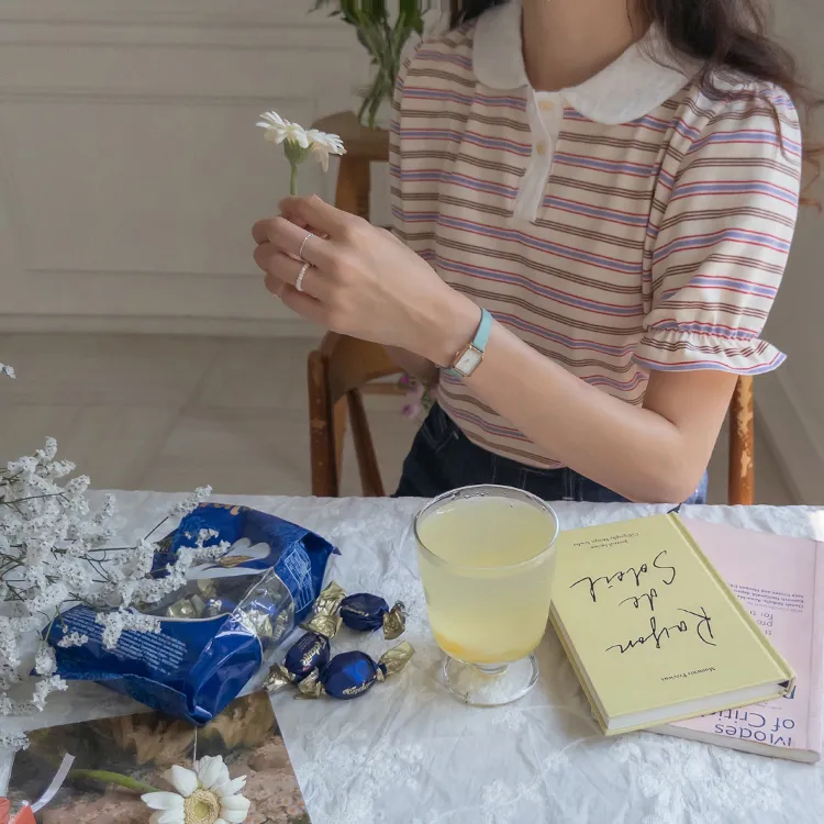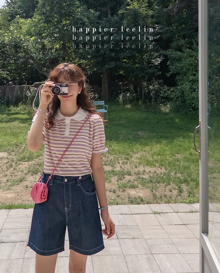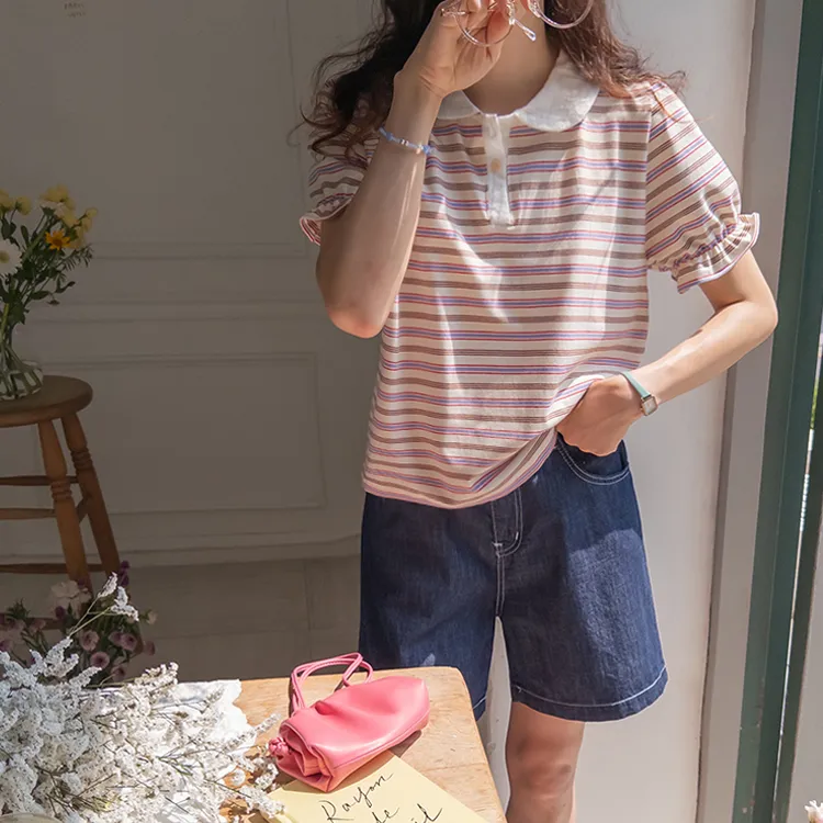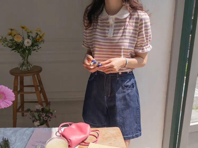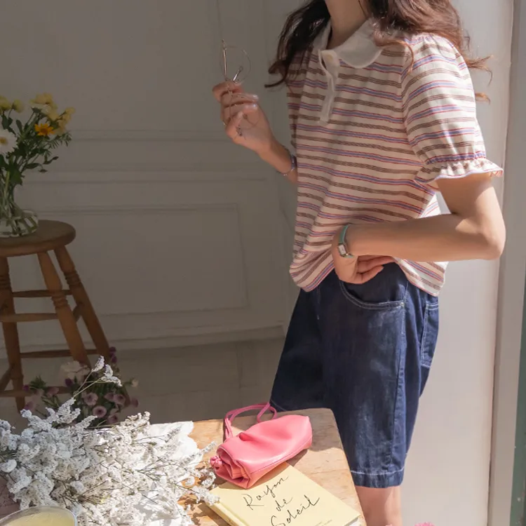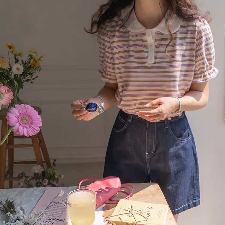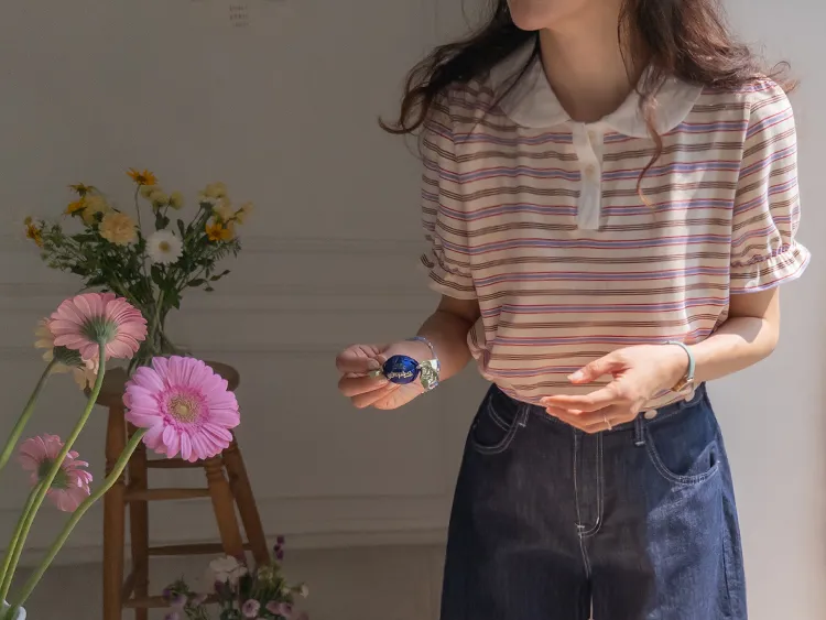 可愛袖口束摺邊半排扣圓領色彩條紋上衣