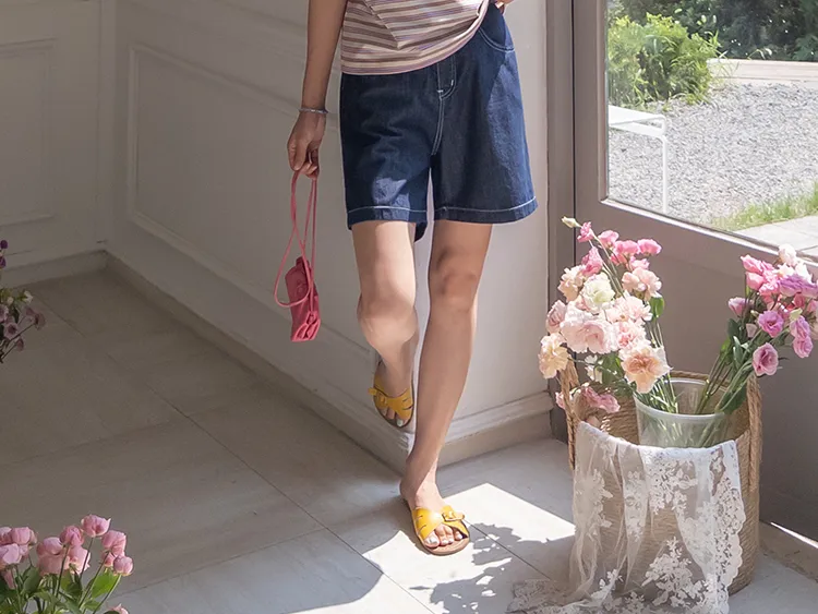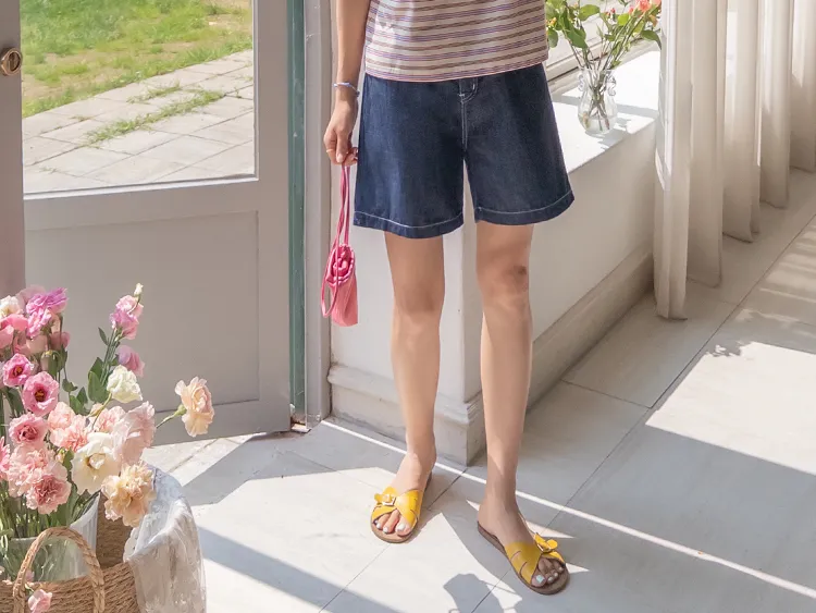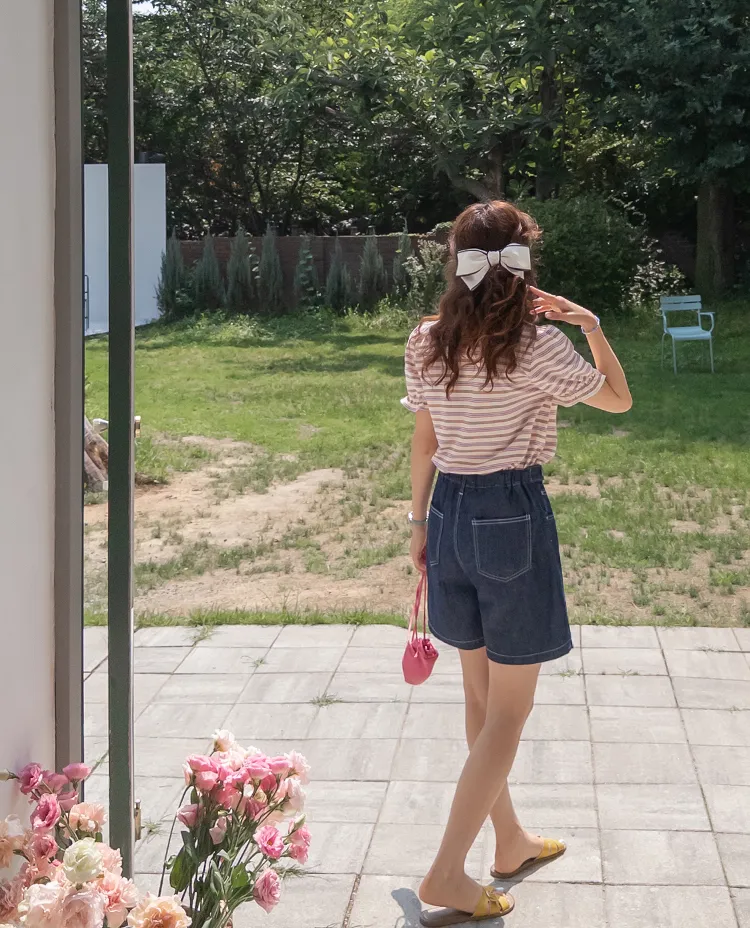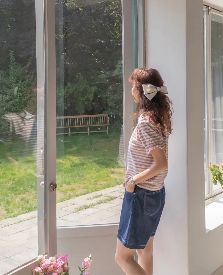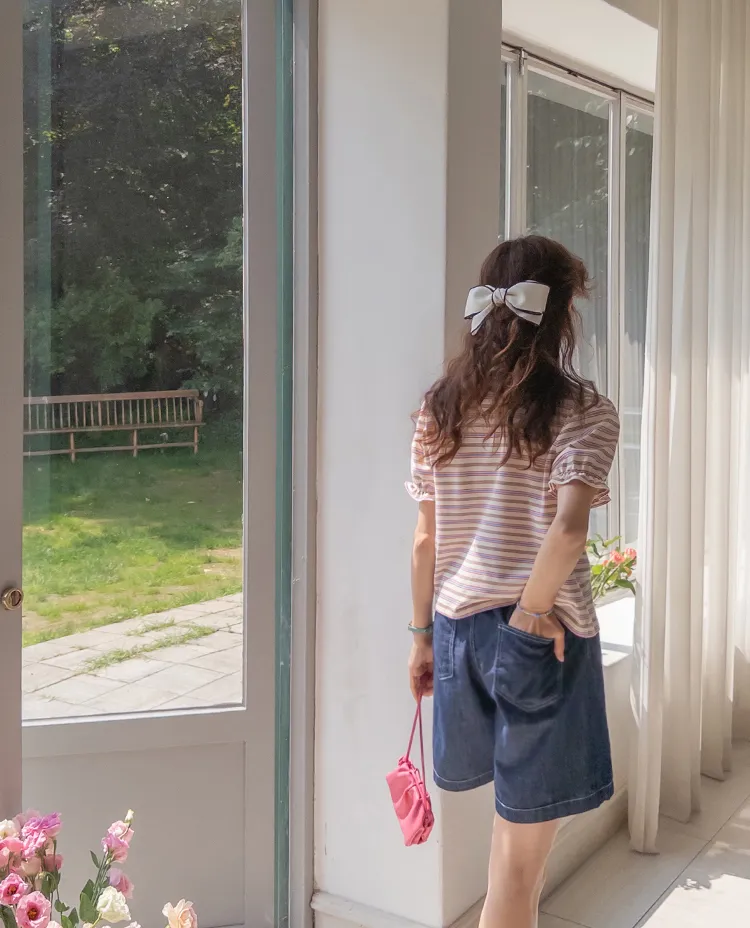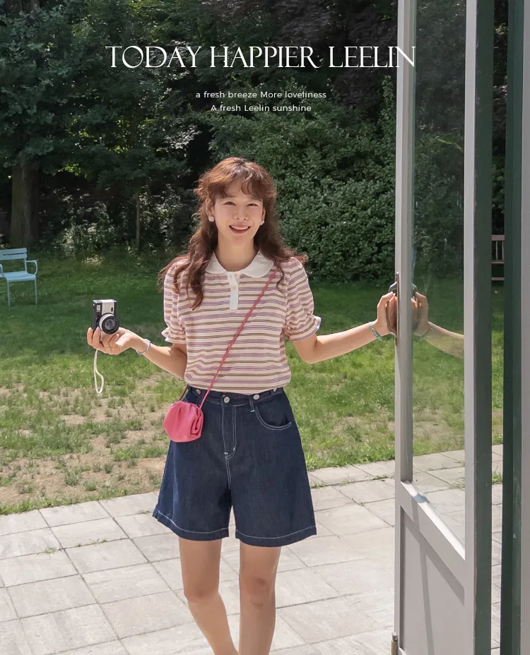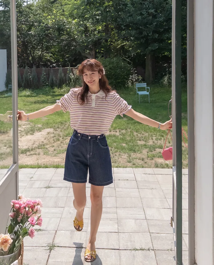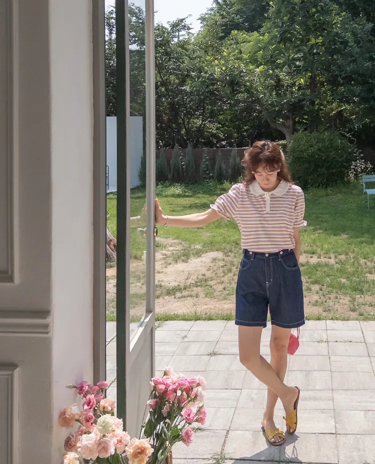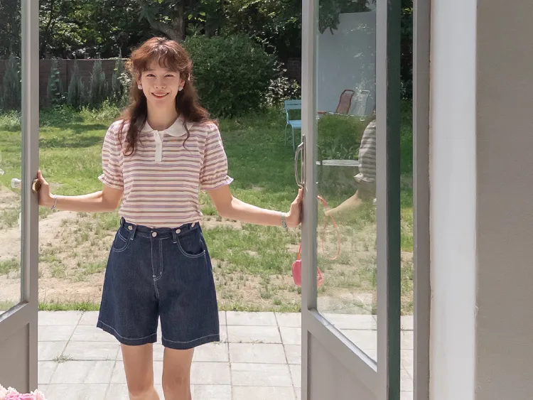 可愛袖口束摺邊半排扣圓領色彩條紋上衣
