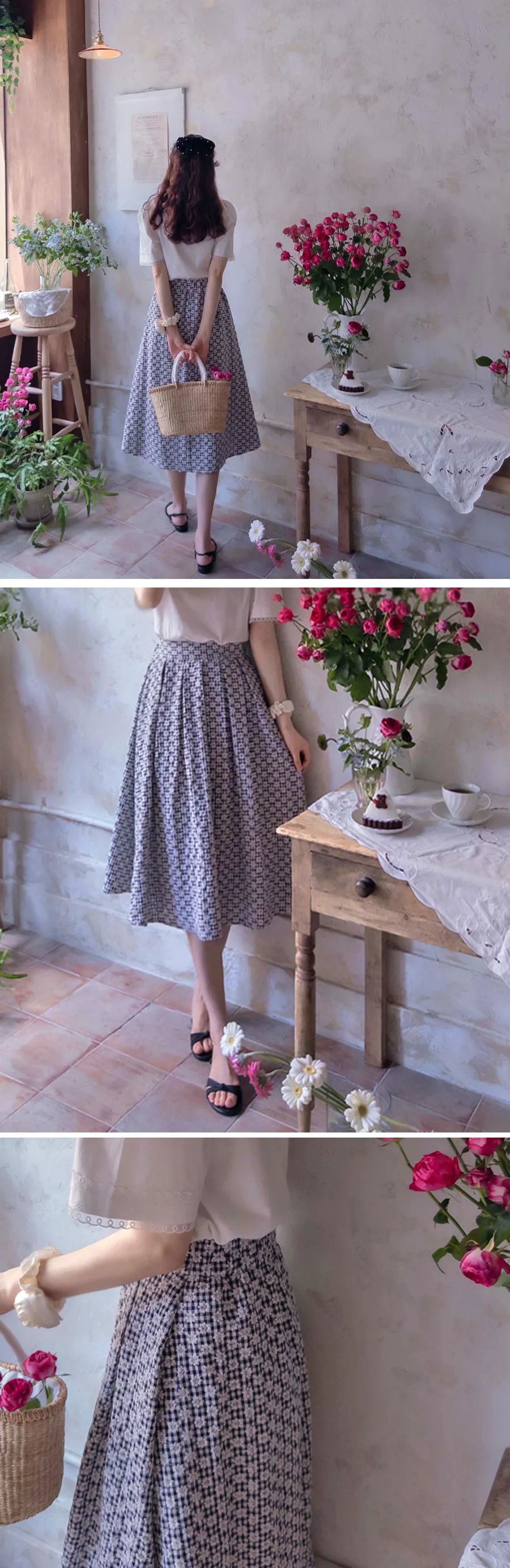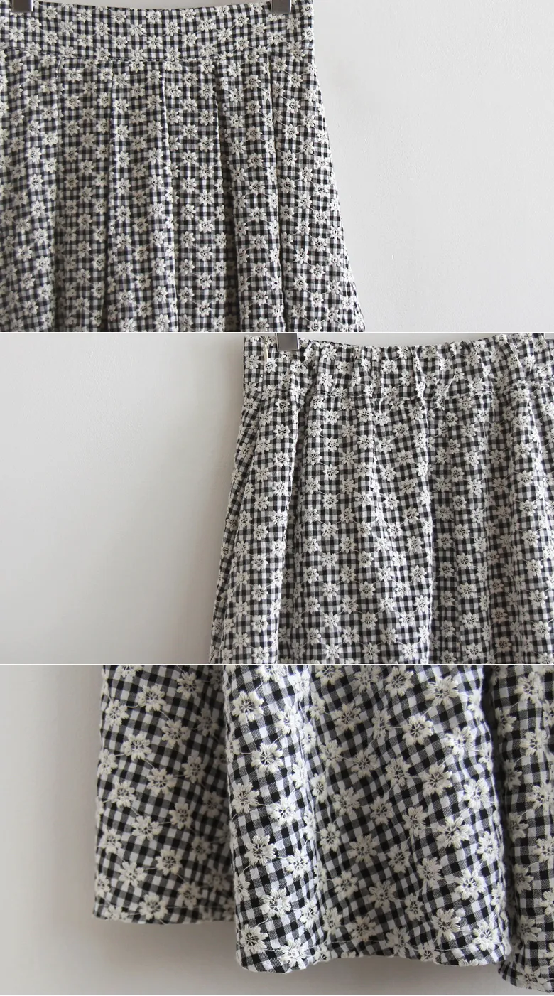 活潑花朵刺繡格紋摺線裙擺中長裙