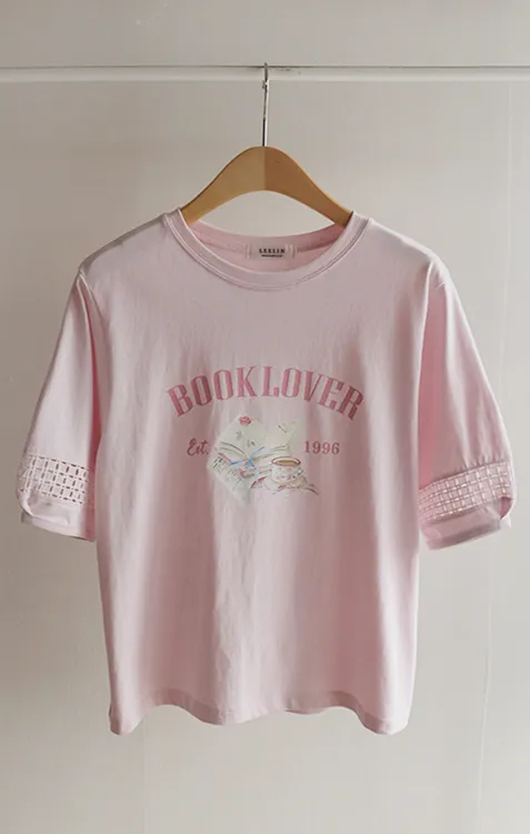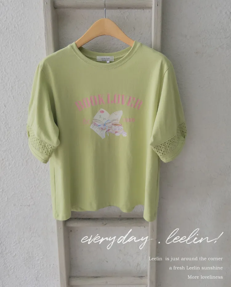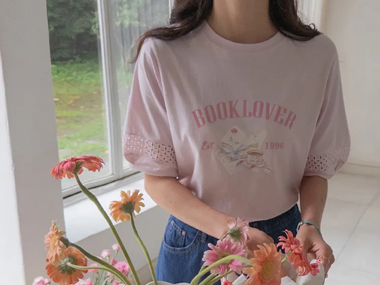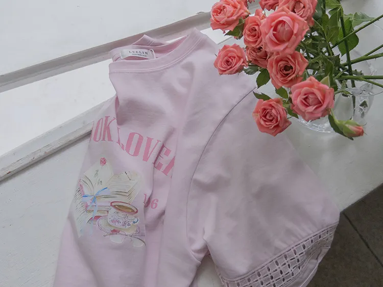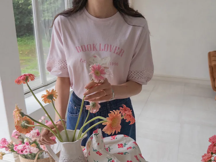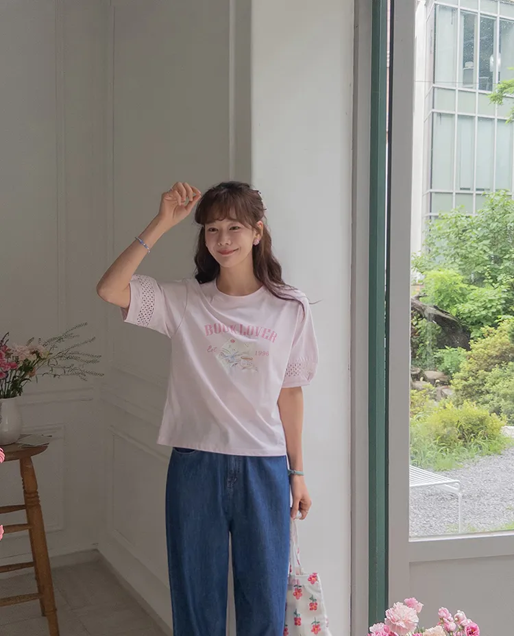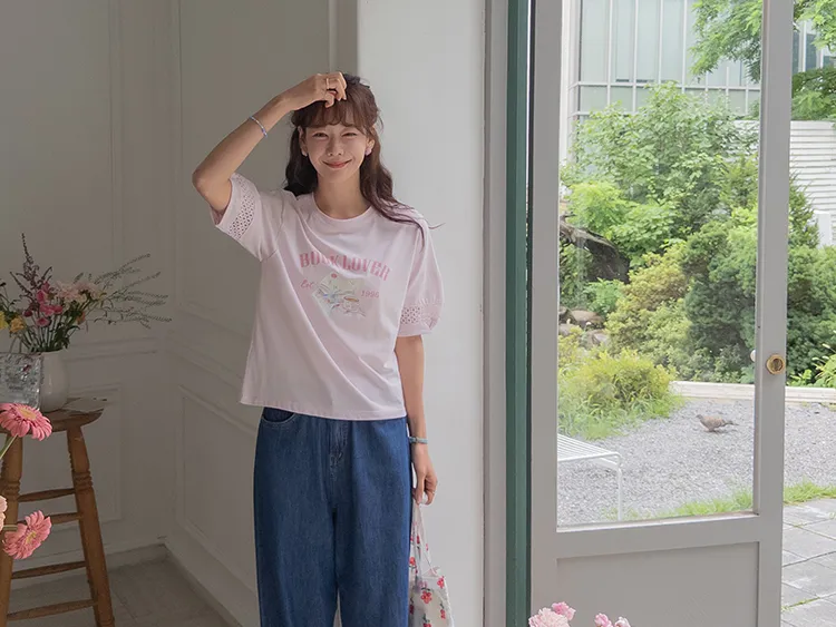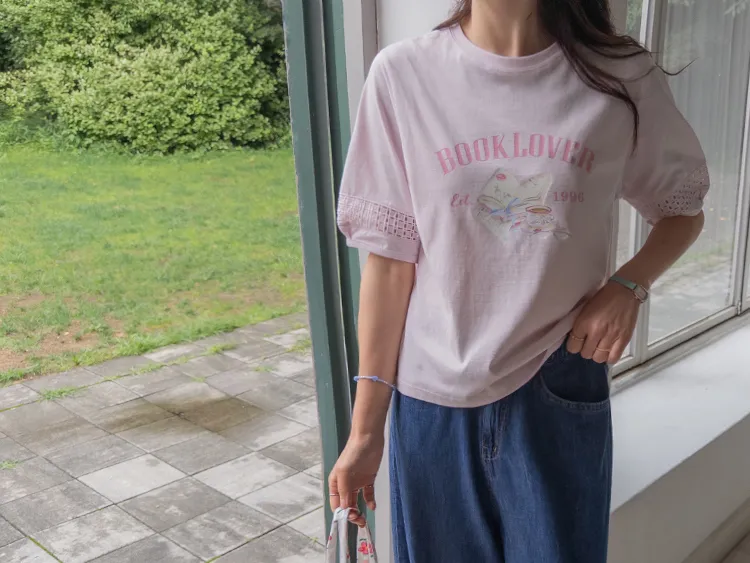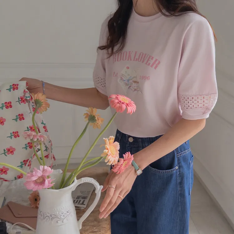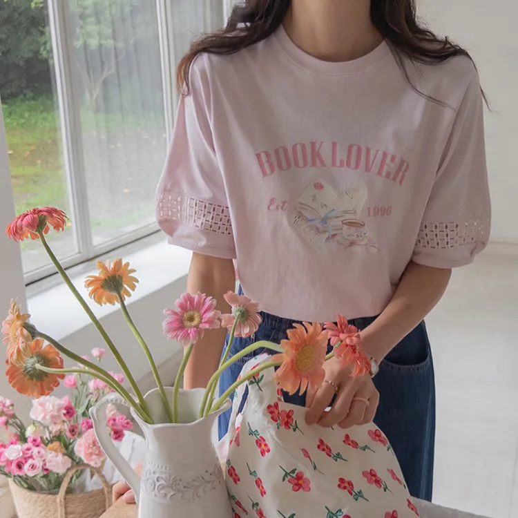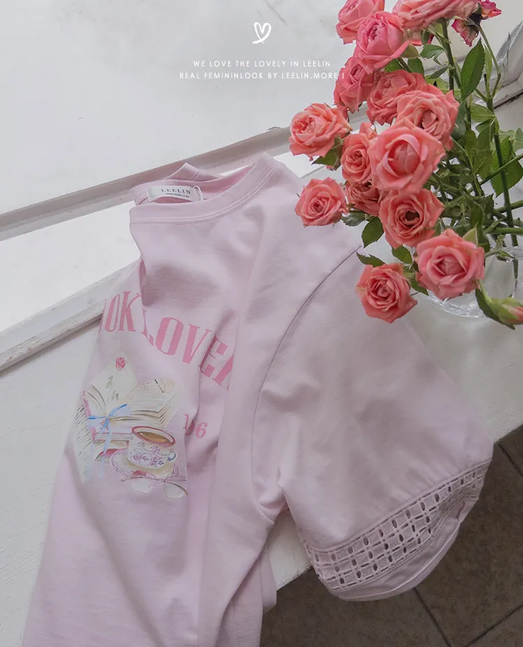 漂亮泡泡袖口鏤空花邊柔和印花穿搭上衣