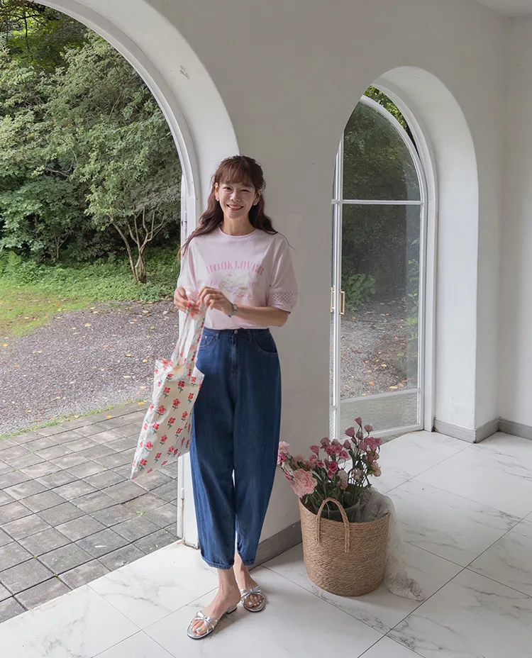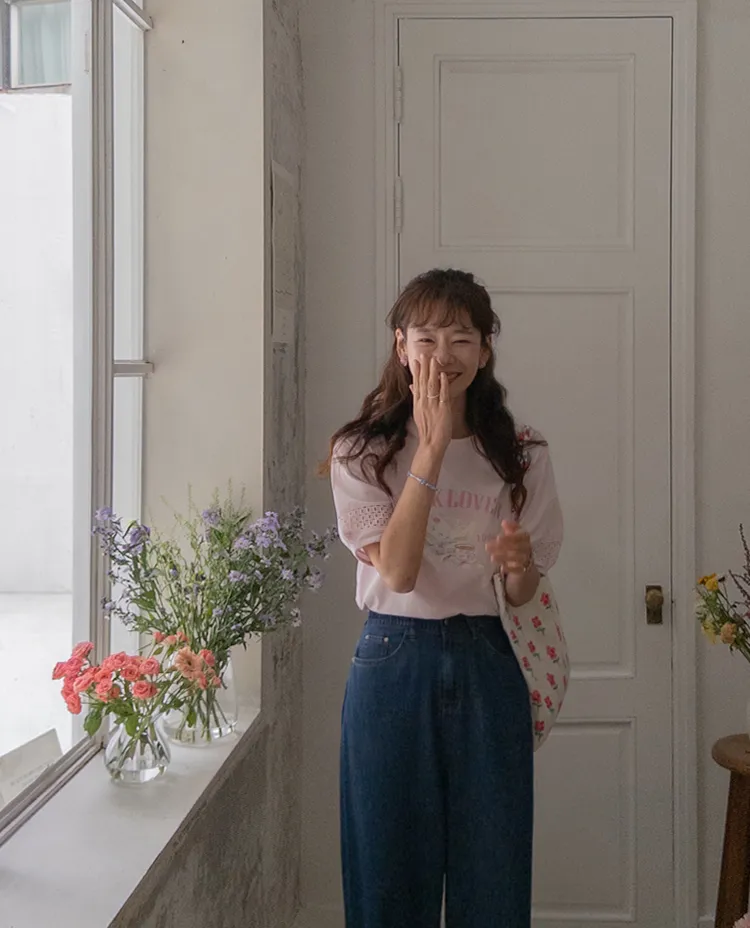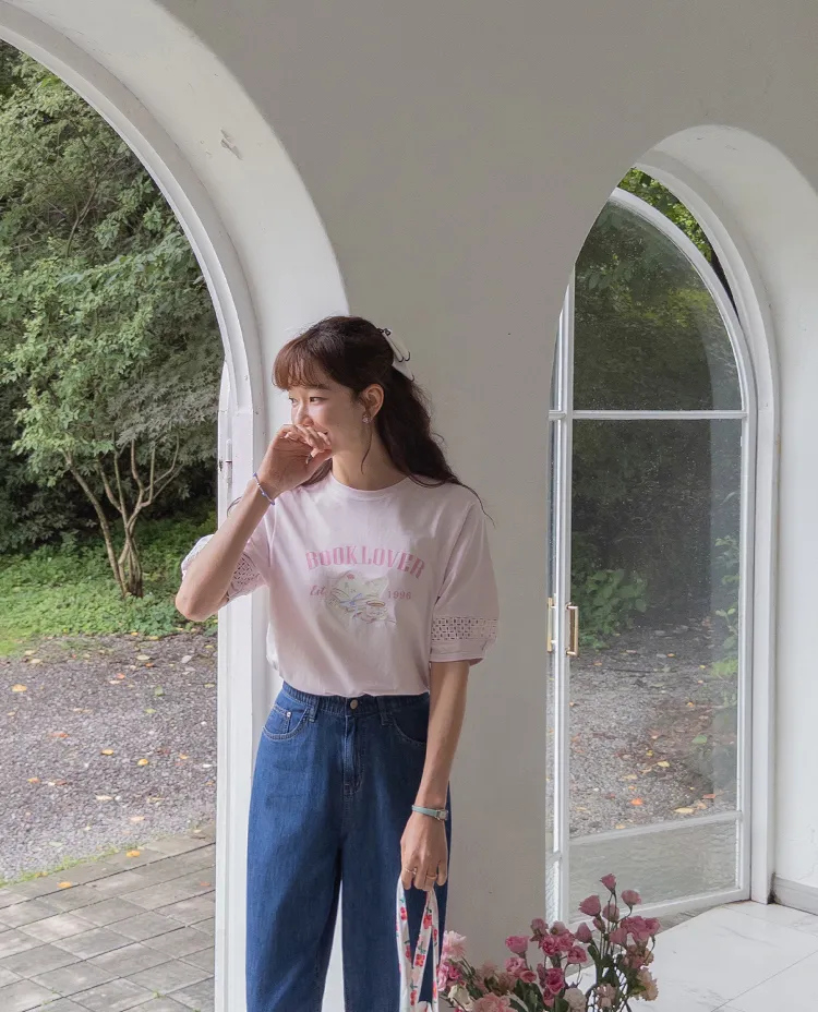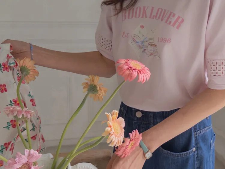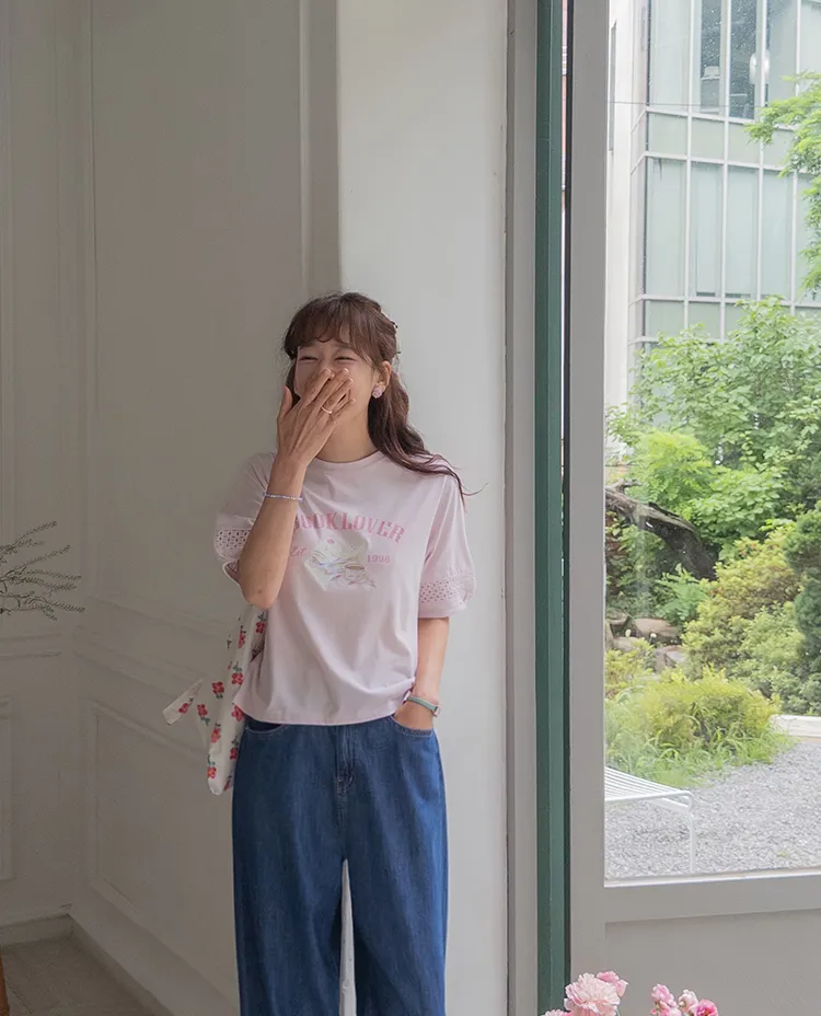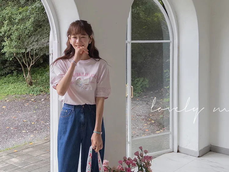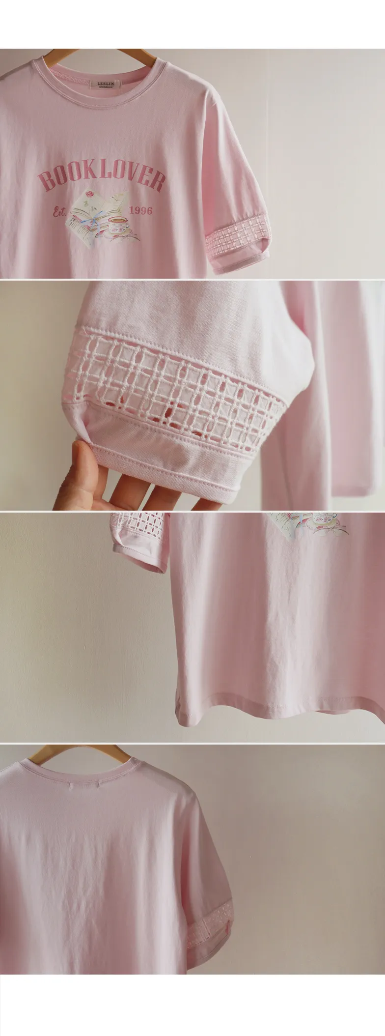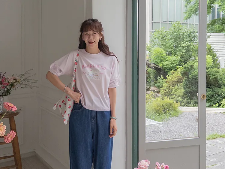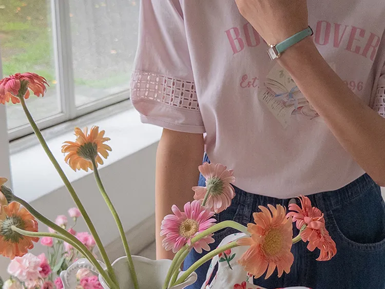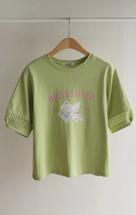 漂亮泡泡袖口鏤空花邊柔和印花穿搭上衣