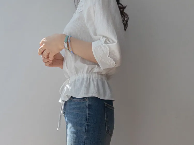 【浪漫的蕾絲上衣♥】 【荷葉邊、蕾絲、綁帶蝴蝶結可愛UP~】 【腰部有綁帶蝴蝶結,修身版型! 】 【純棉材質】
