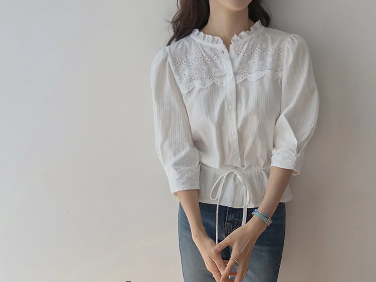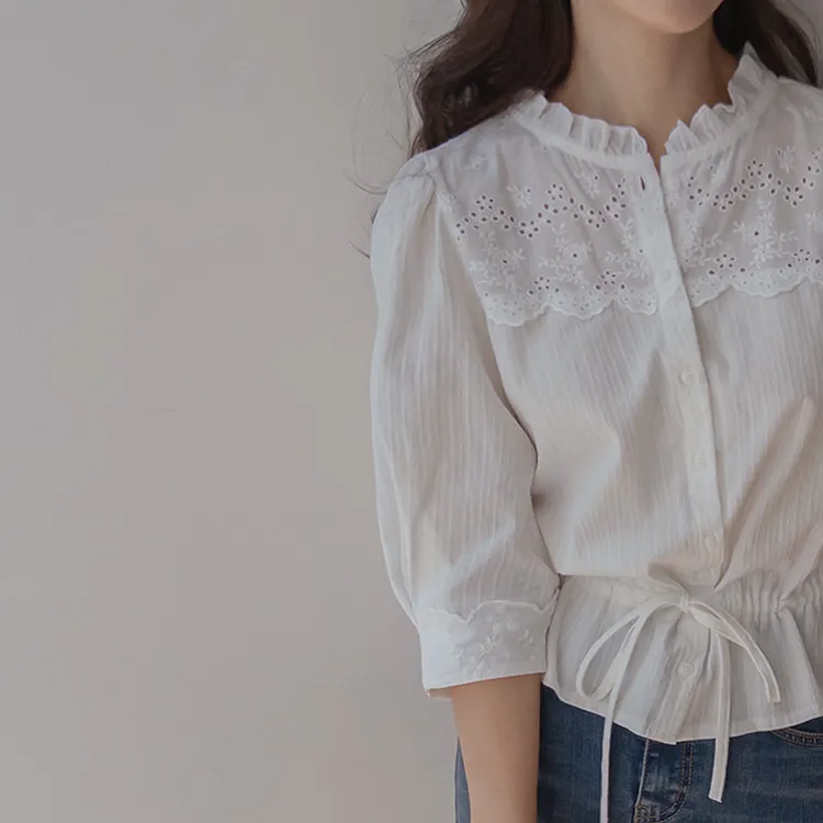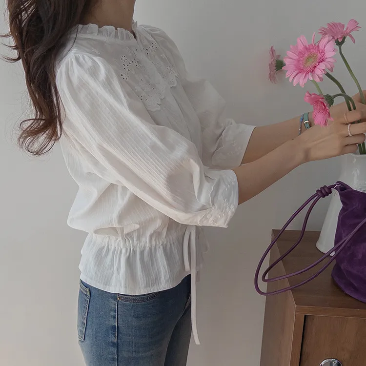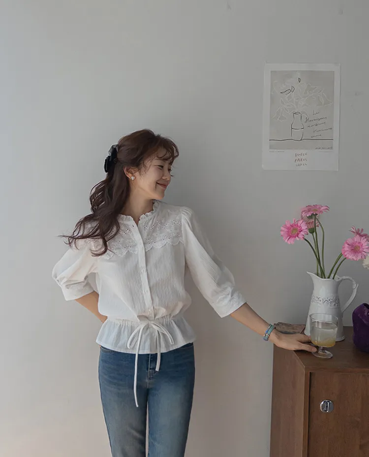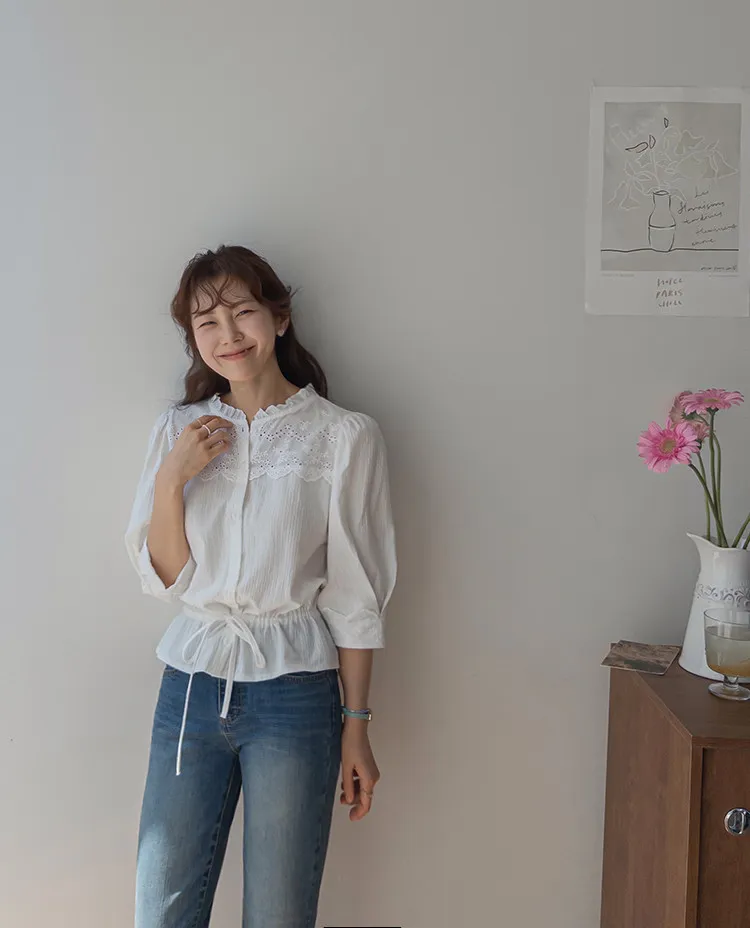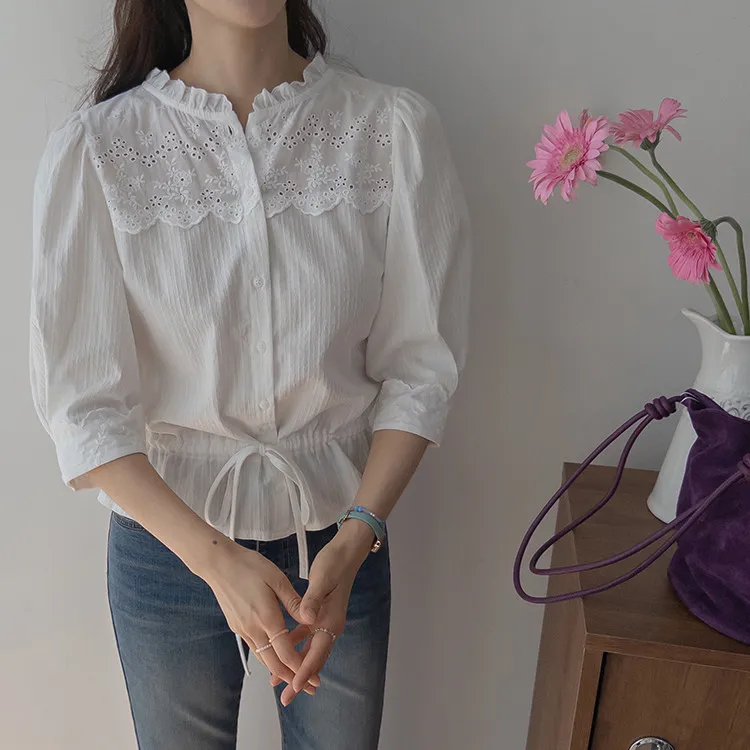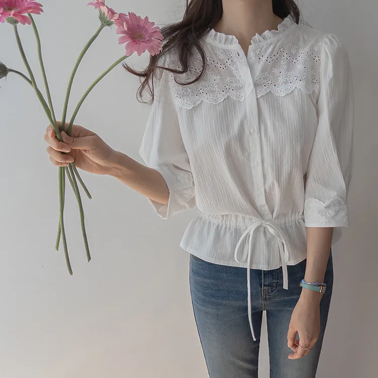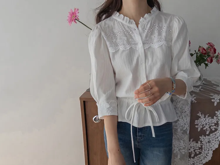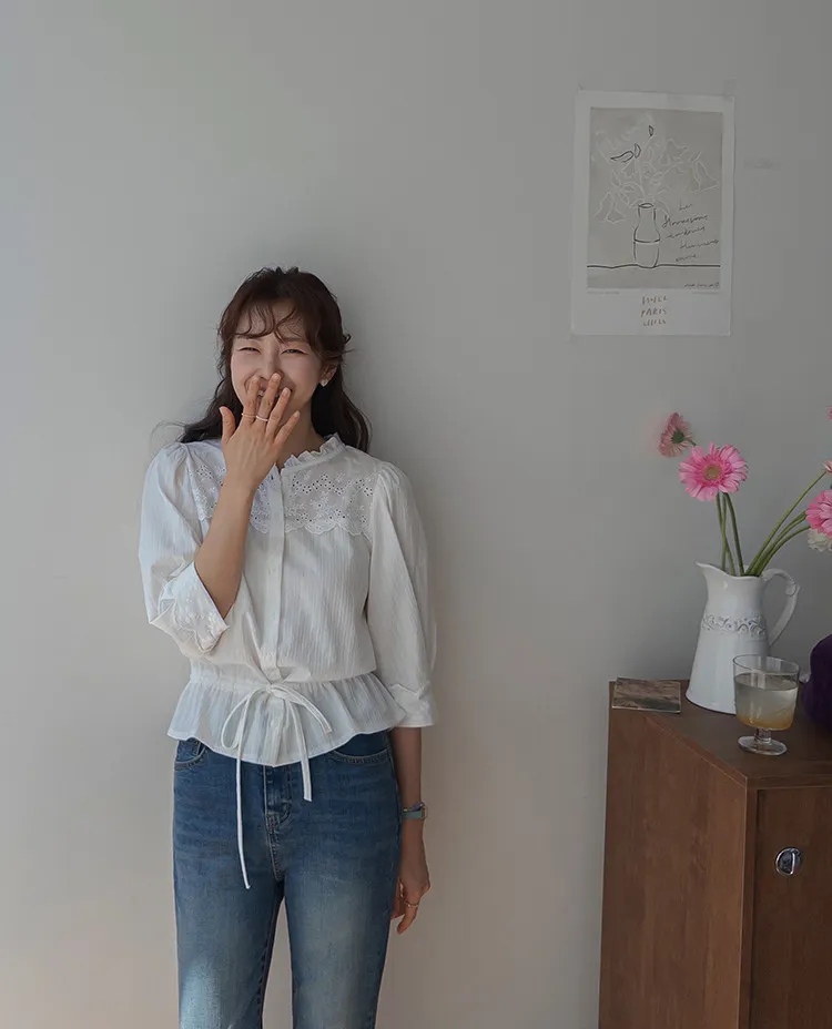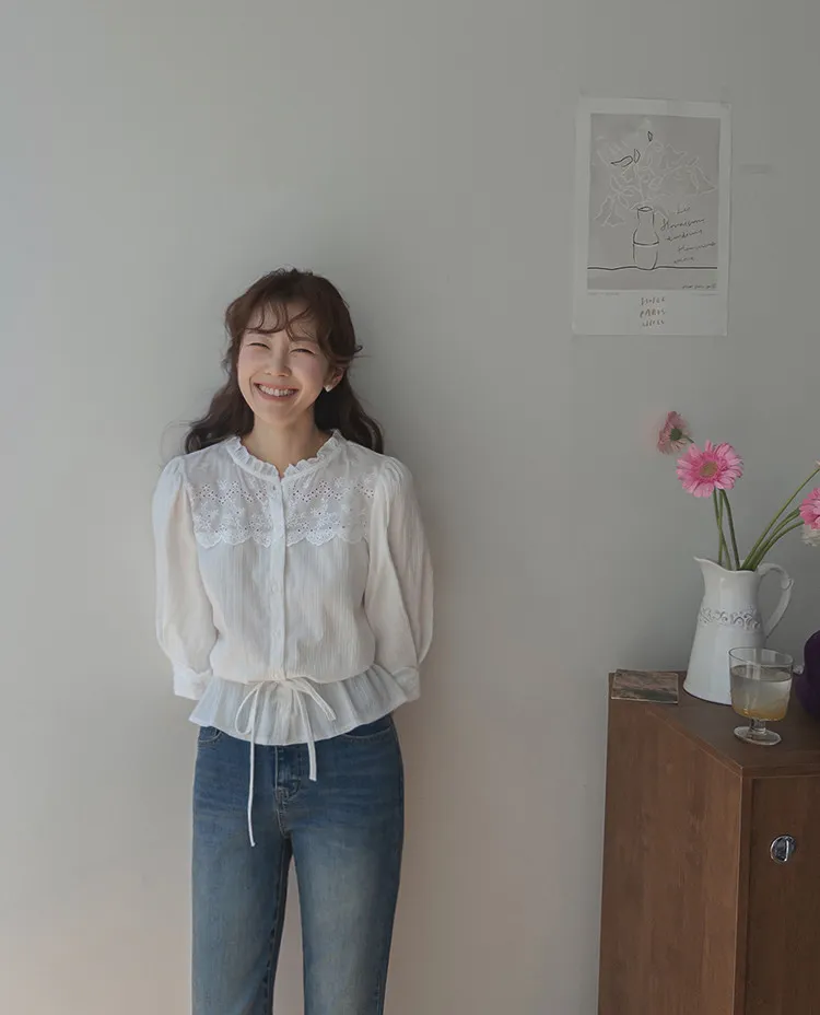 浪漫荷葉摺邊蕾絲花朵綁帶收腰排扣上衣