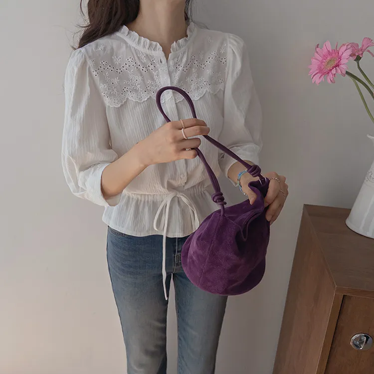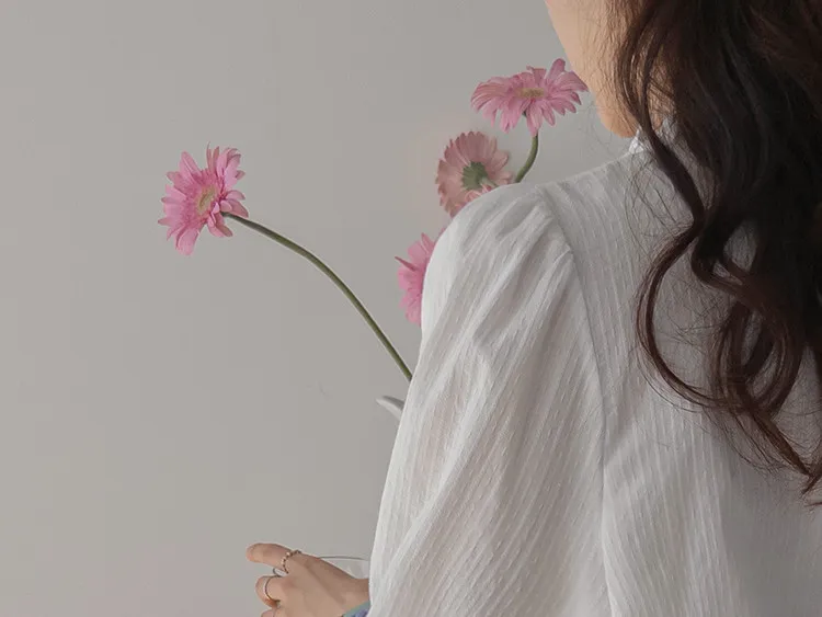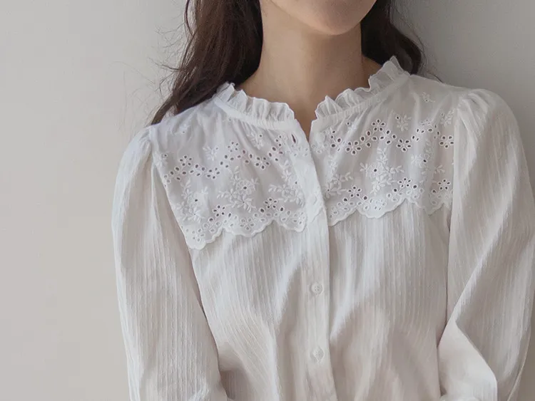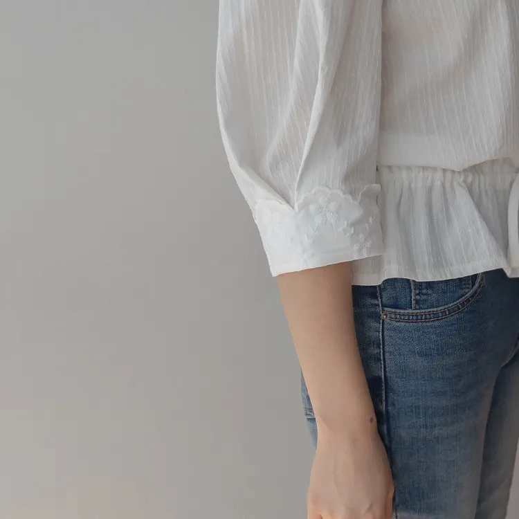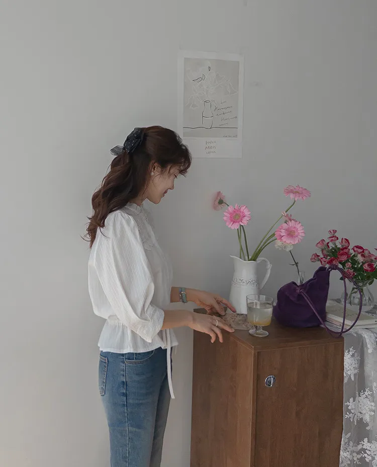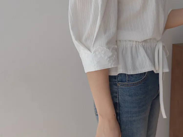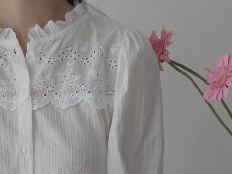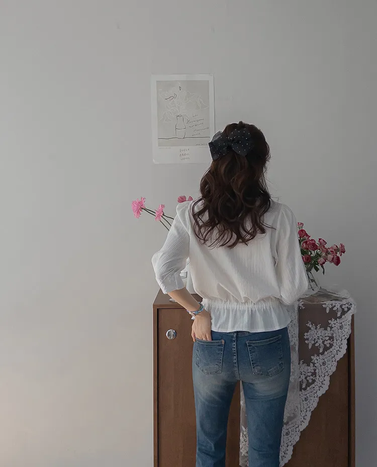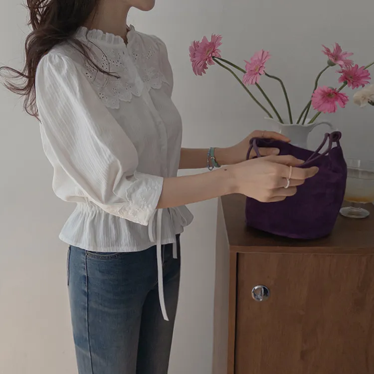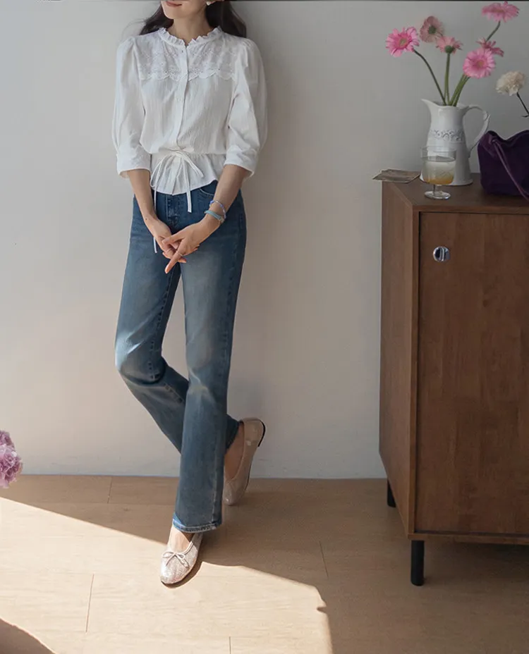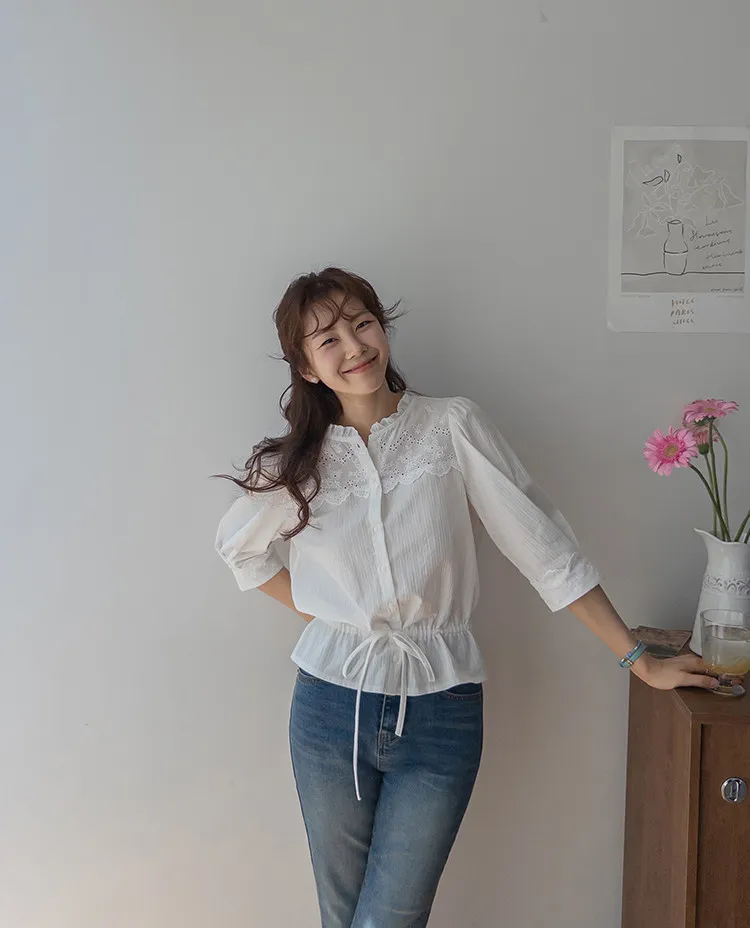 浪漫荷葉摺邊蕾絲花朵綁帶收腰排扣上衣