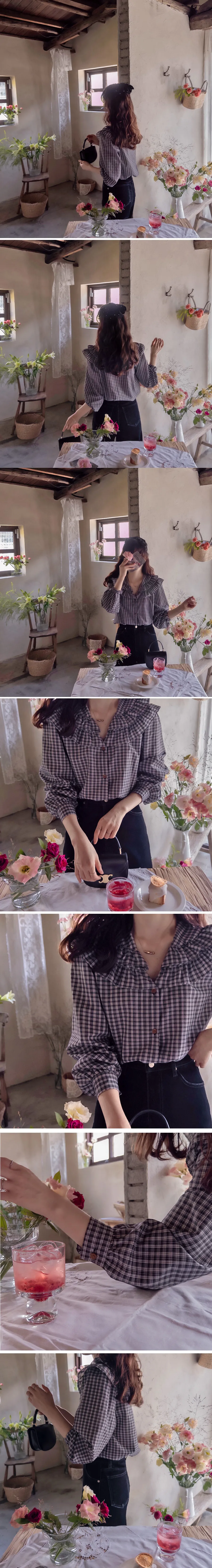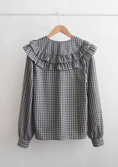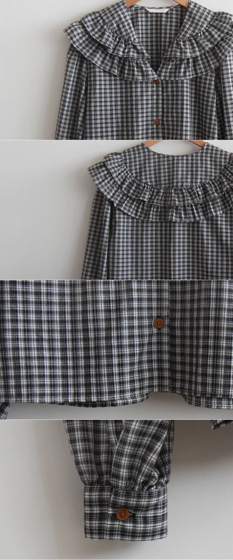 可愛雙層摺邊領格紋排扣上衣 黑色