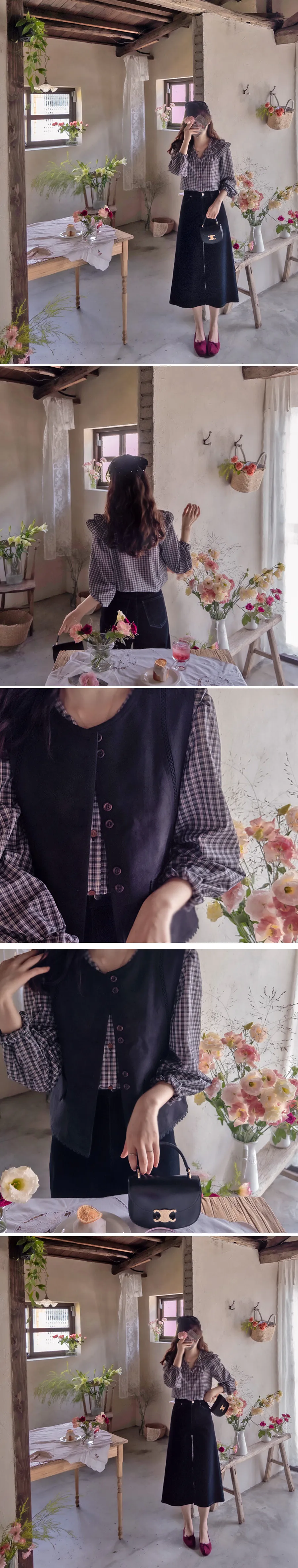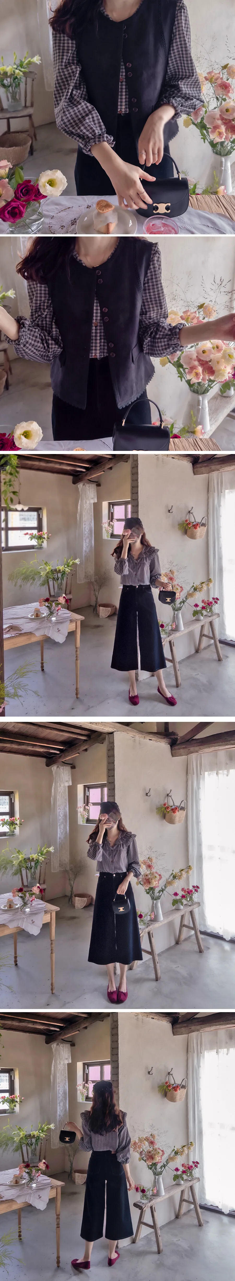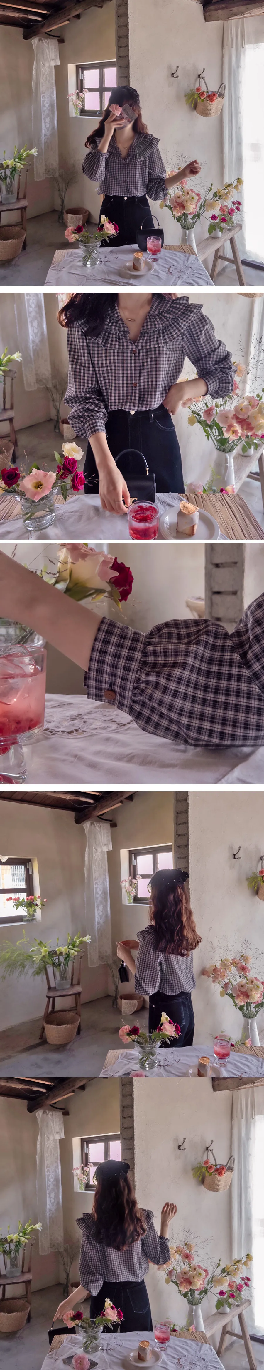 可愛雙層摺邊領格紋排扣上衣 黑色