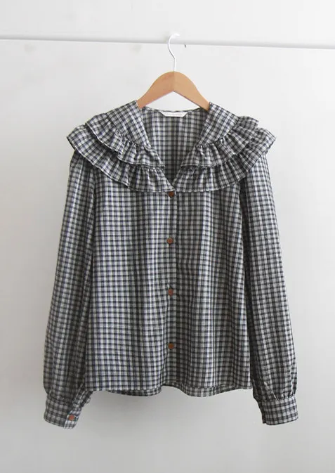 可愛雙層摺邊領格紋排扣上衣 深藍色