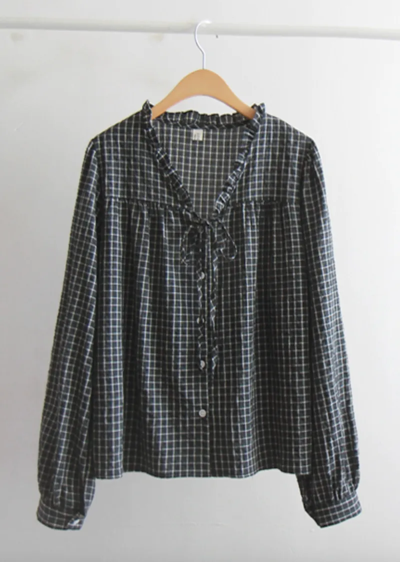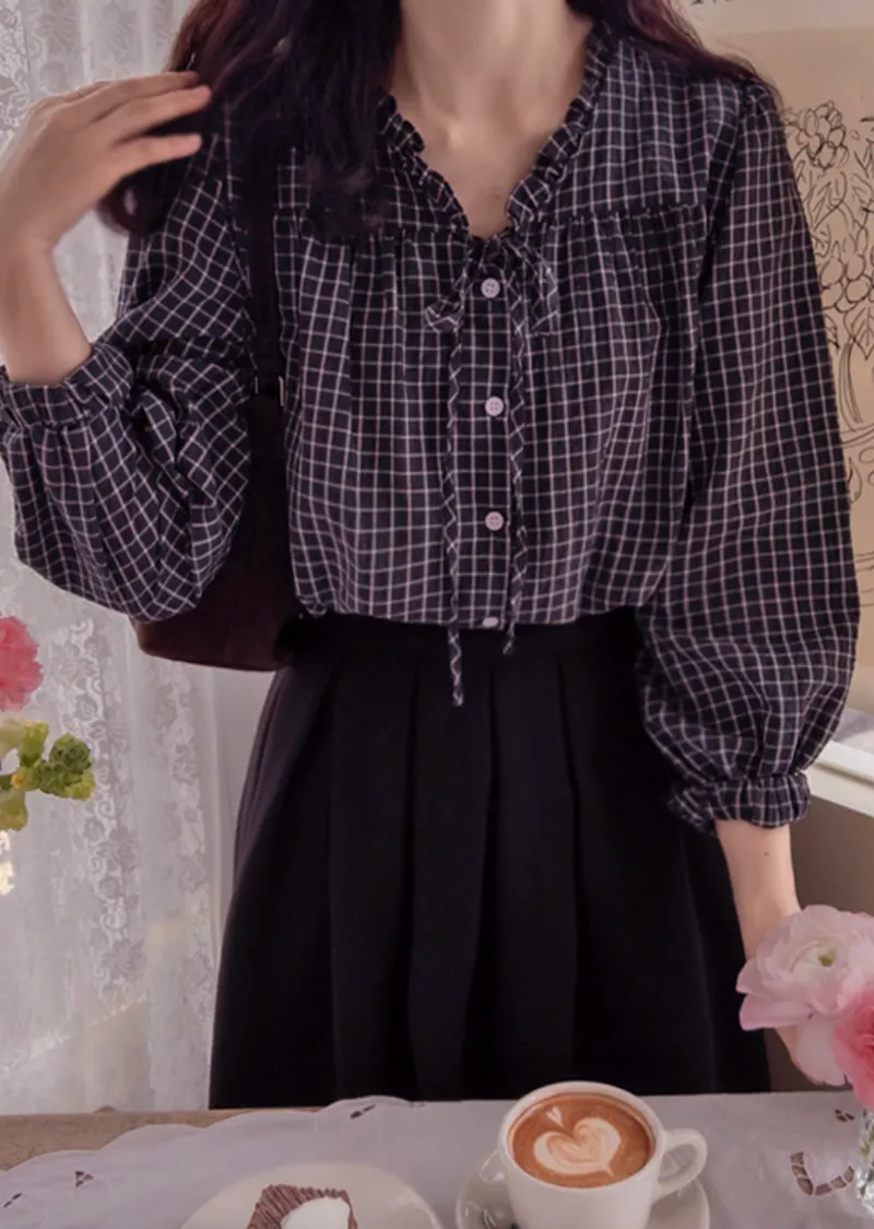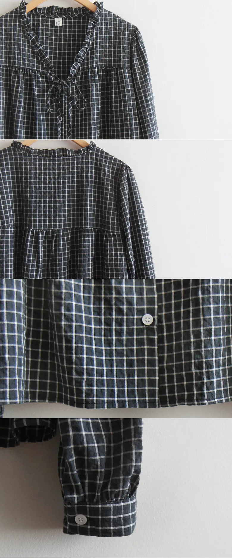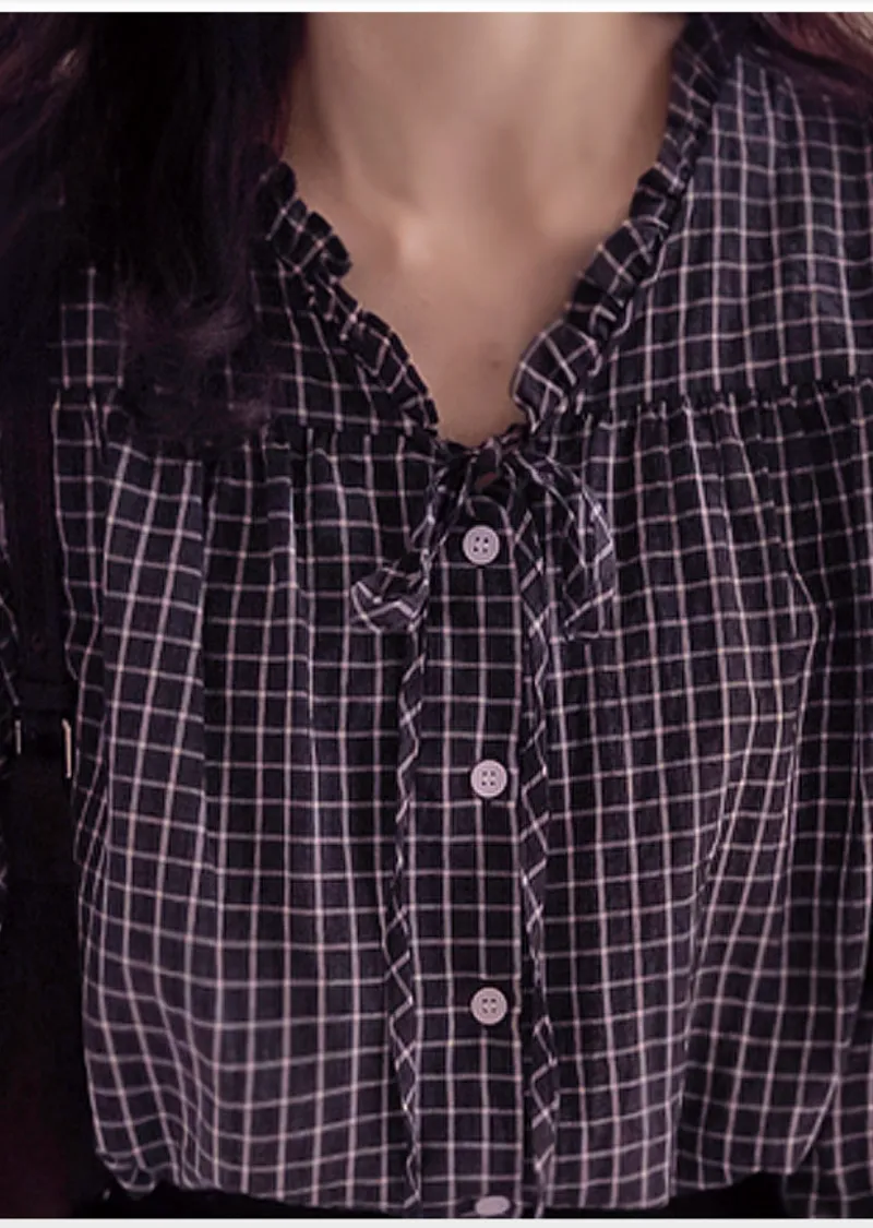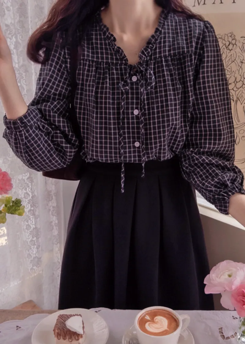 優雅領口褶皺綁帶設計格紋排扣上衣