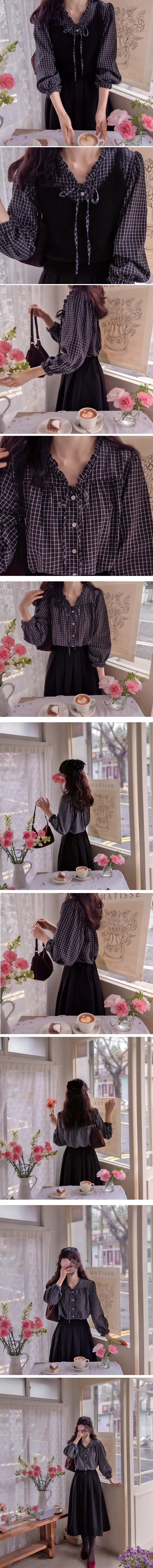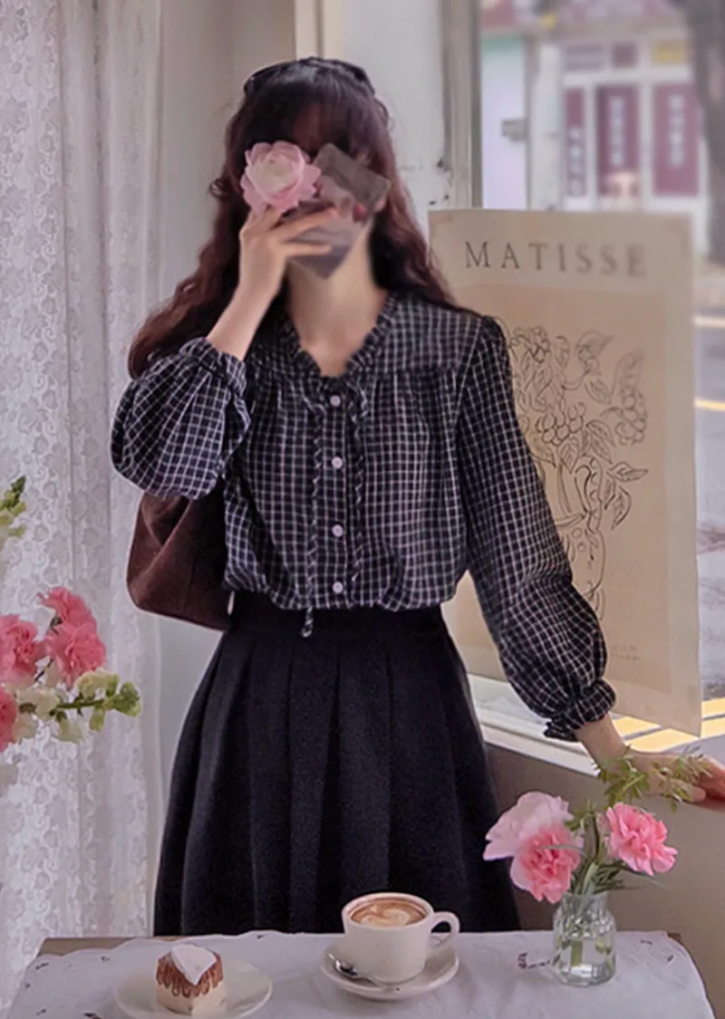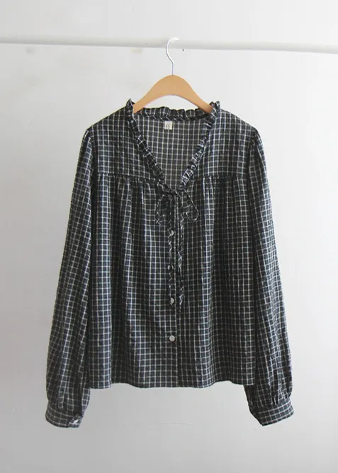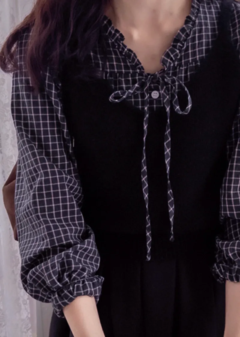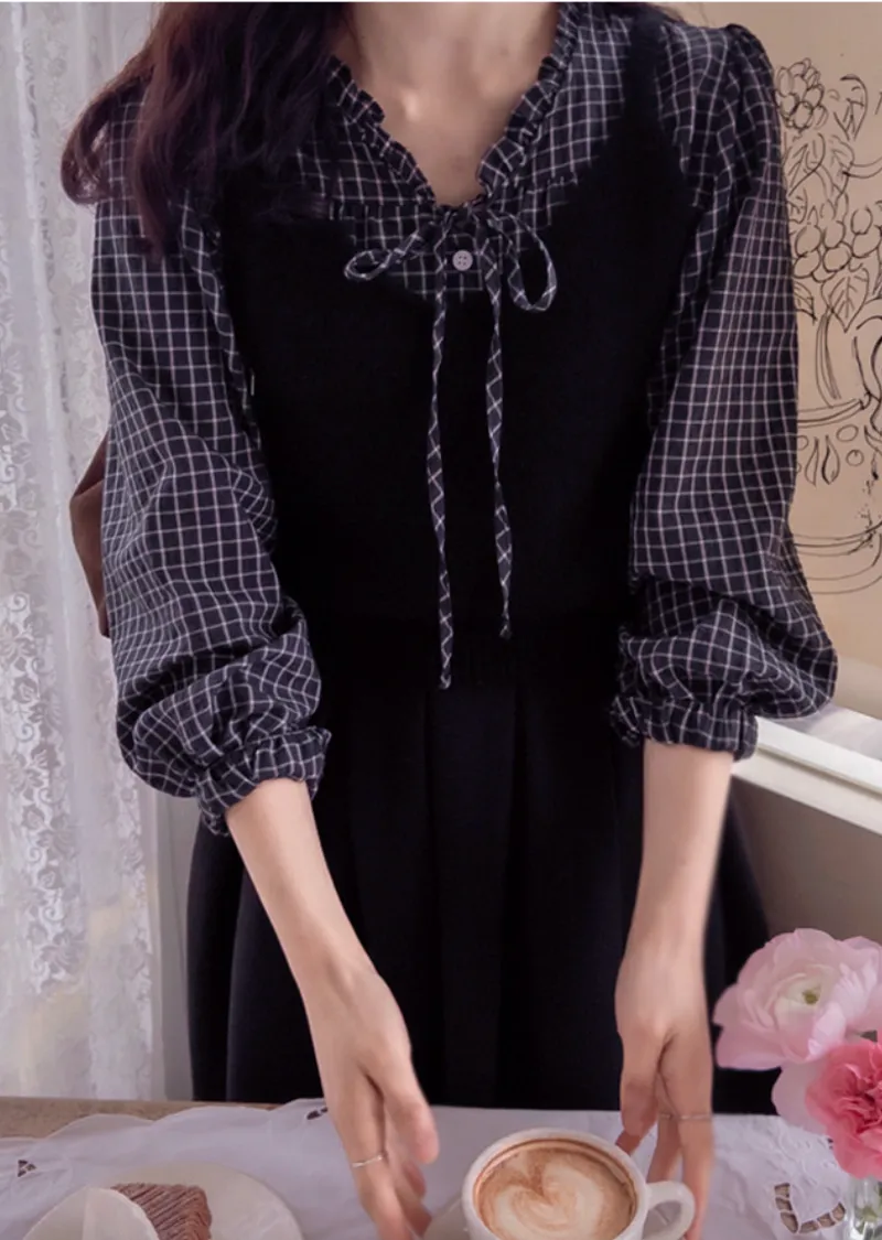 優雅領口褶皺綁帶設計格紋排扣上衣
