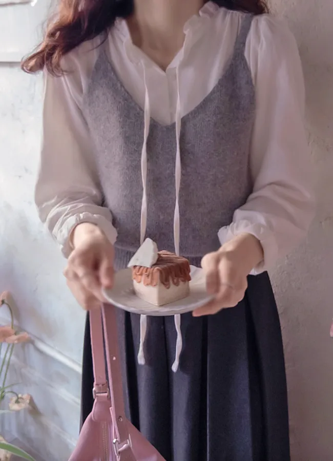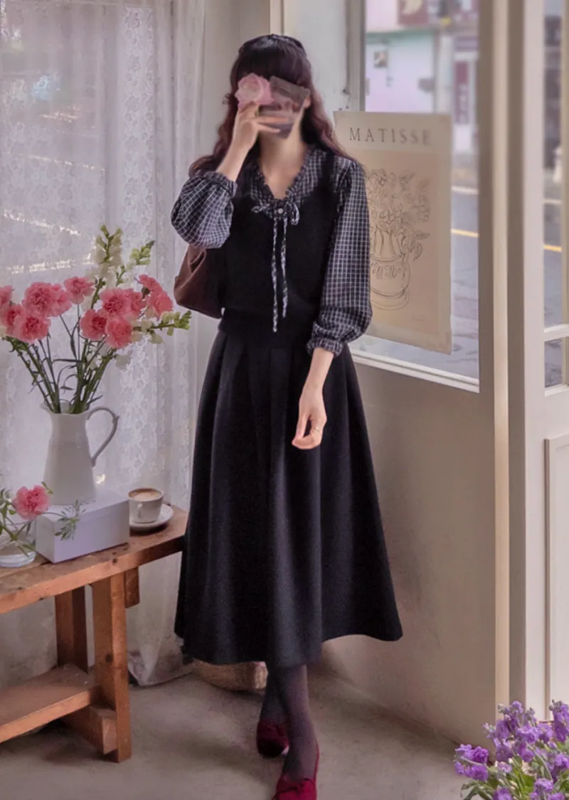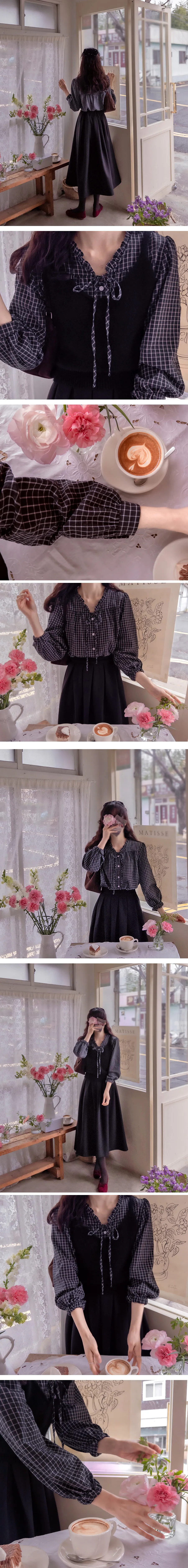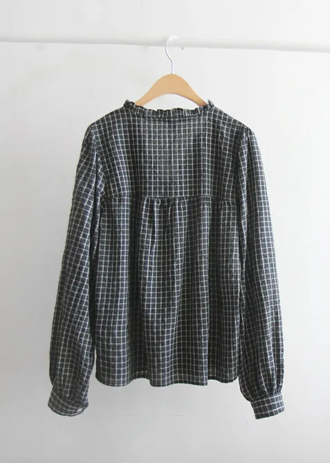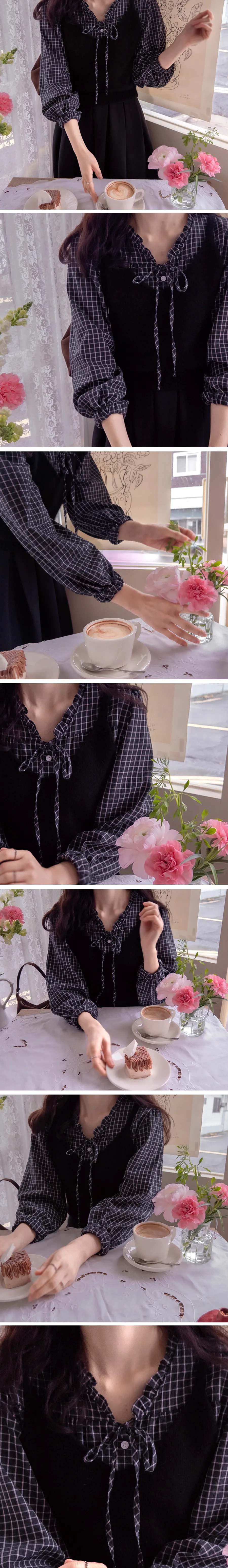 優雅領口褶皺綁帶設計格紋排扣上衣