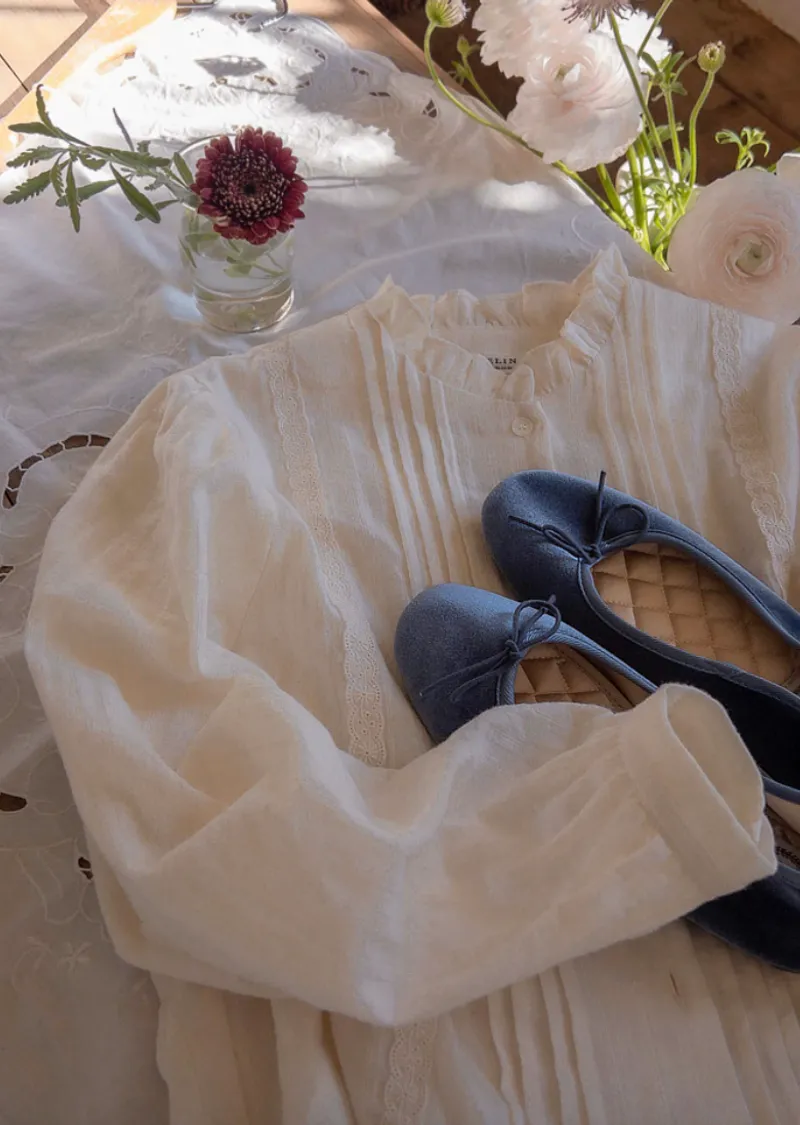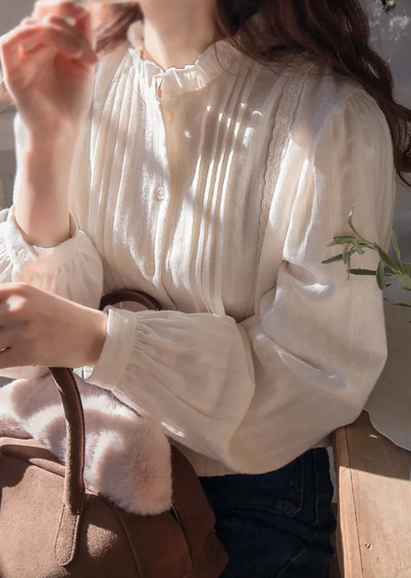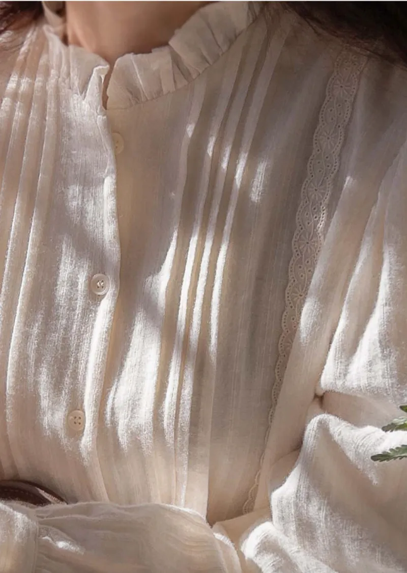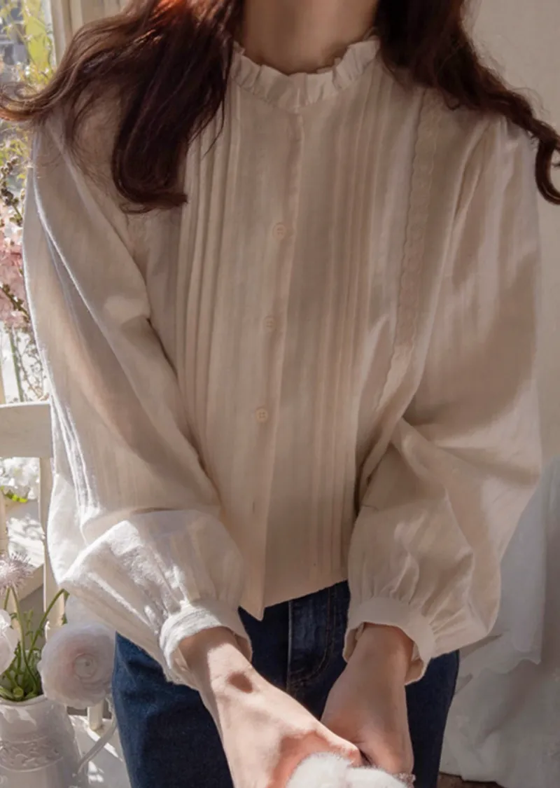 優雅褶皺領口蕾絲飾邊排扣上衣