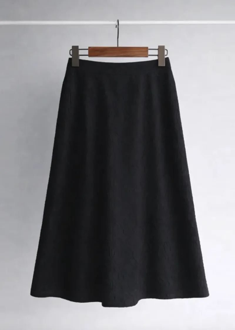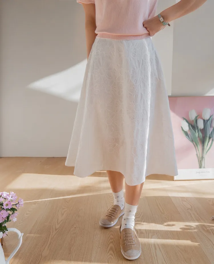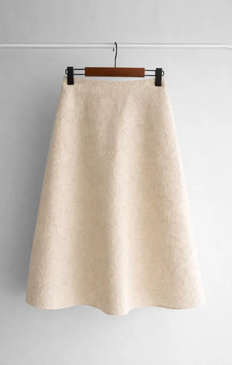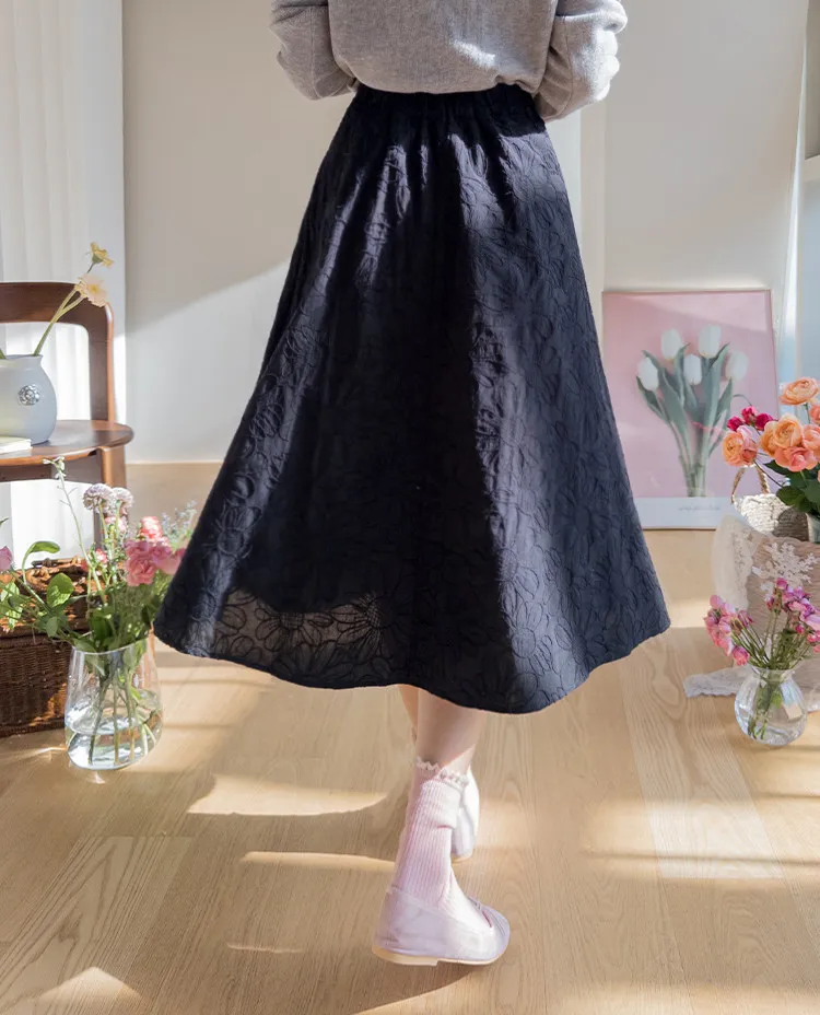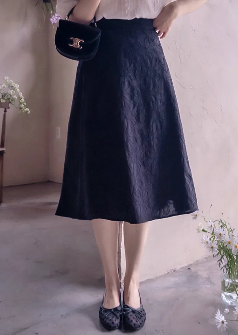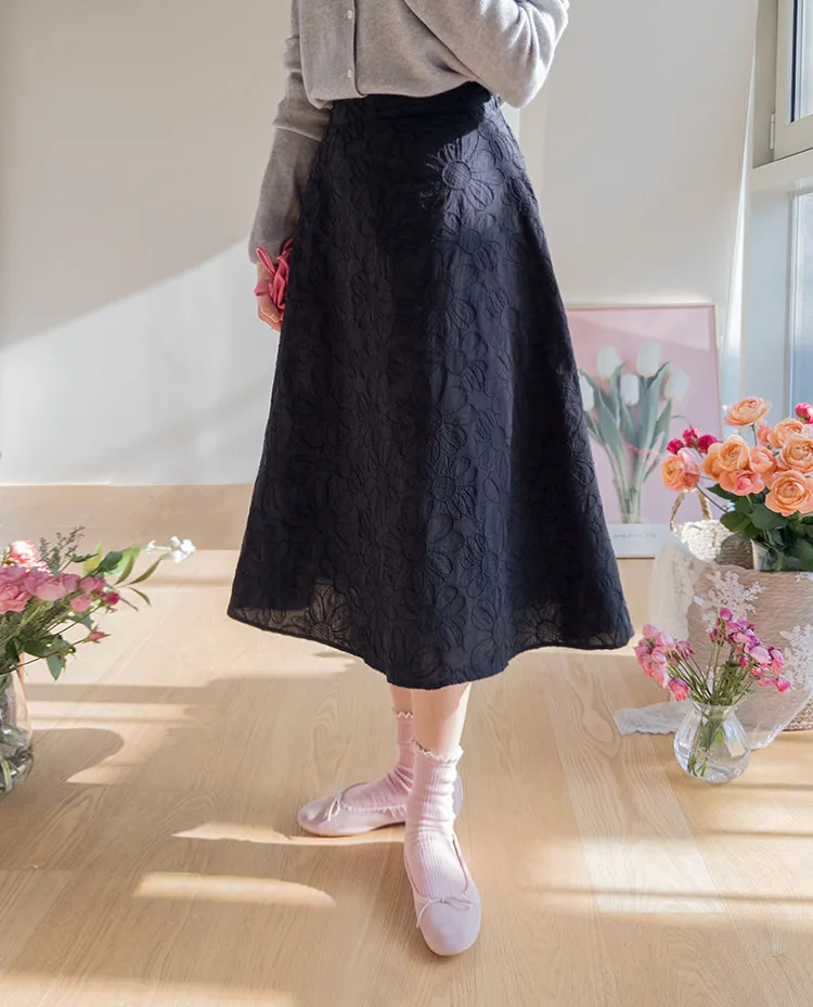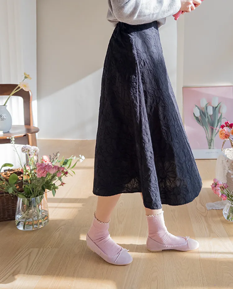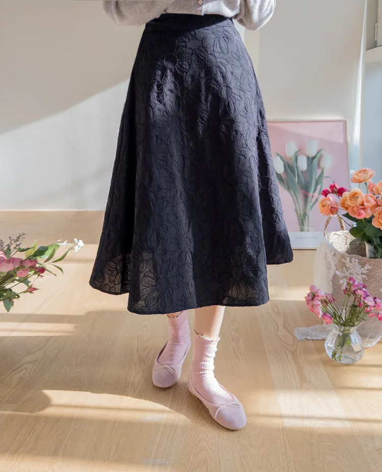 【奢華裙子♥,立體緹花圖案】【自然散開的傘擺裙擺】【顯瘦下半身效果】【舒適的後腰鬆緊帶】