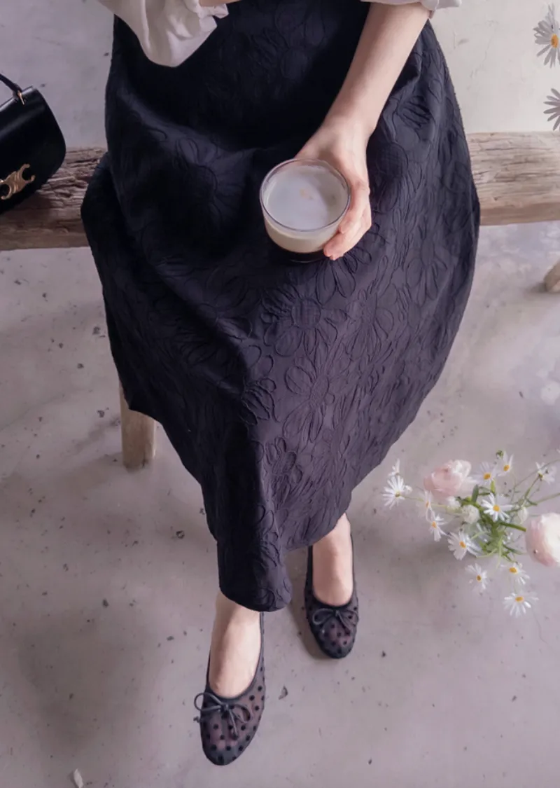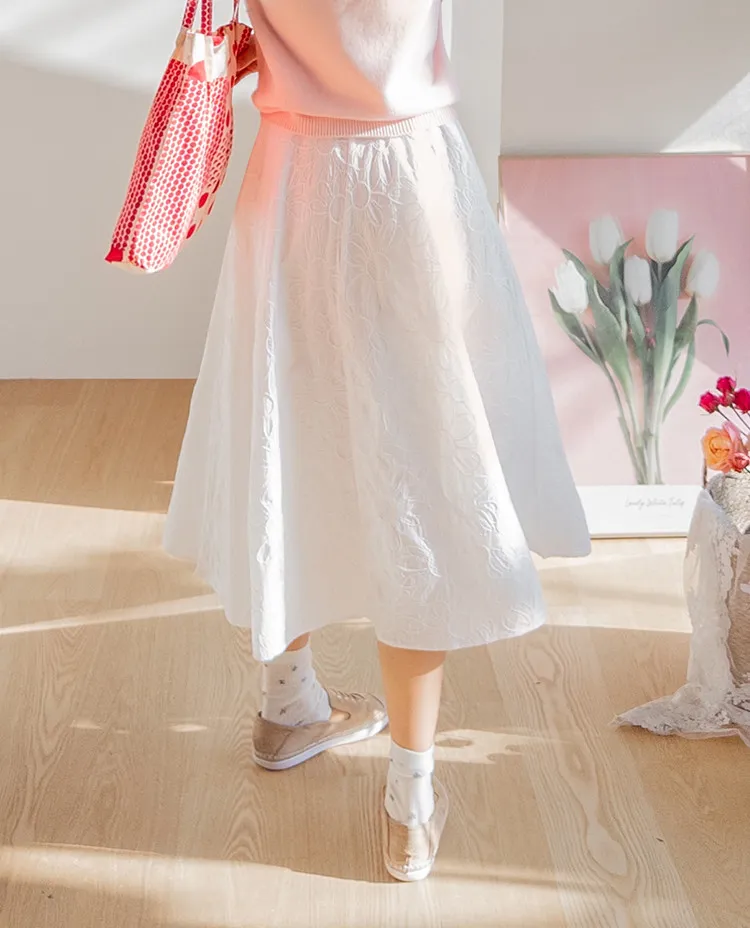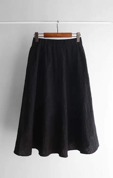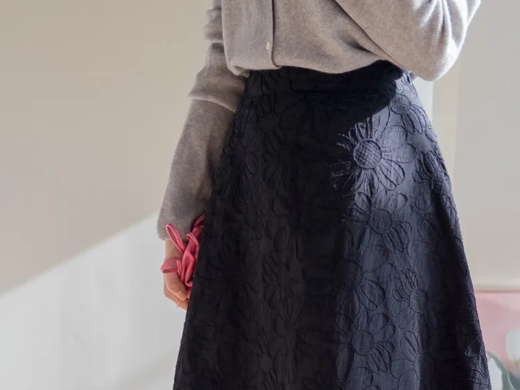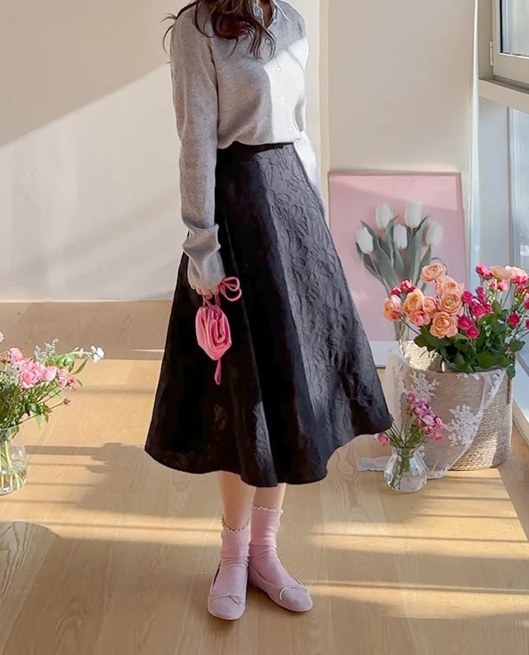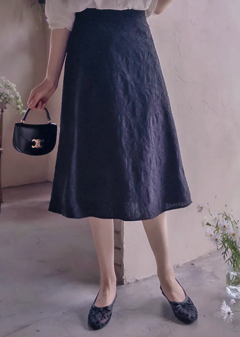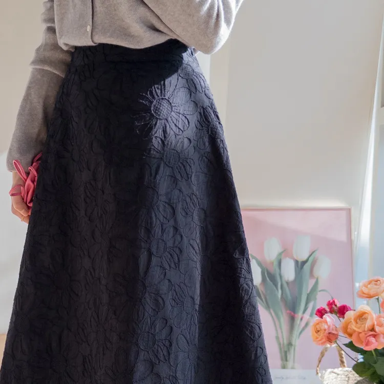 【奢華裙子♥,立體緹花圖案】【自然散開的傘擺裙擺】【顯瘦下半身效果】【舒適的後腰鬆緊帶】