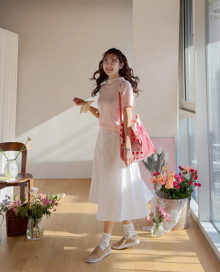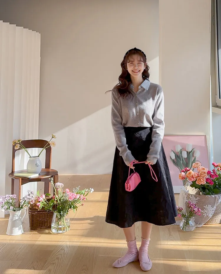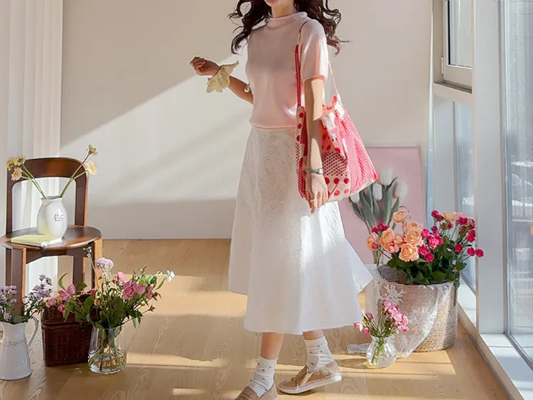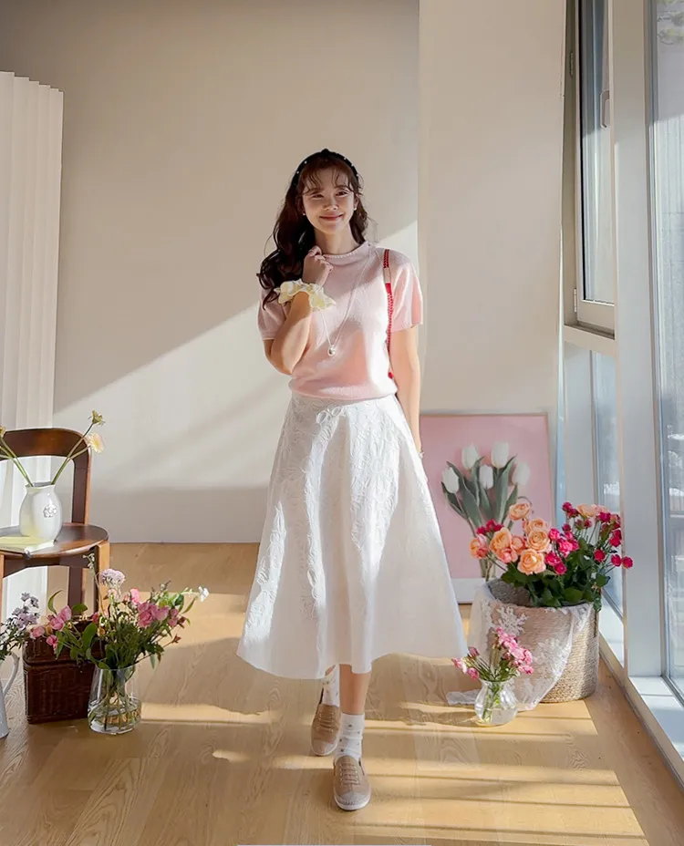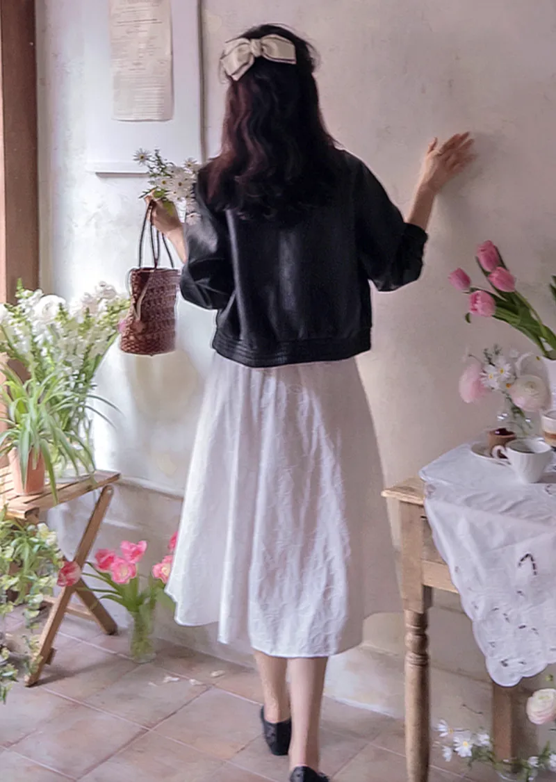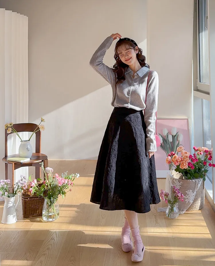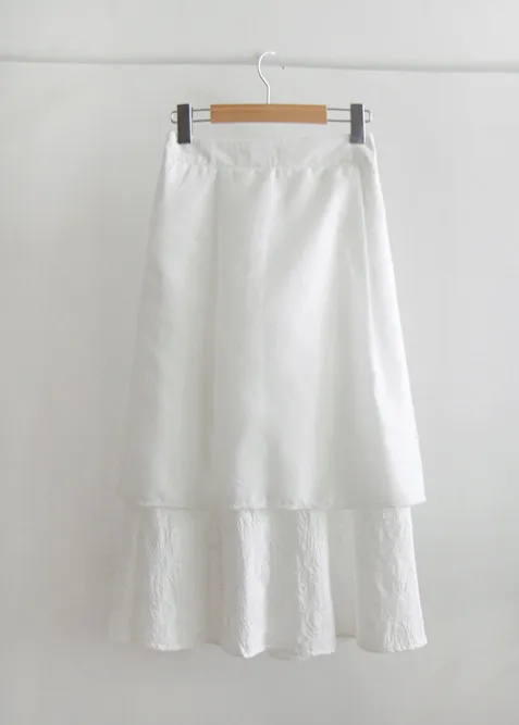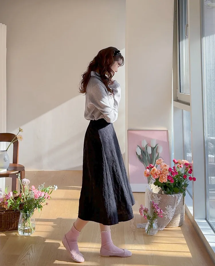 【奢華裙子♥,立體緹花圖案】【自然散開的傘擺裙擺】【顯瘦下半身效果】【舒適的後腰鬆緊帶】