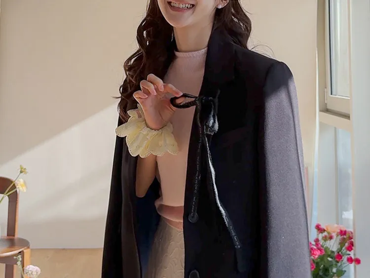 纖細精緻疊穿魅力上衣和領口及下擺側綁帶無袖上衣的套裝