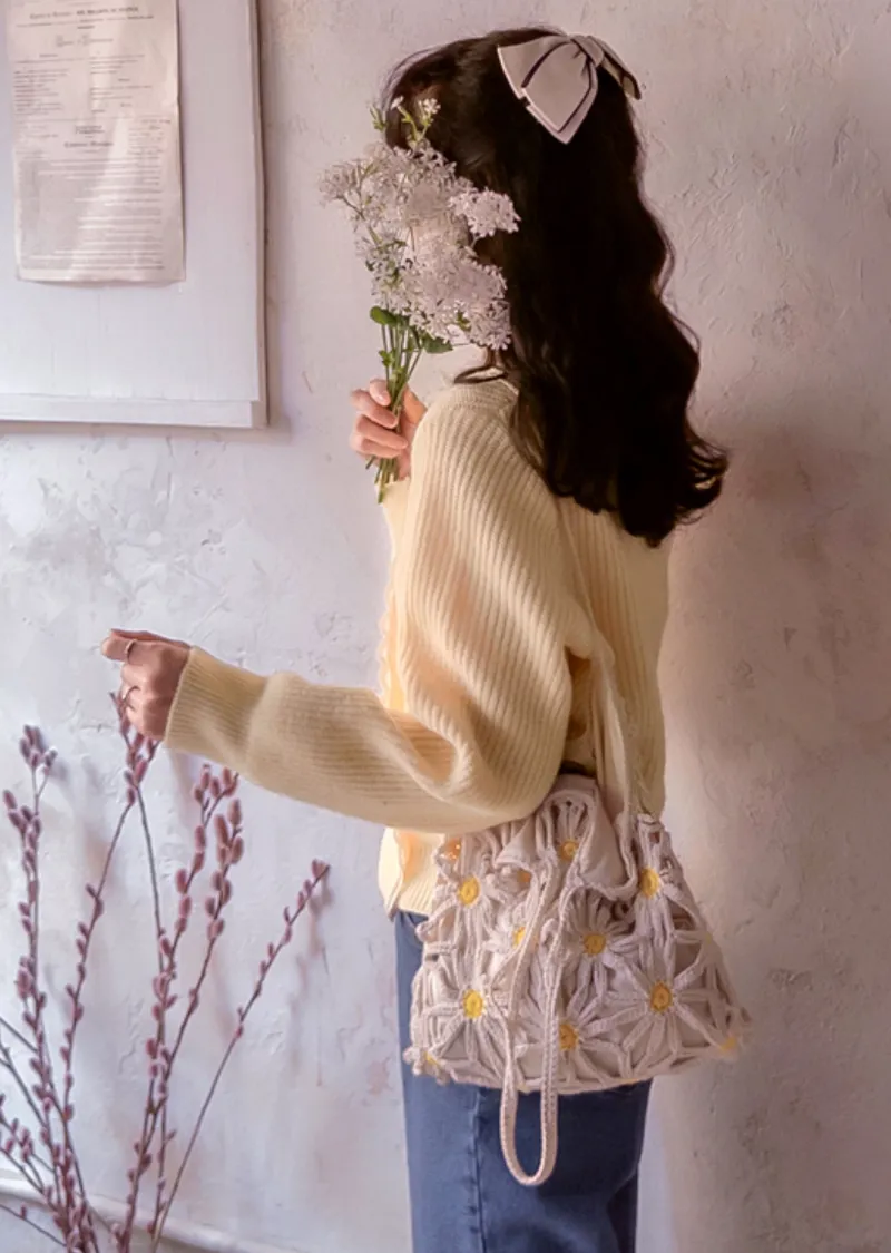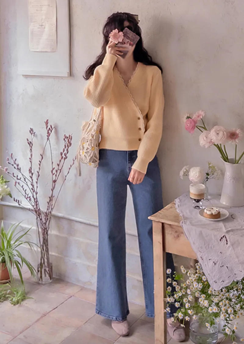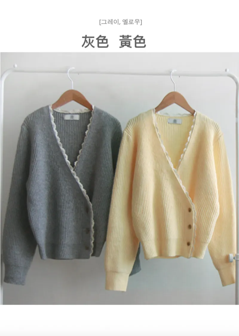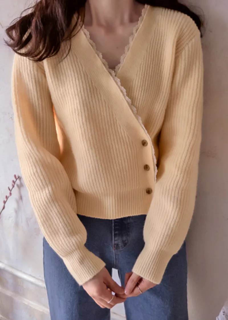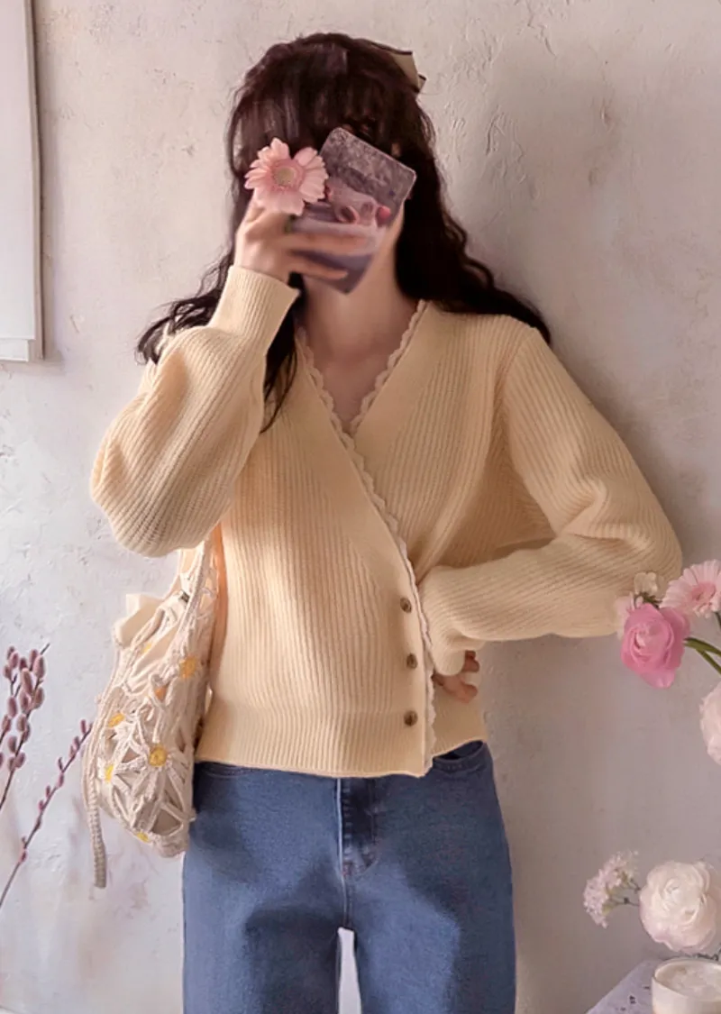 布料:6%羊毛,80%滌綸,6%腈綸,5%尼龍,3%氨綸 [蕾絲配色:65%棉,35%尼龍]【春季新品】【春意盎然的彩色針織衫】【波浪形蕾絲配色營造甜美氛圍】【鈕扣搭配裹身設計,盡顯精緻優雅】【推薦這款裹身針織衫,輕鬆打造優雅造型,提升您的時尚品味】