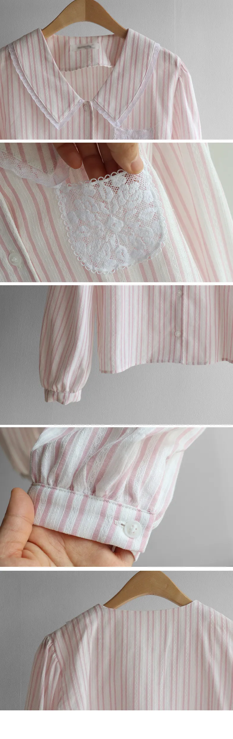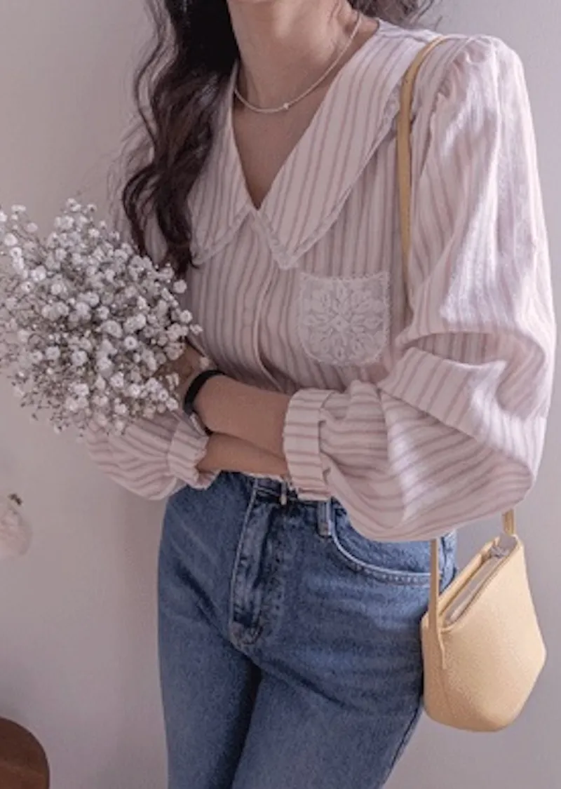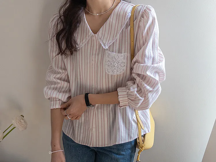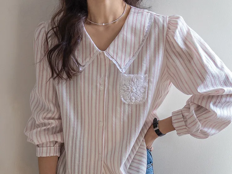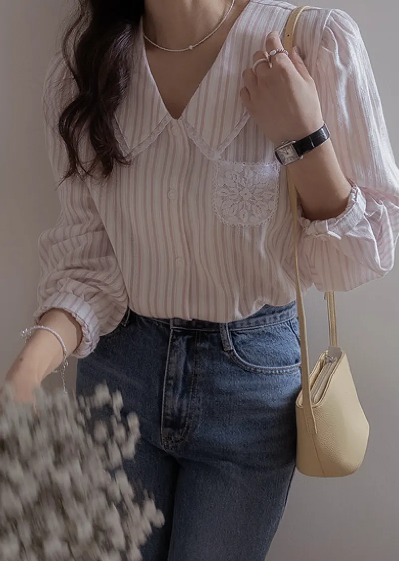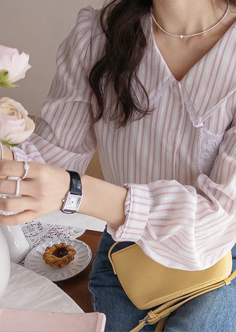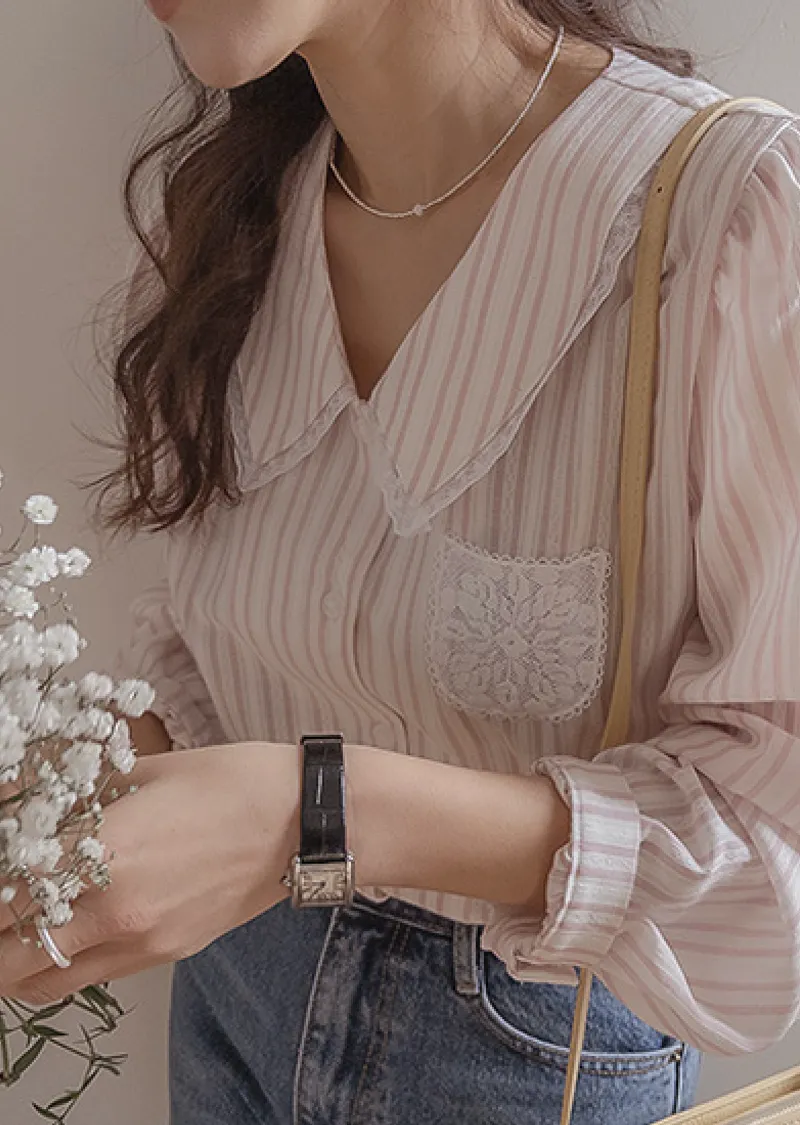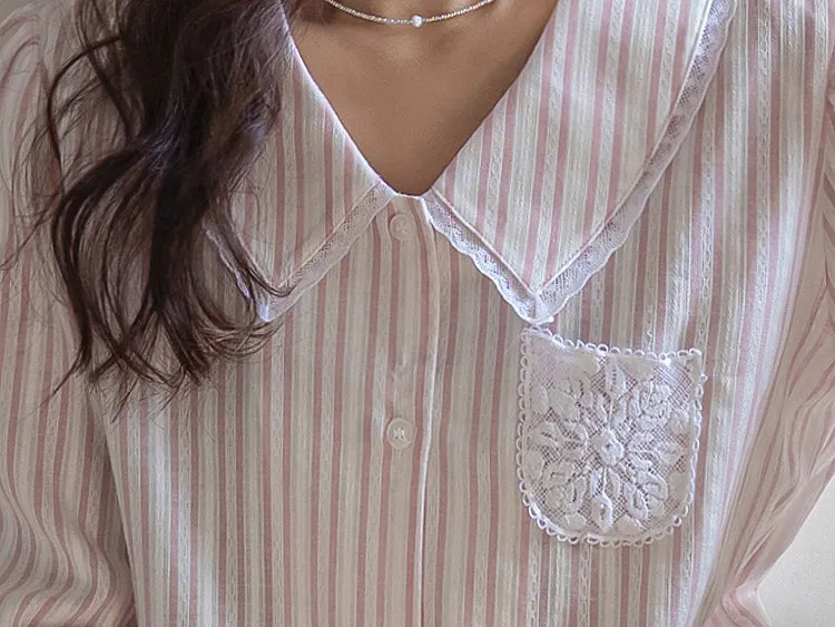 精緻蕾絲花邊領口襯邊點綴蕾絲刺繡口袋排扣上衣 條紋款/純色款