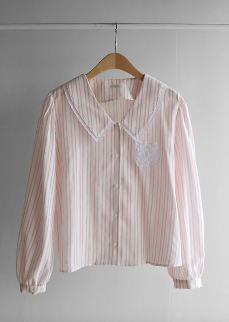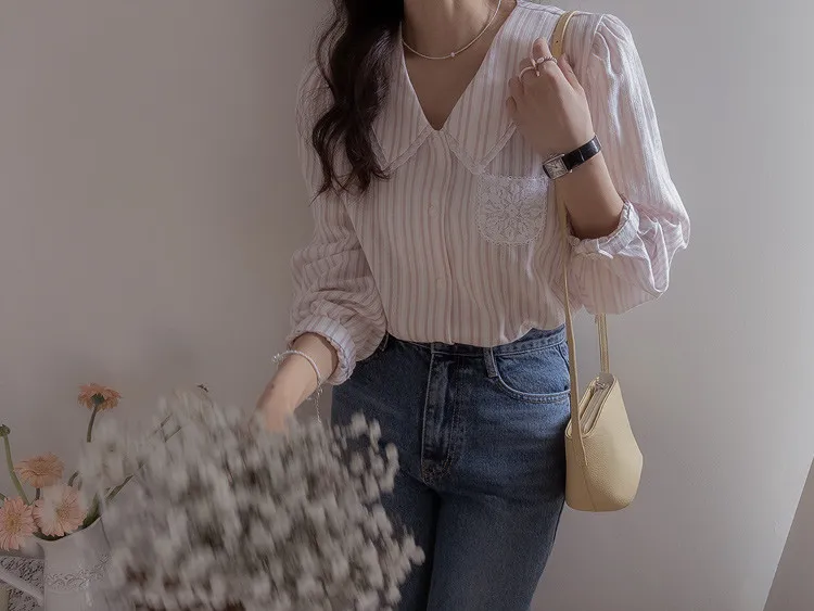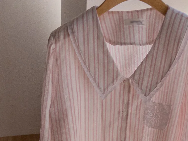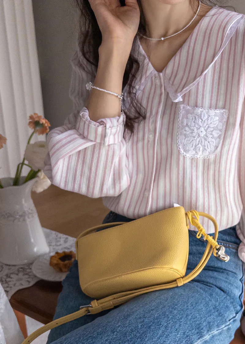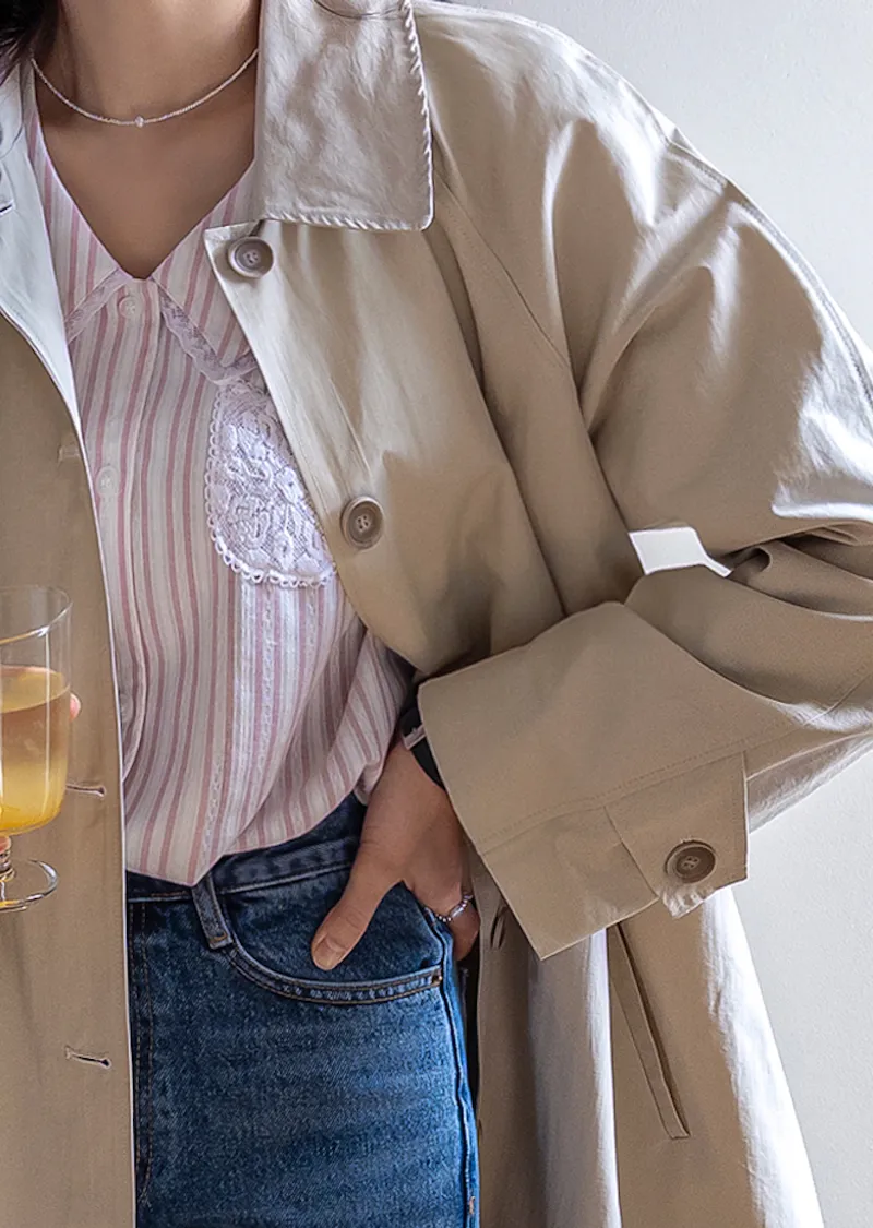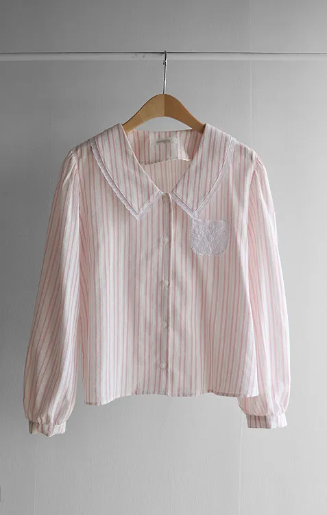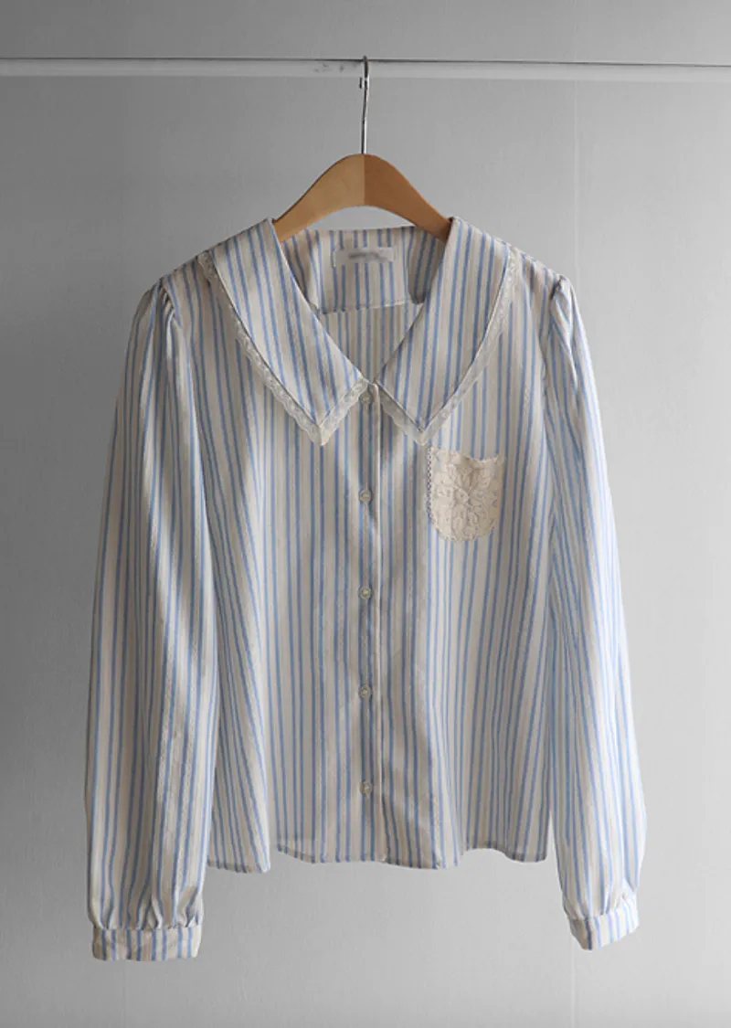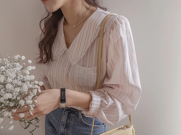 精緻蕾絲花邊領口襯邊點綴蕾絲刺繡口袋排扣上衣 條紋款/純色款