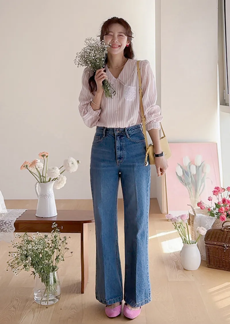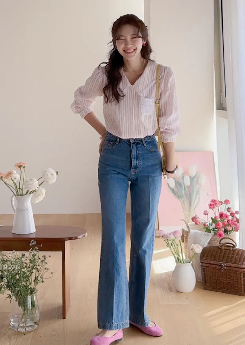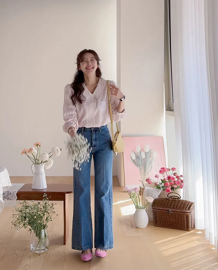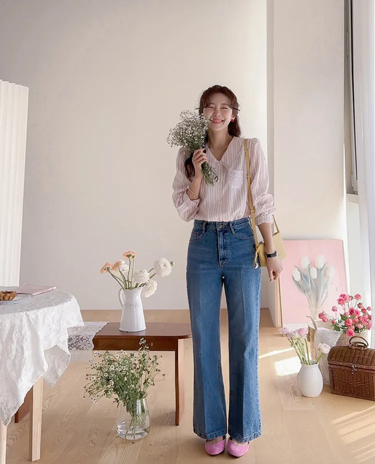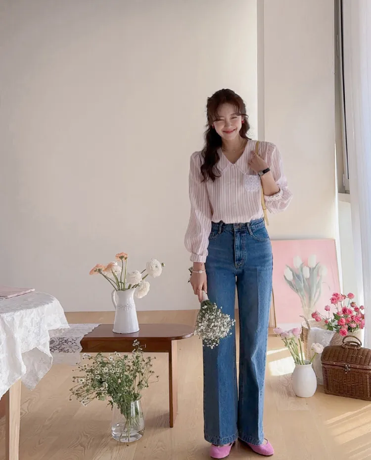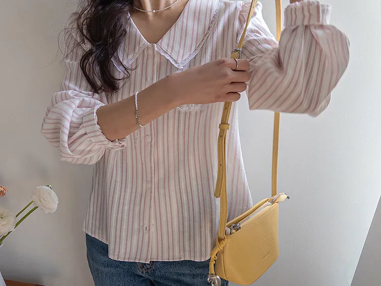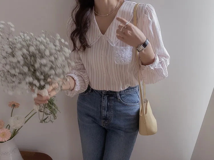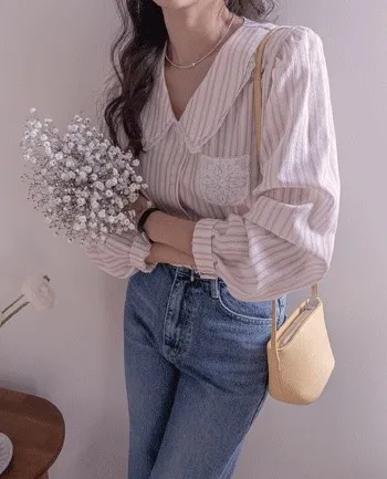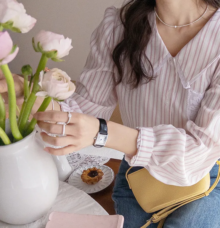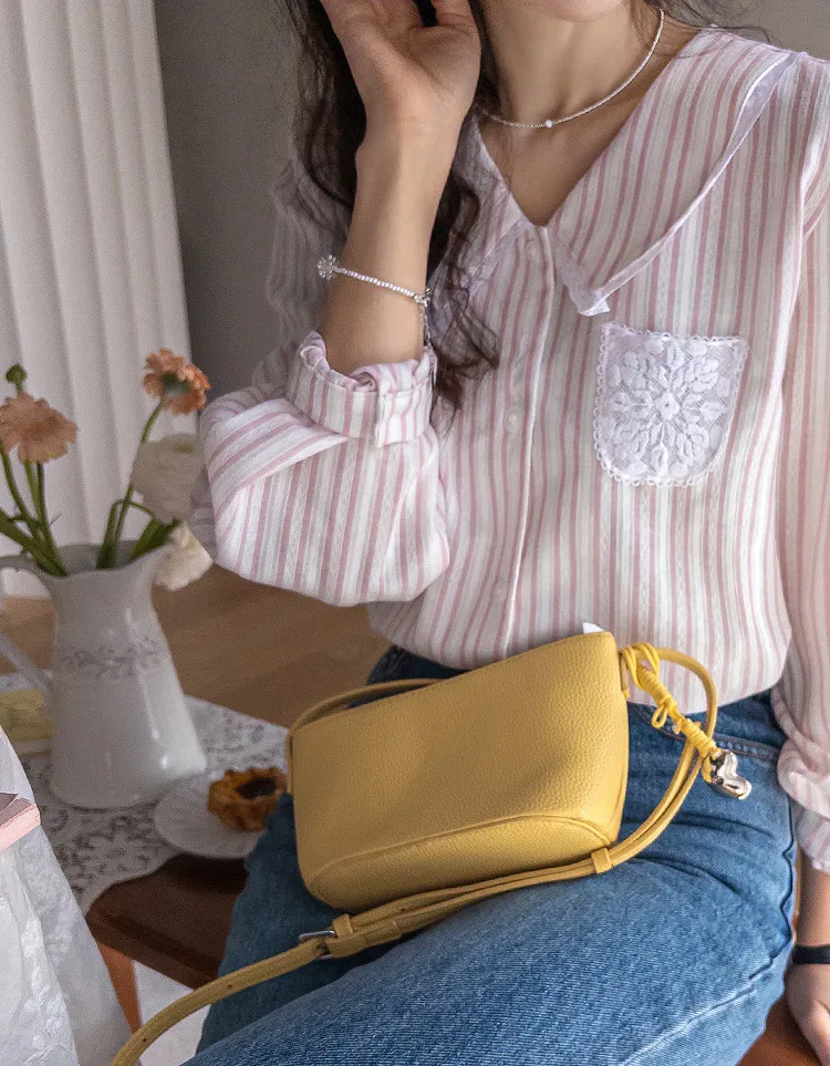 精緻蕾絲花邊領口襯邊點綴蕾絲刺繡口袋排扣上衣 條紋款/純色款