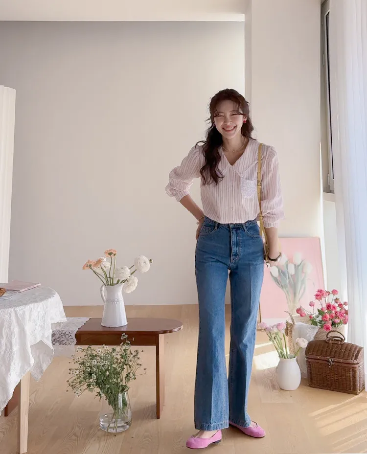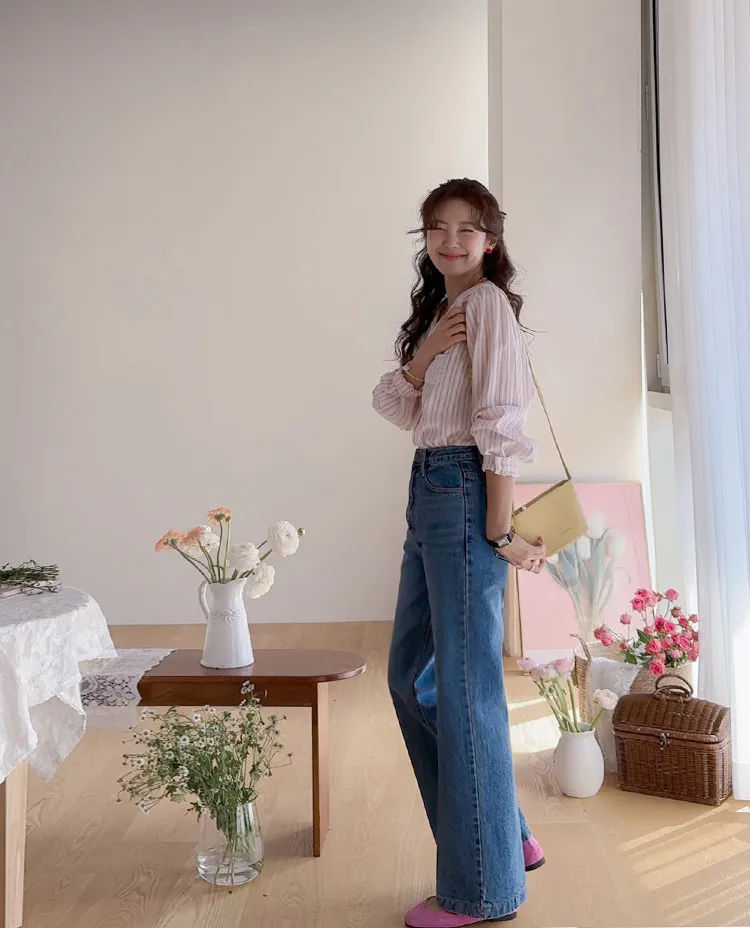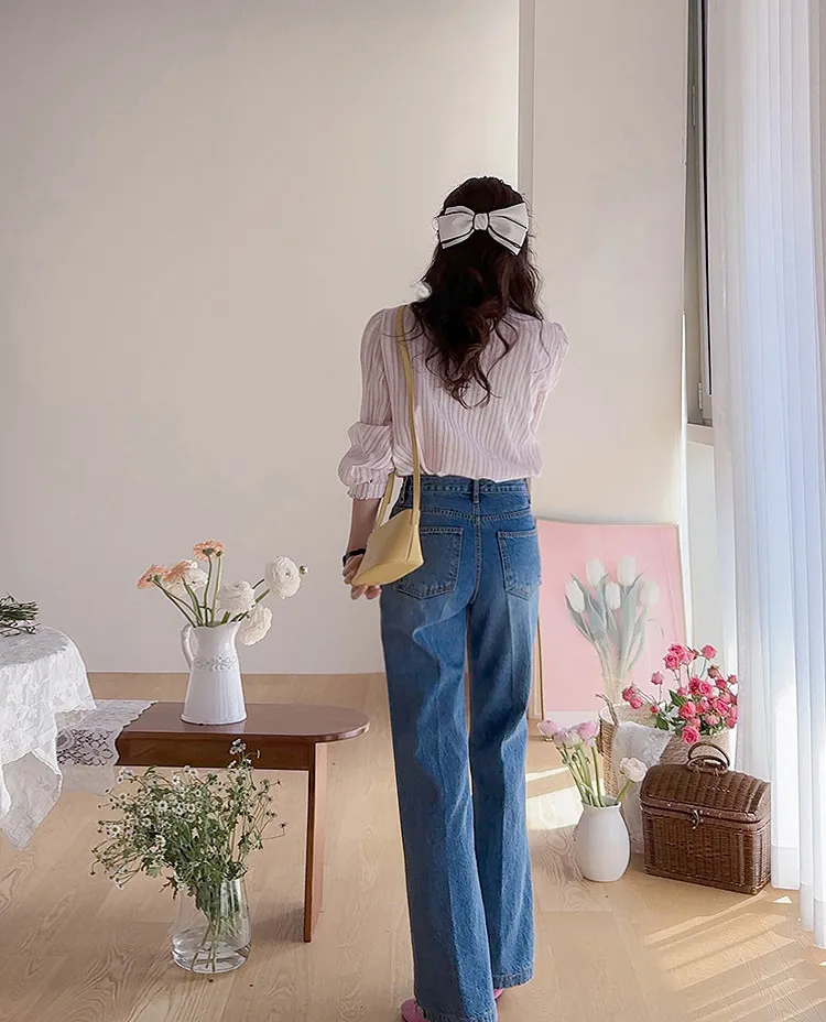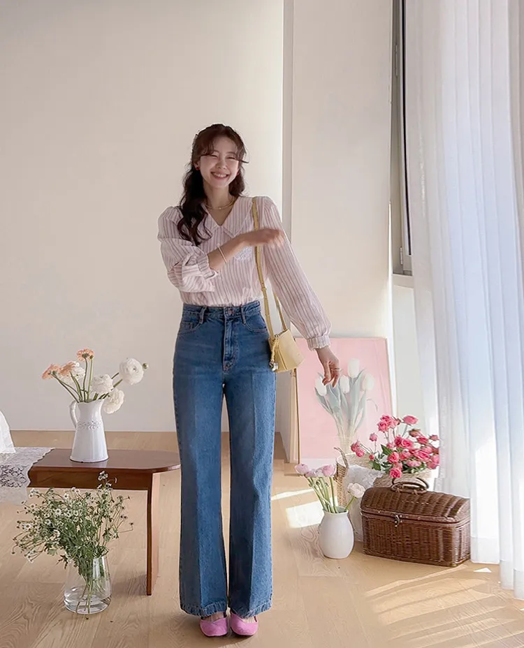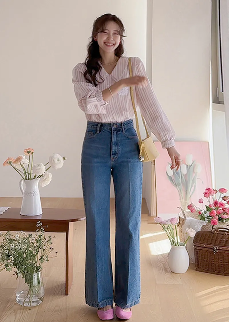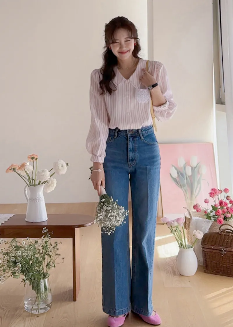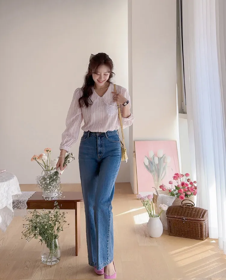 精緻蕾絲花邊領口襯邊點綴蕾絲刺繡口袋排扣上衣 條紋款/純色款