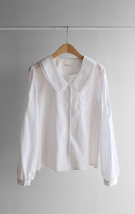 [V領設計+前領細節,營造柔美氣質] [領口蕾絲花邊增添精緻細節] [胸前蕾絲刺繡口袋,低調點綴] [泡泡袖勾勒女性柔美身形]