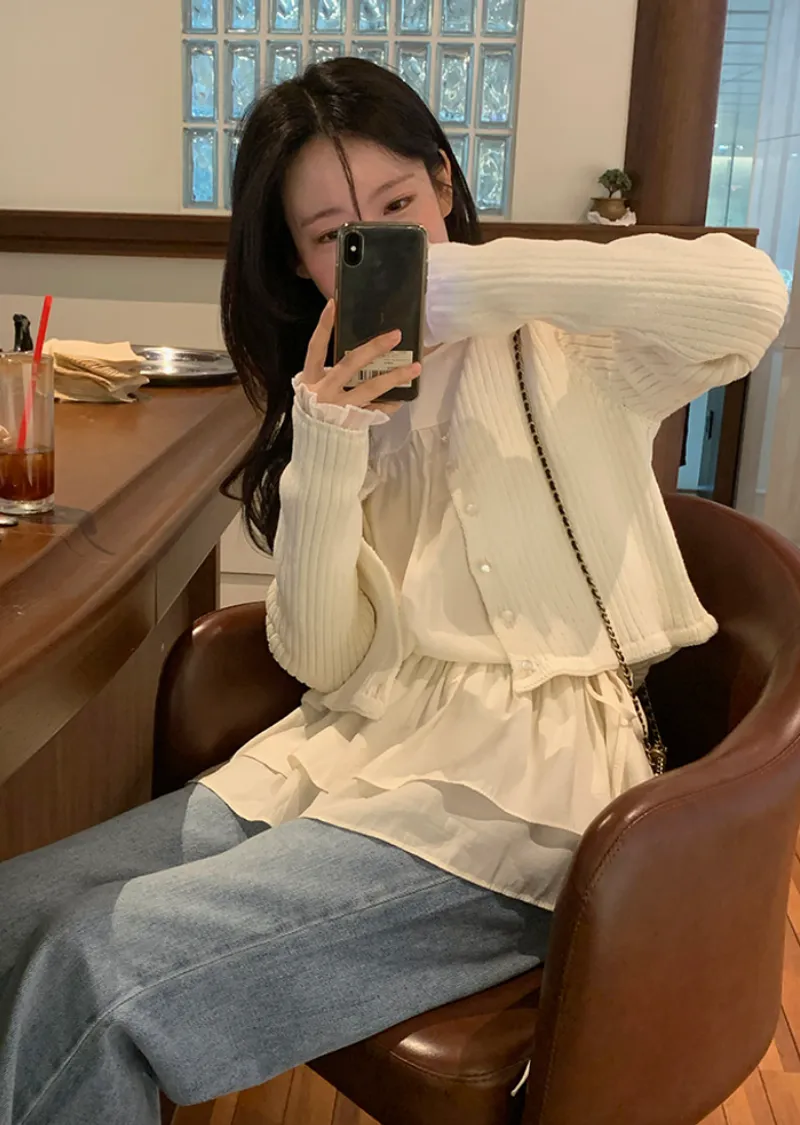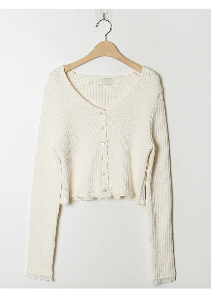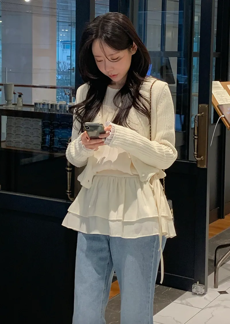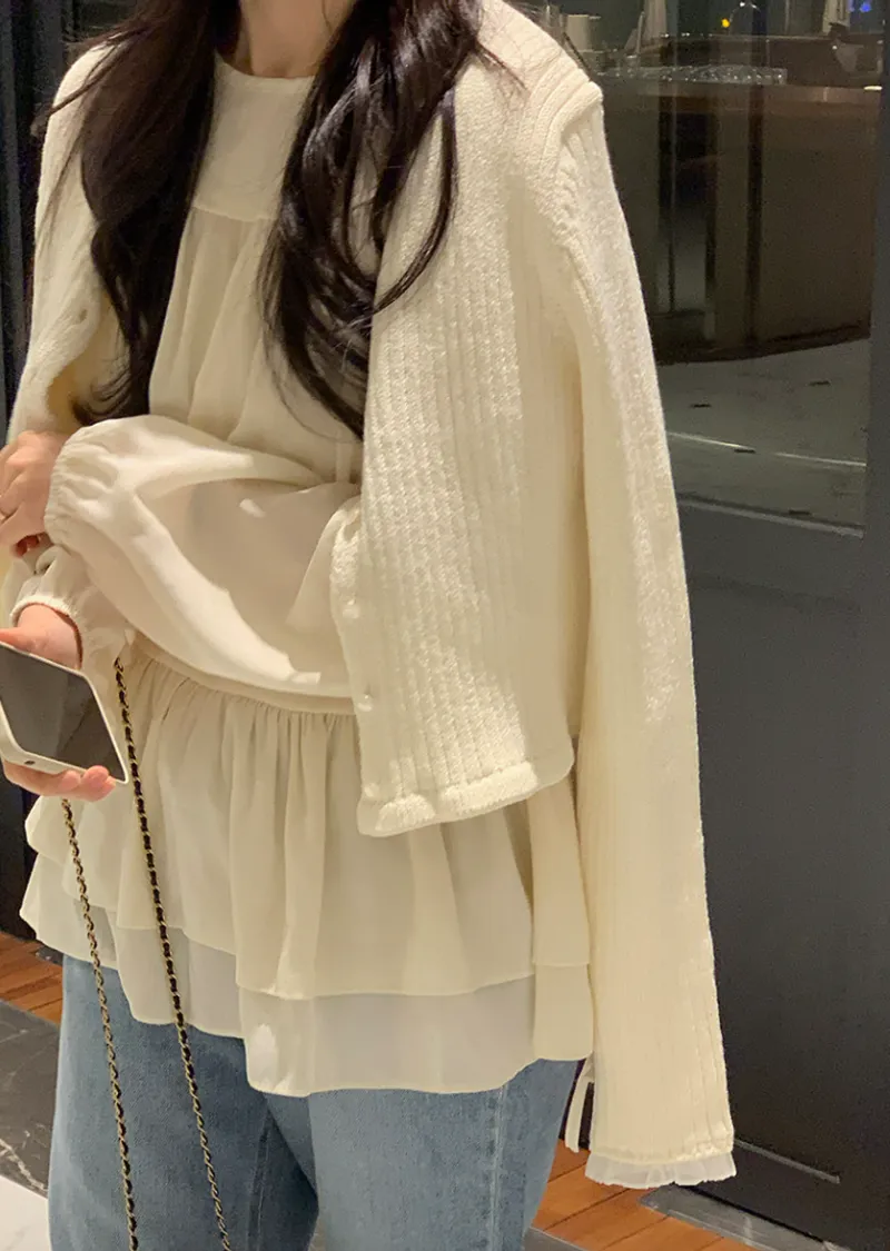 柔美蕾絲荷葉邊袖口波浪下擺針織開衫