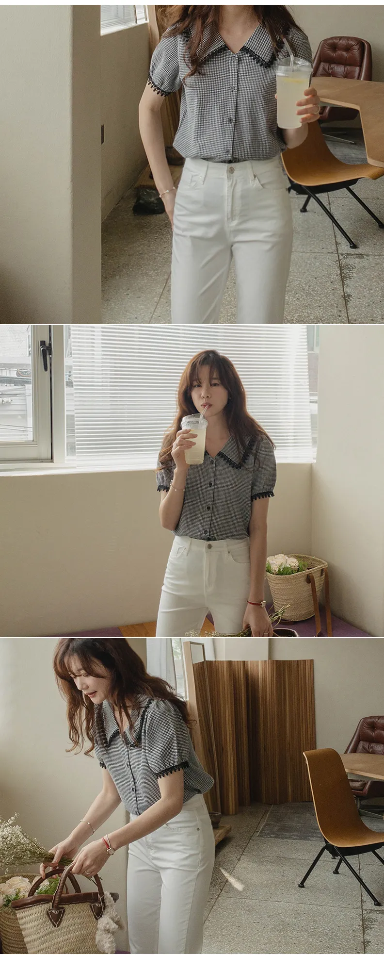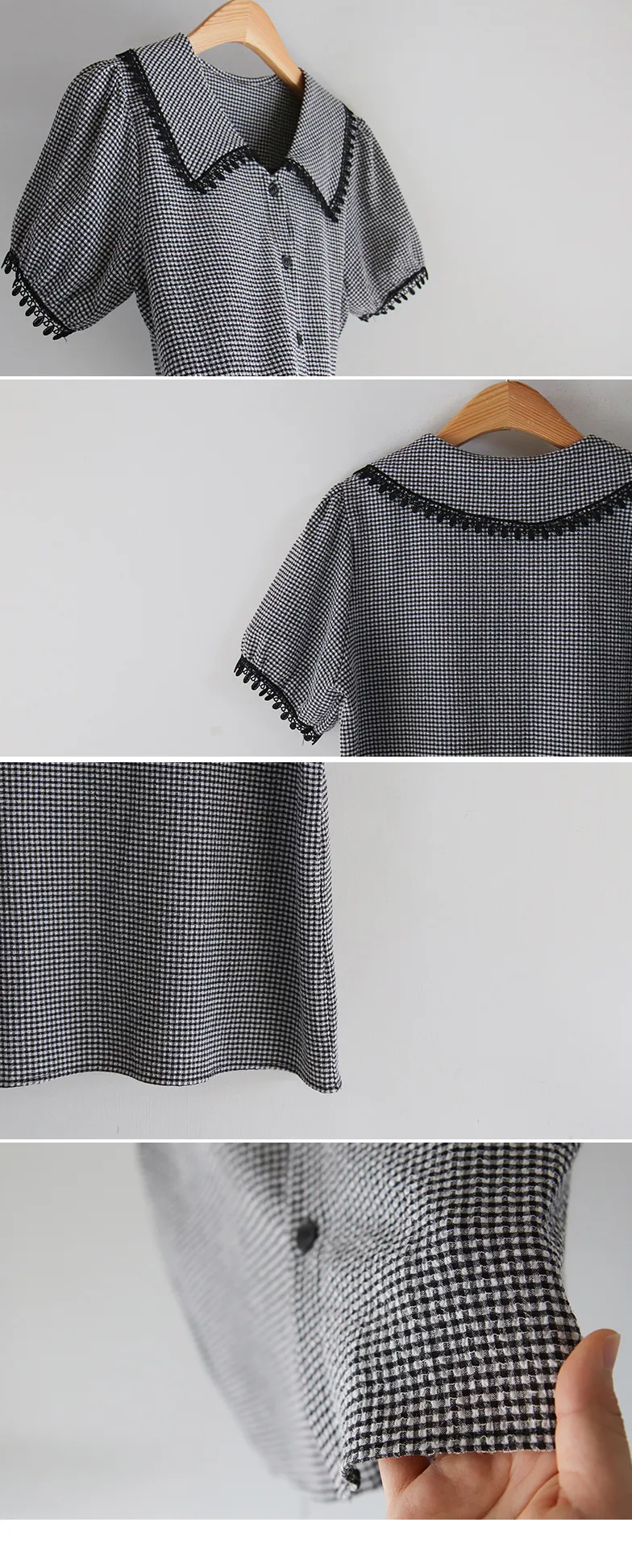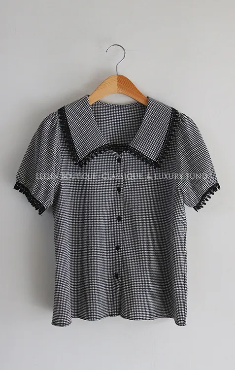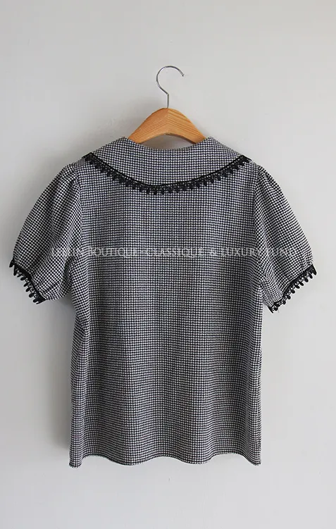 魅力黑色水滴蕾絲飾邊格紋排扣上衣