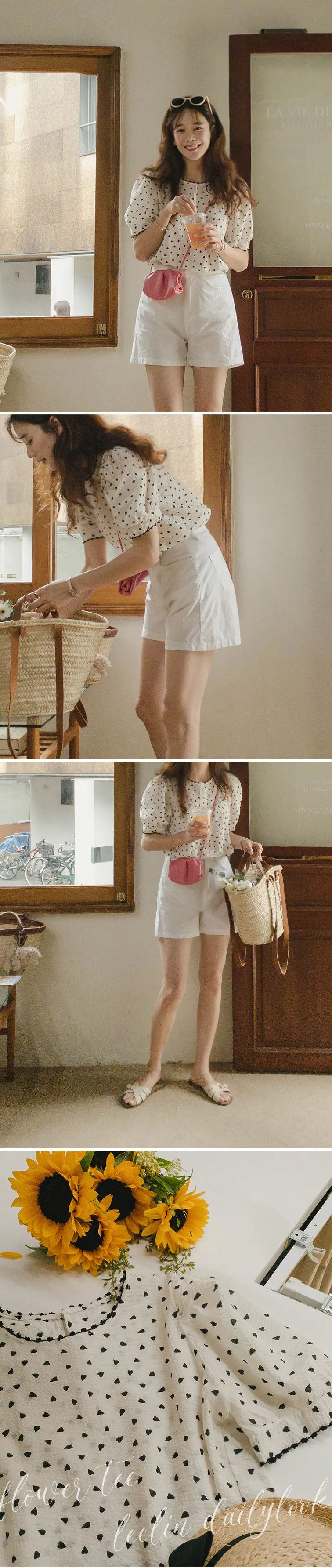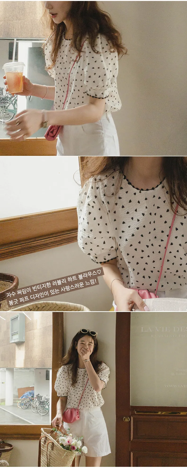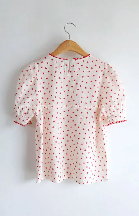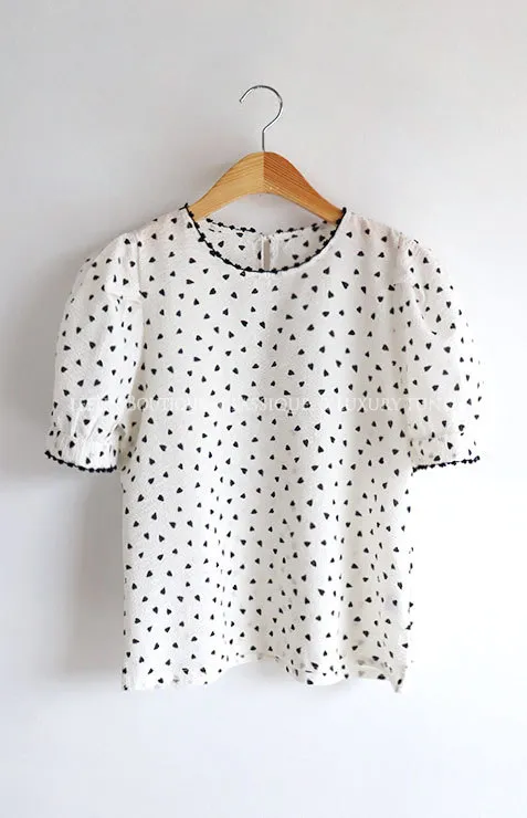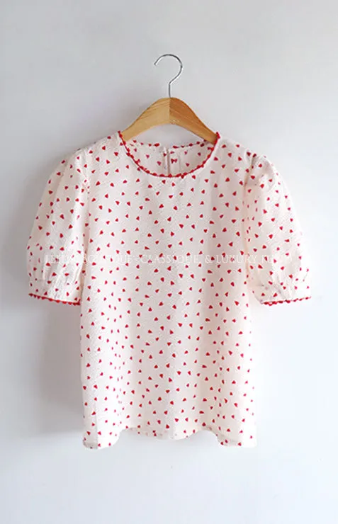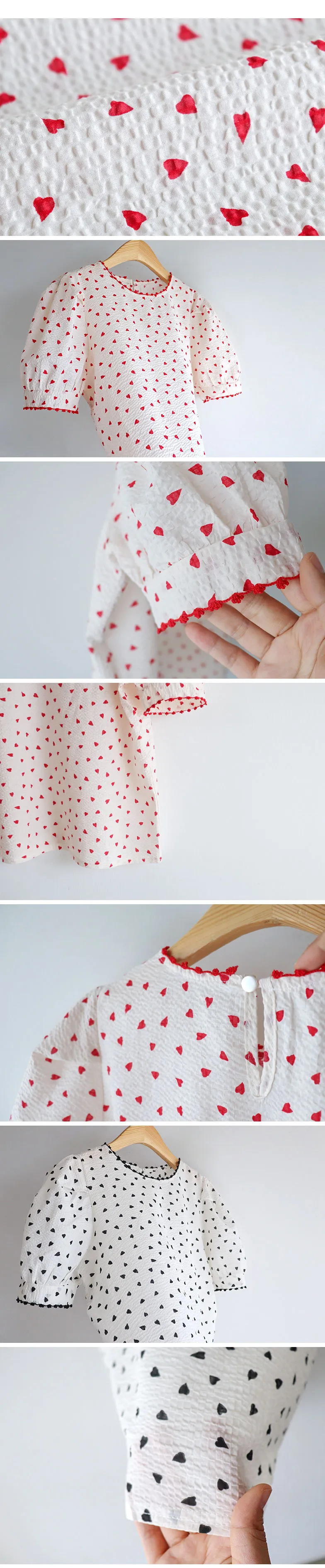 可愛波浪刺繡邊肩部細褶泡泡紗愛心上衣