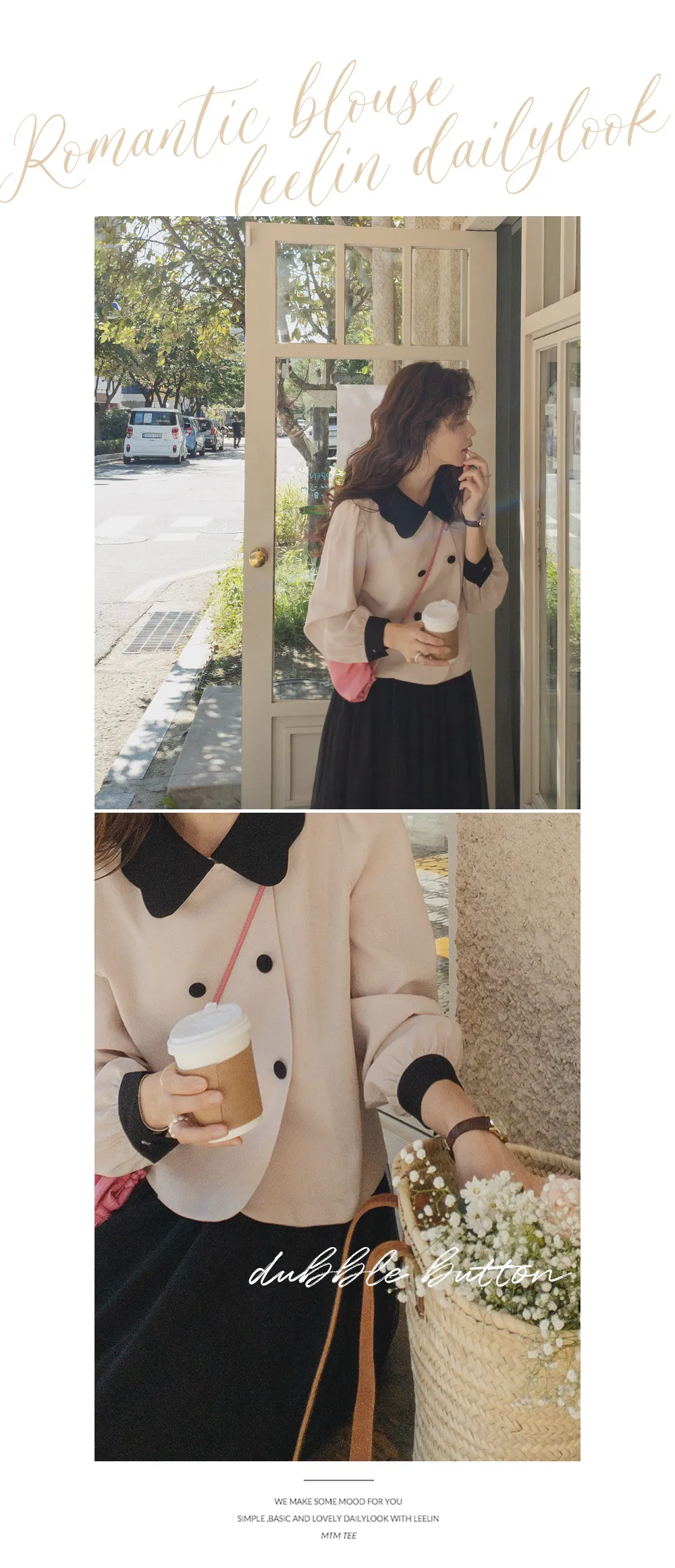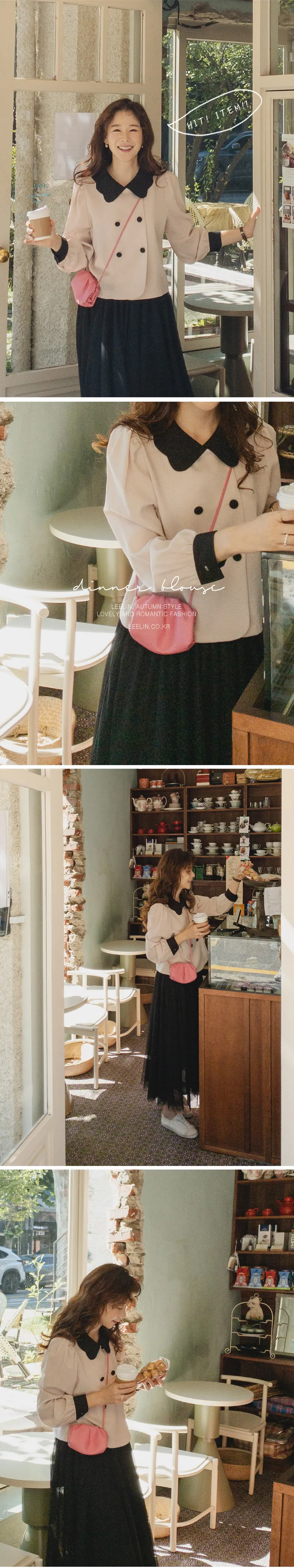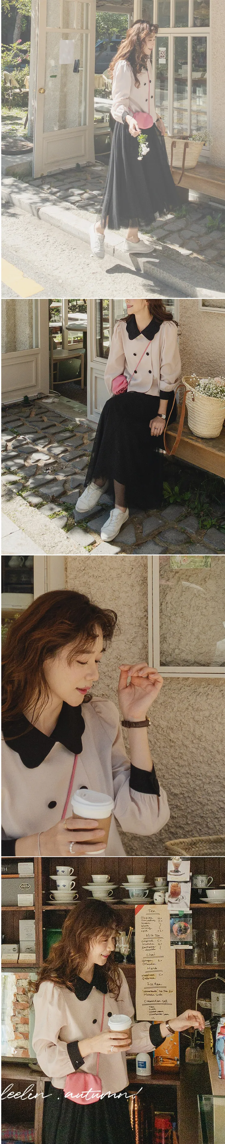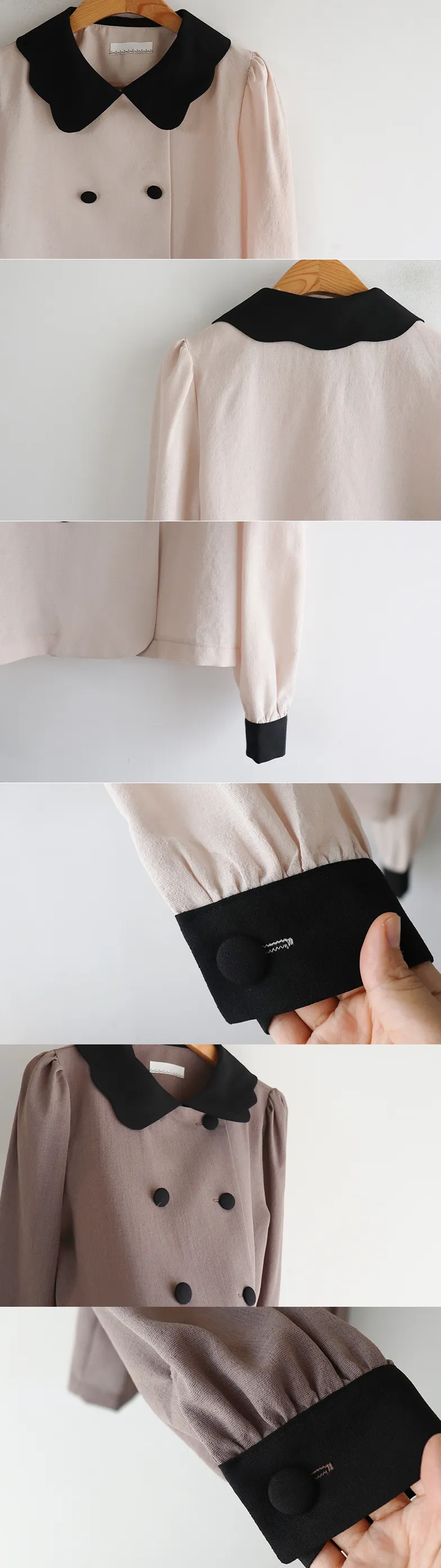 [可愛的波領排扣] [色彩組合細節和雙鈕扣的沉穩點] [肩膀和袖子抽褶的豐盈廓形] [可用作外套或上衣]