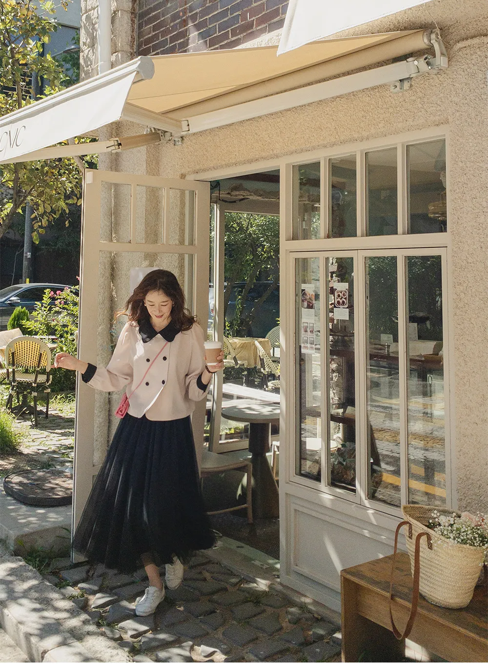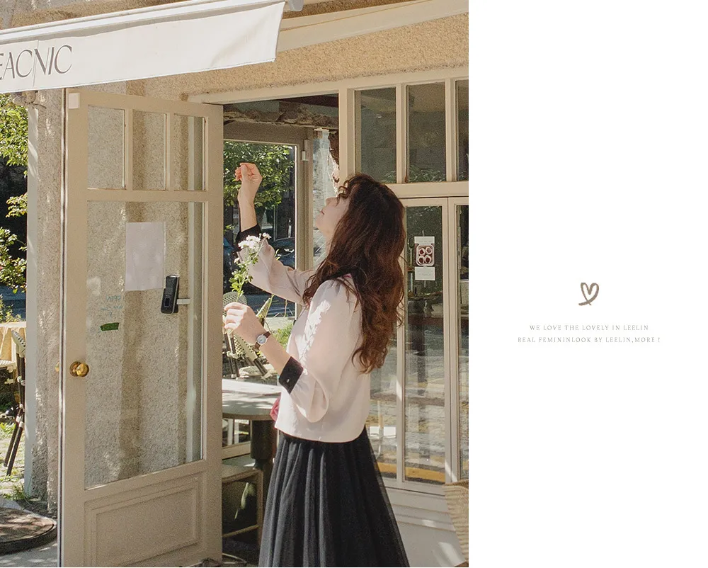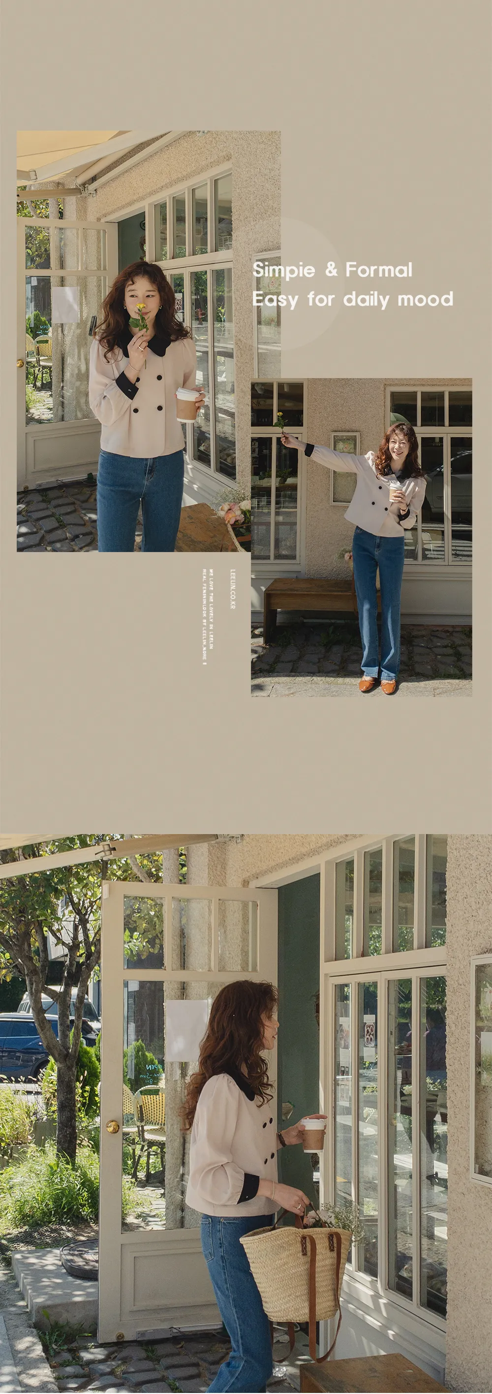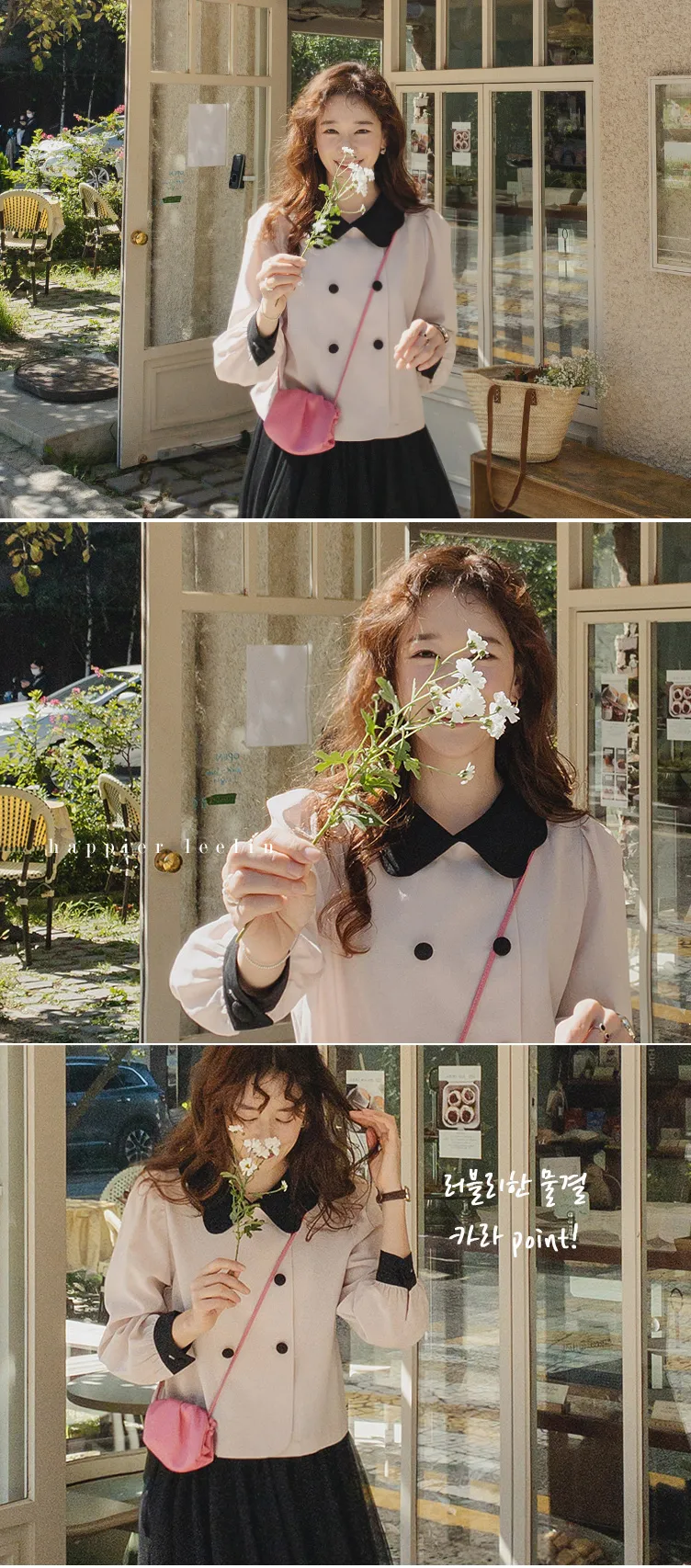 [可愛的波領排扣] [色彩組合細節和雙鈕扣的沉穩點] [肩膀和袖子抽褶的豐盈廓形] [可用作外套或上衣]