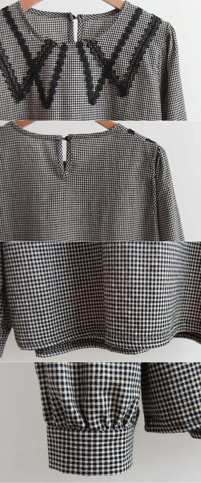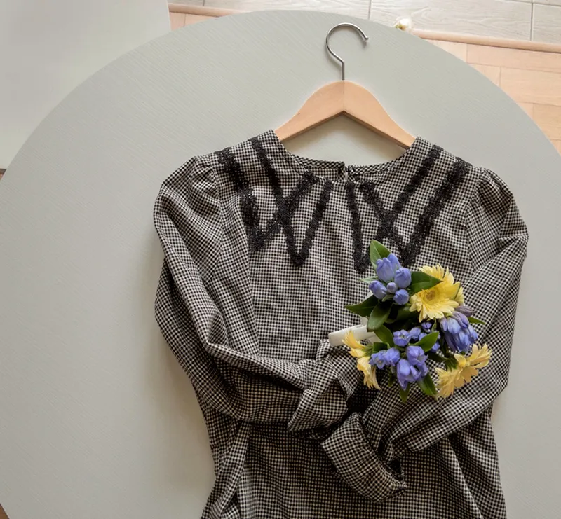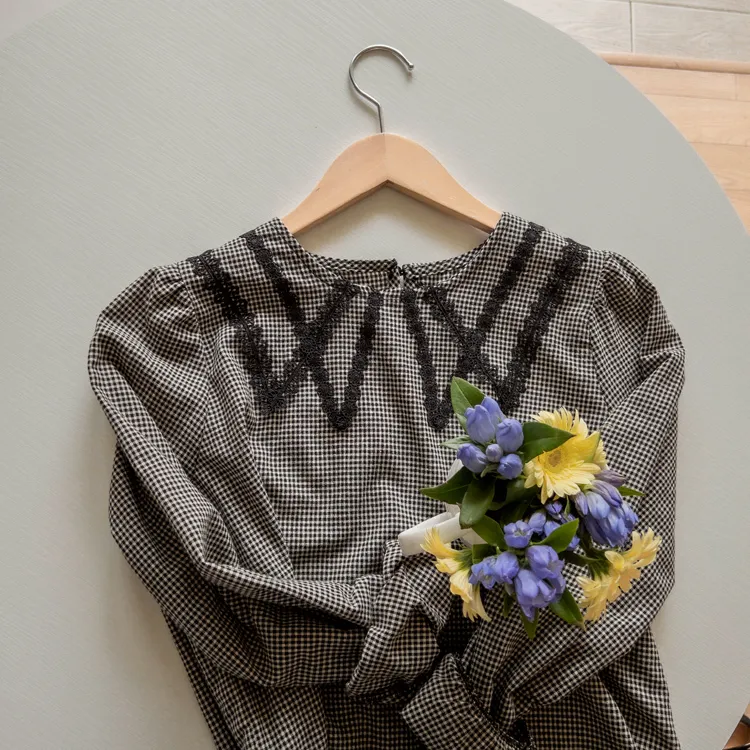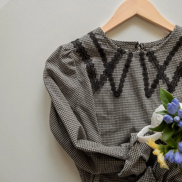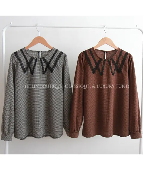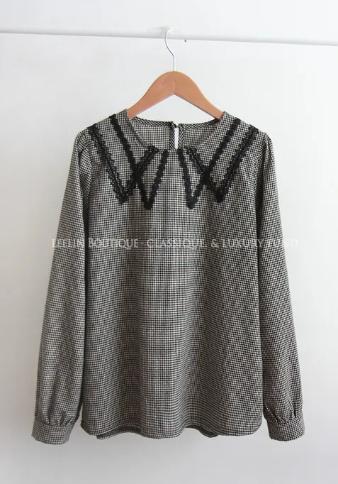 優雅蕾絲飾邊領格紋上衣