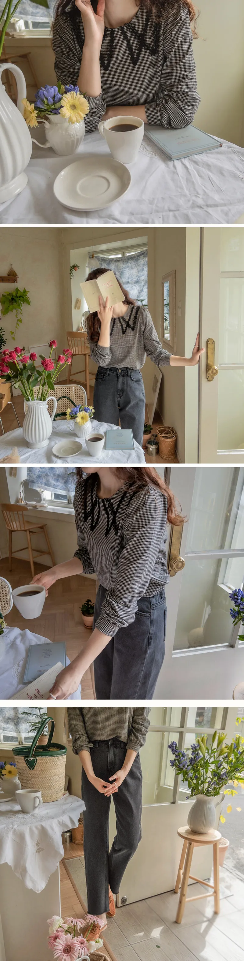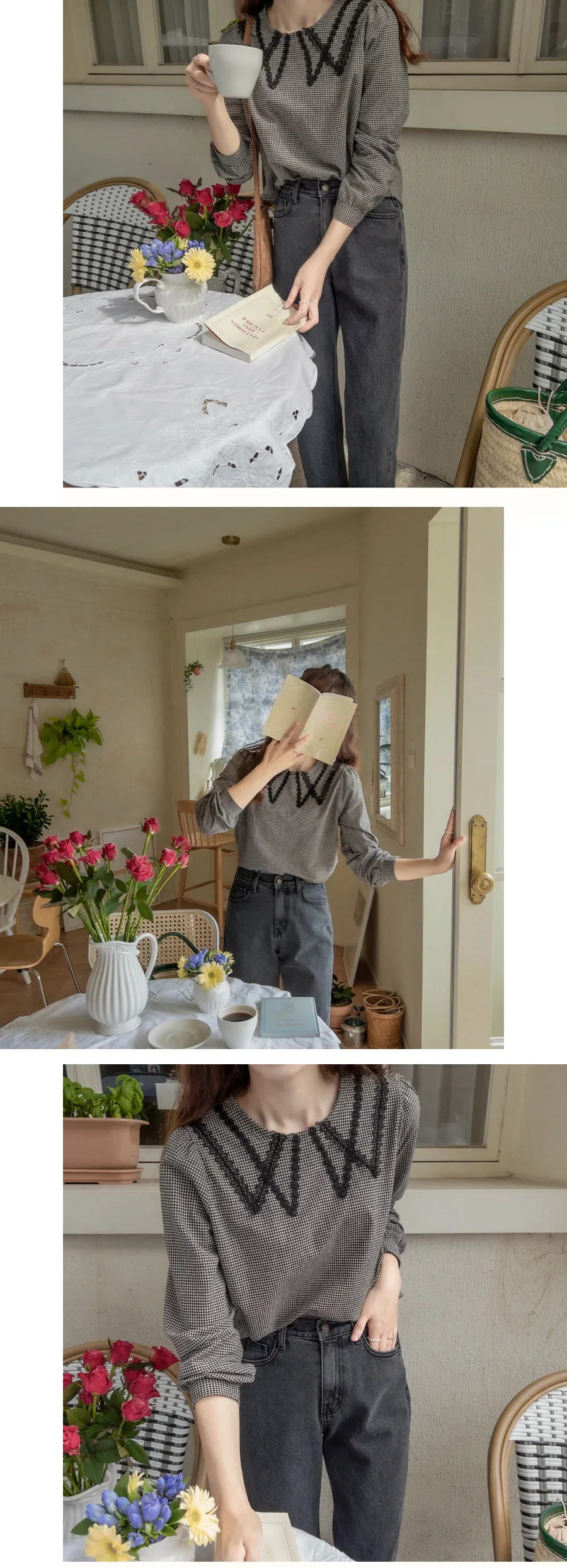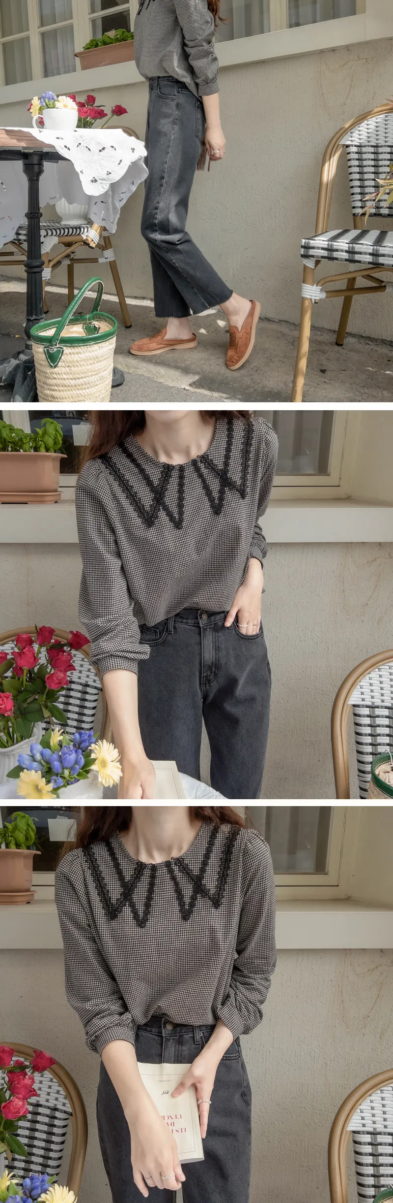 優雅蕾絲飾邊領格紋上衣
