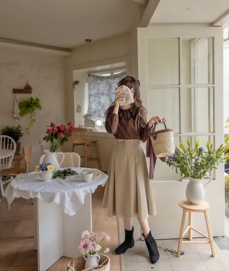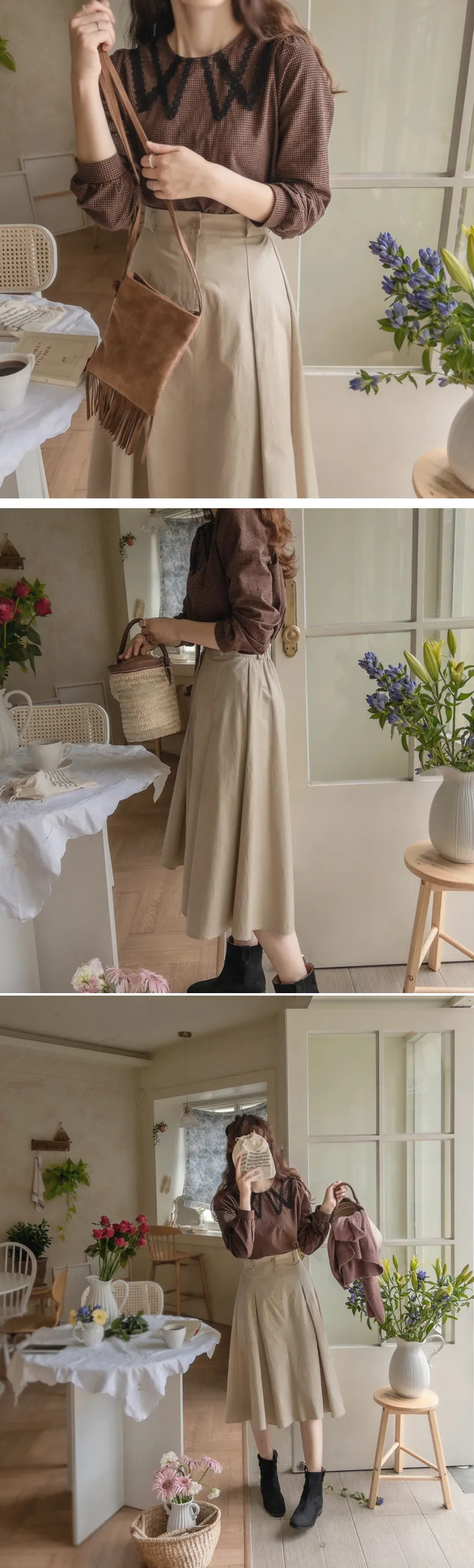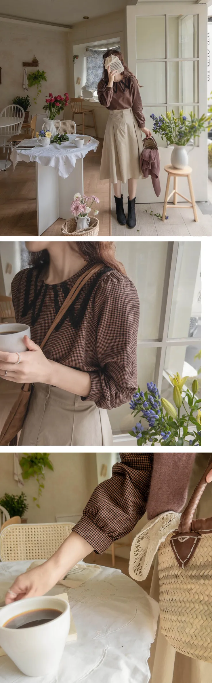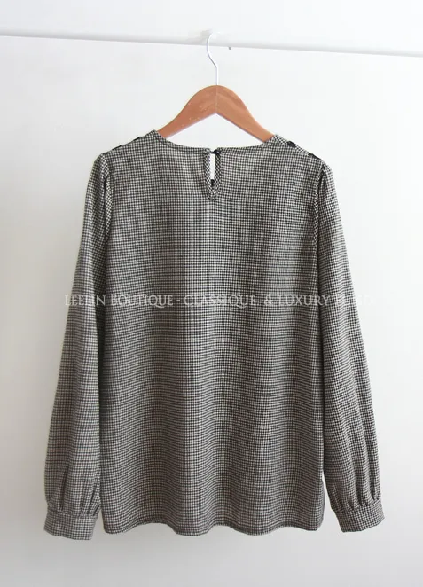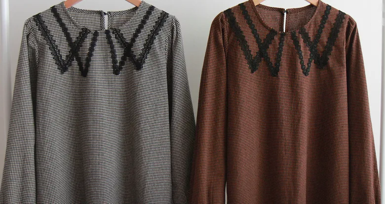 [頸部有蕾絲裝飾的漂亮排扣上衣][秋季格紋圖案給人一種活潑的感覺][優雅風格推薦]