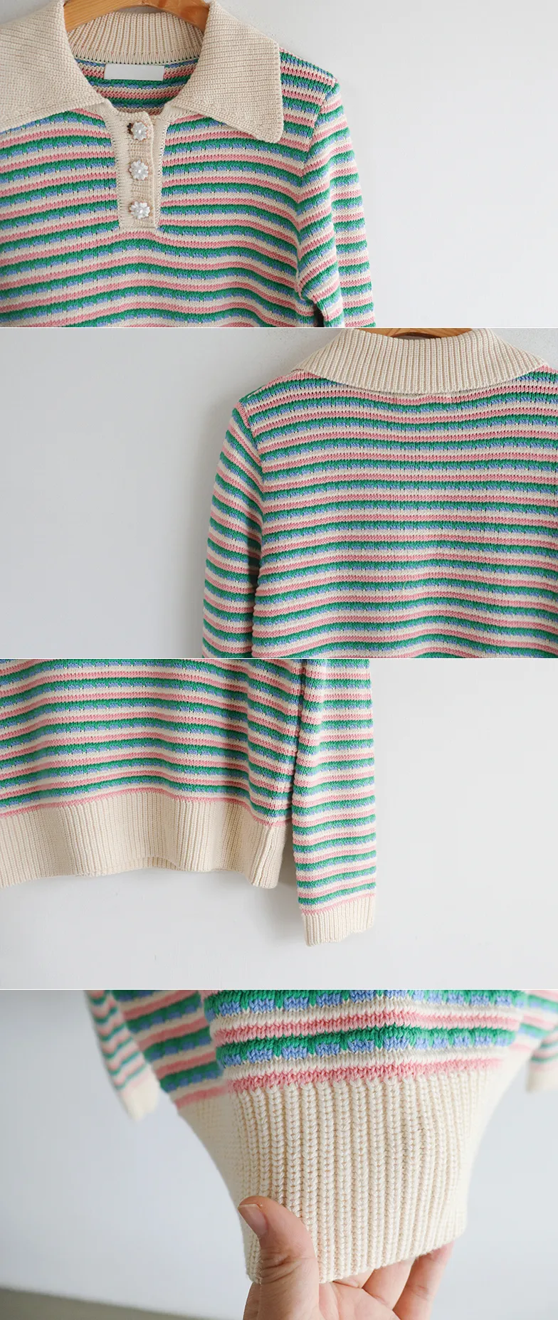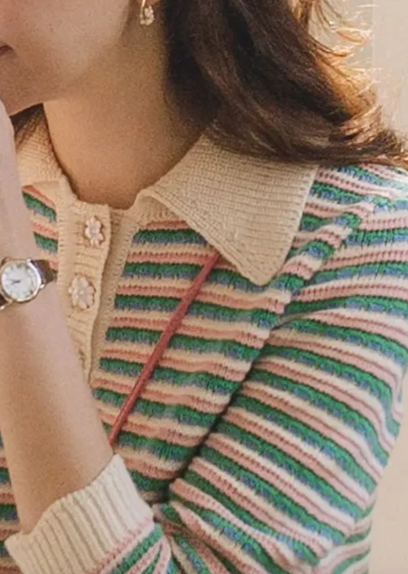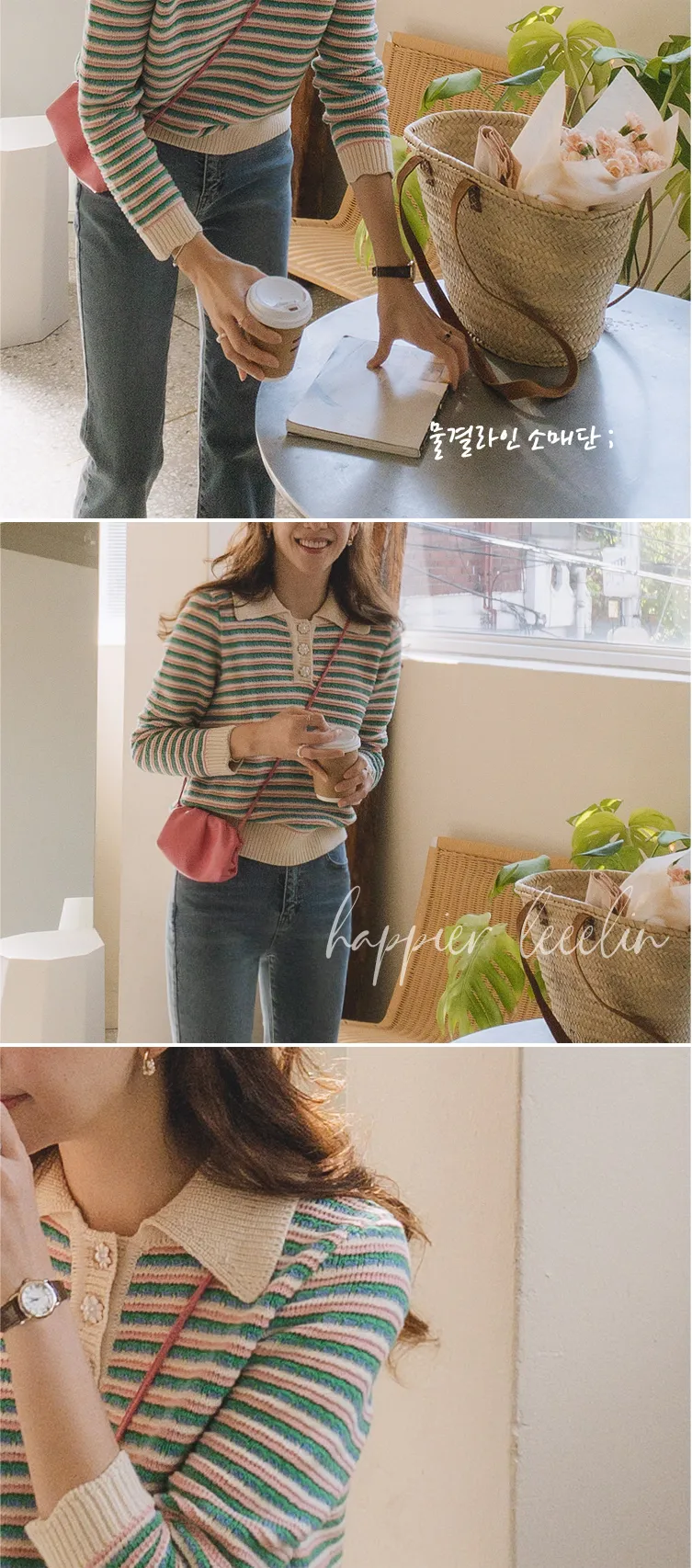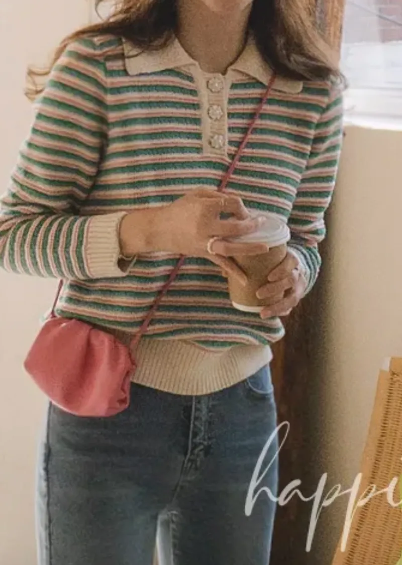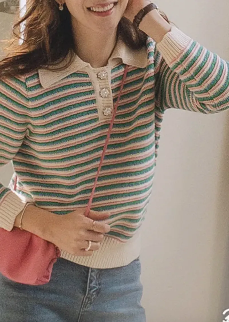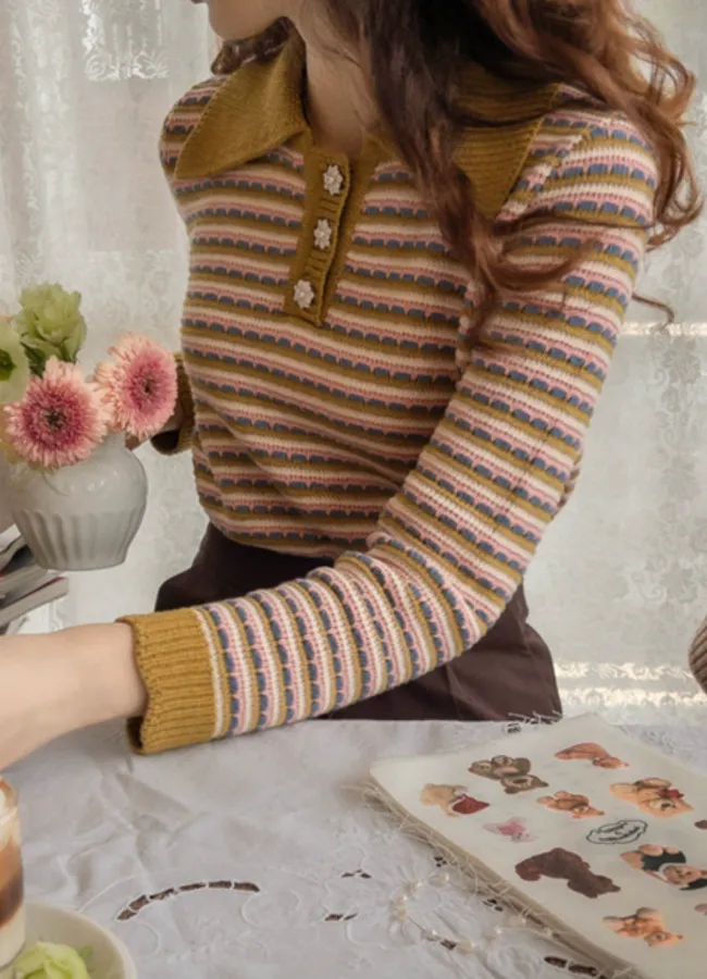 可愛亮色花朵鈕扣色彩條紋針織上衣