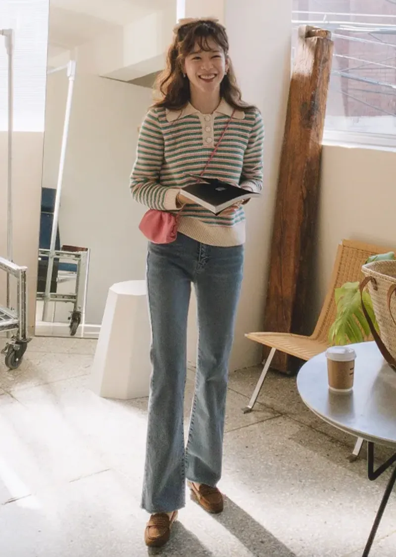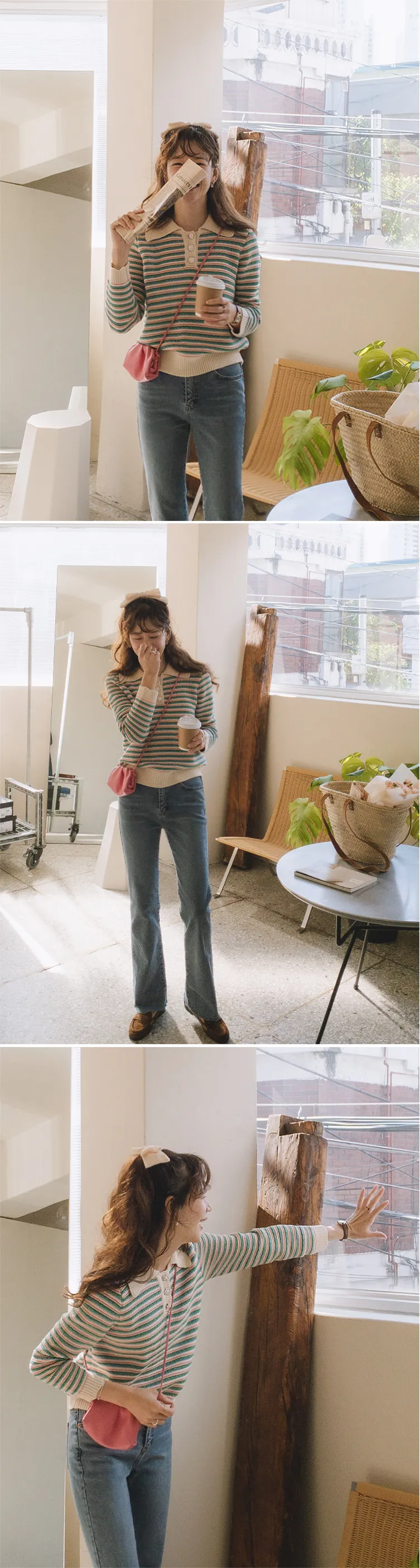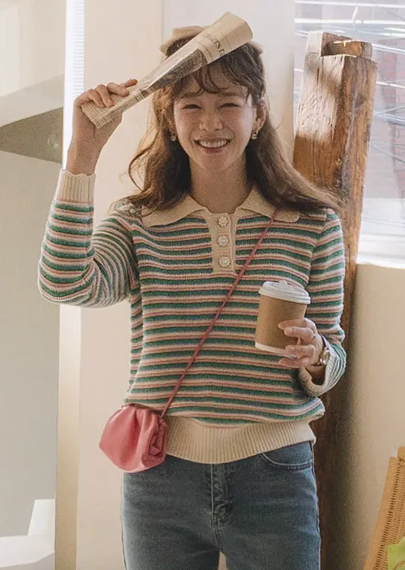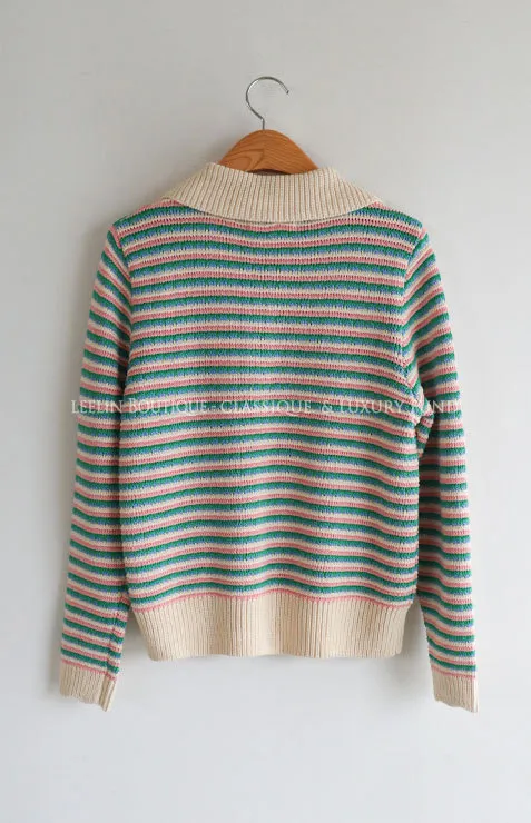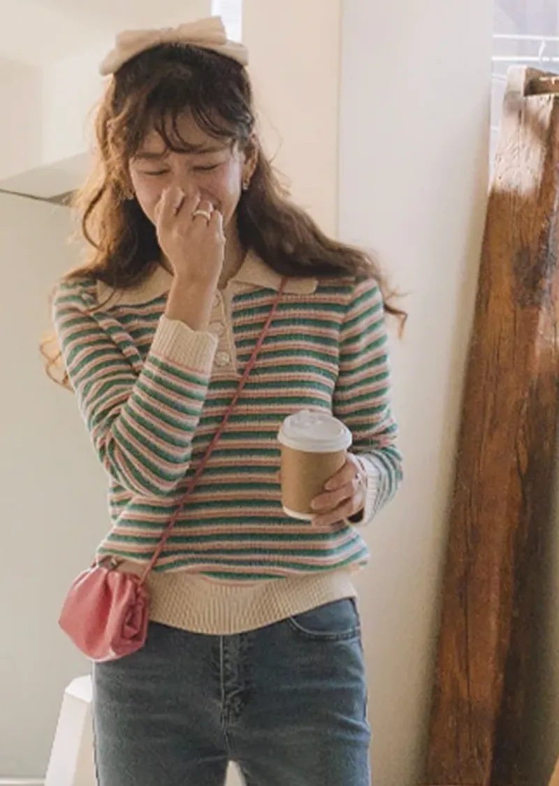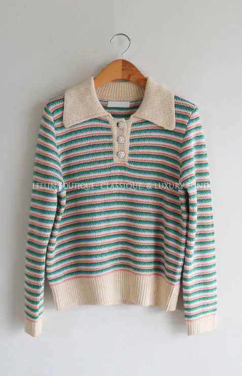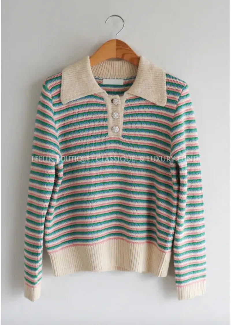 可愛亮色花朵鈕扣色彩條紋針織上衣