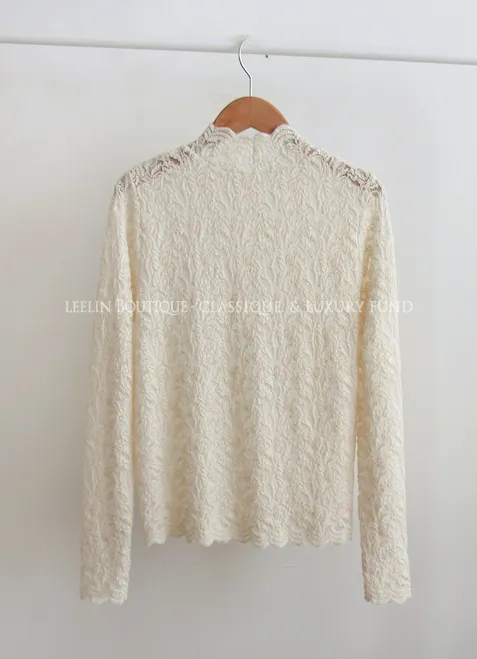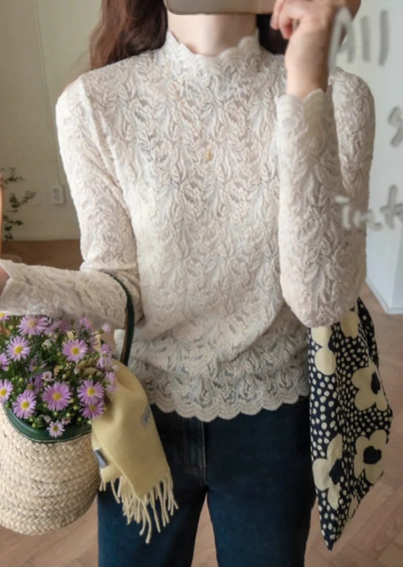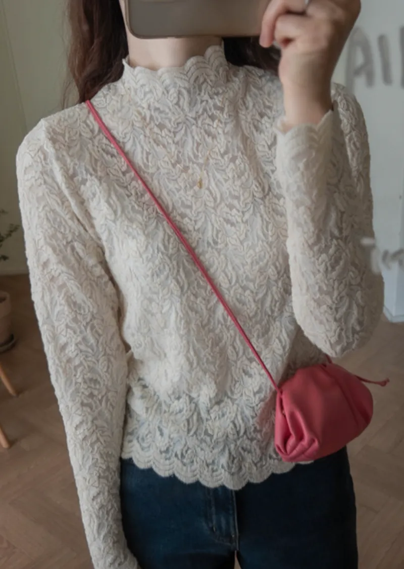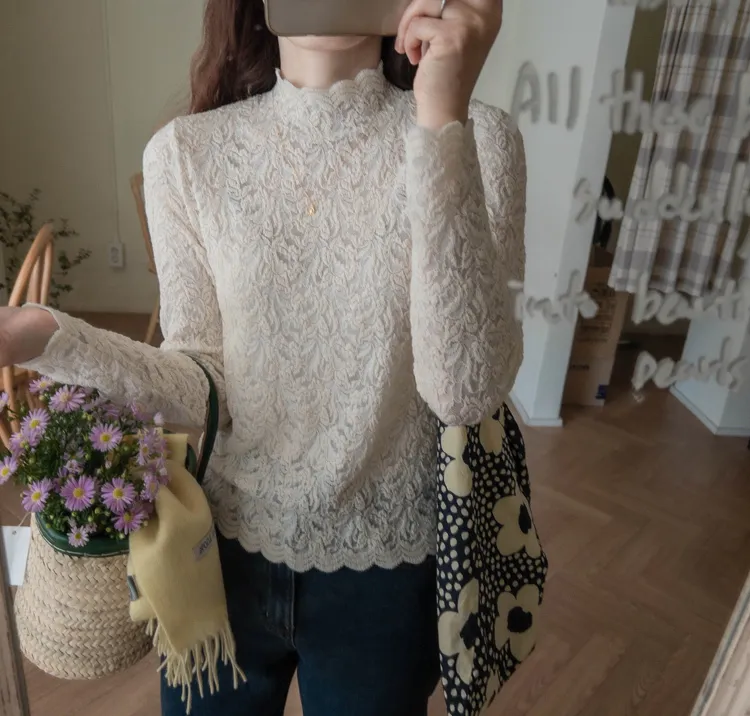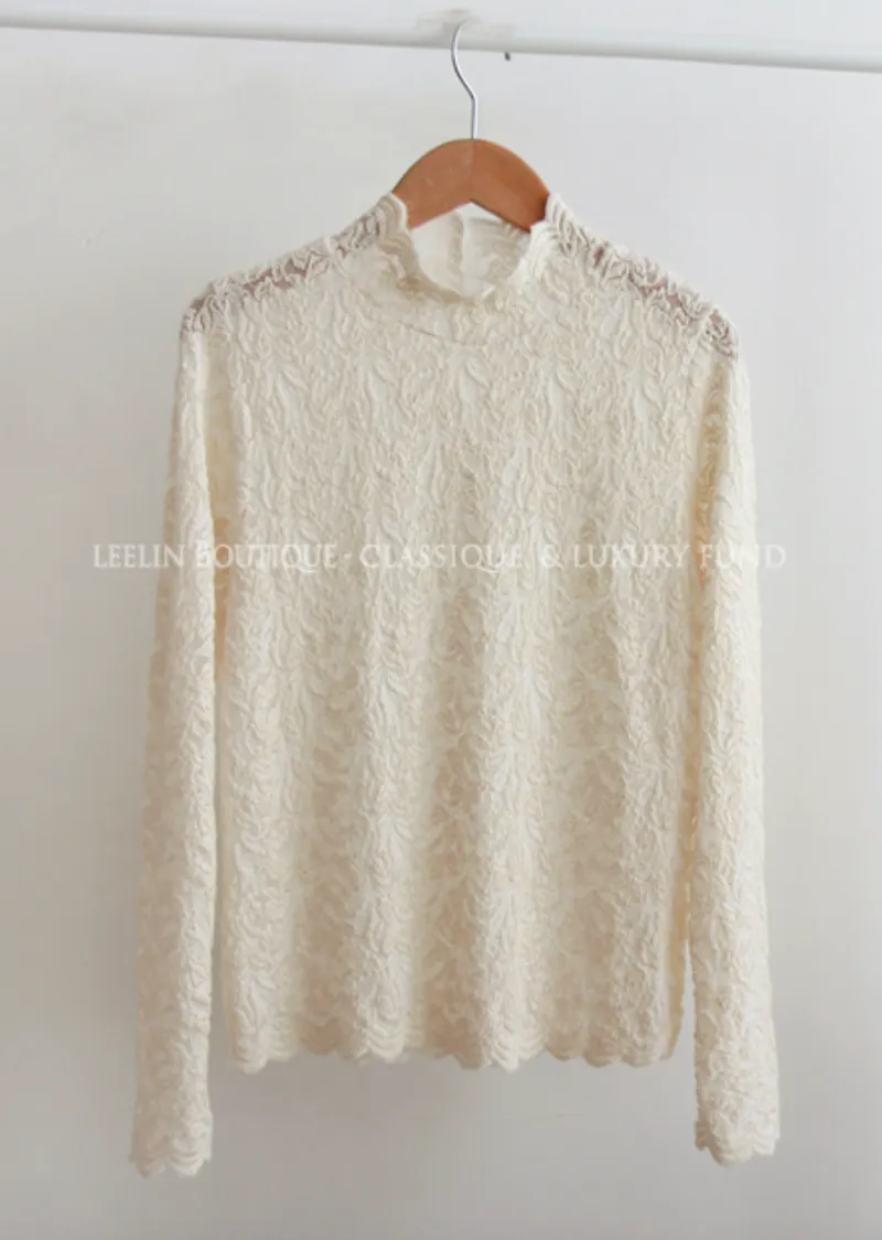 優雅蕾絲花朵波浪邊彈性內搭上衣