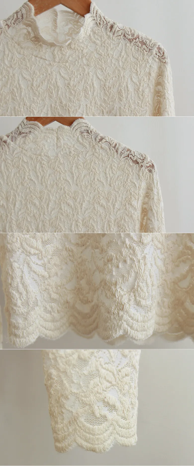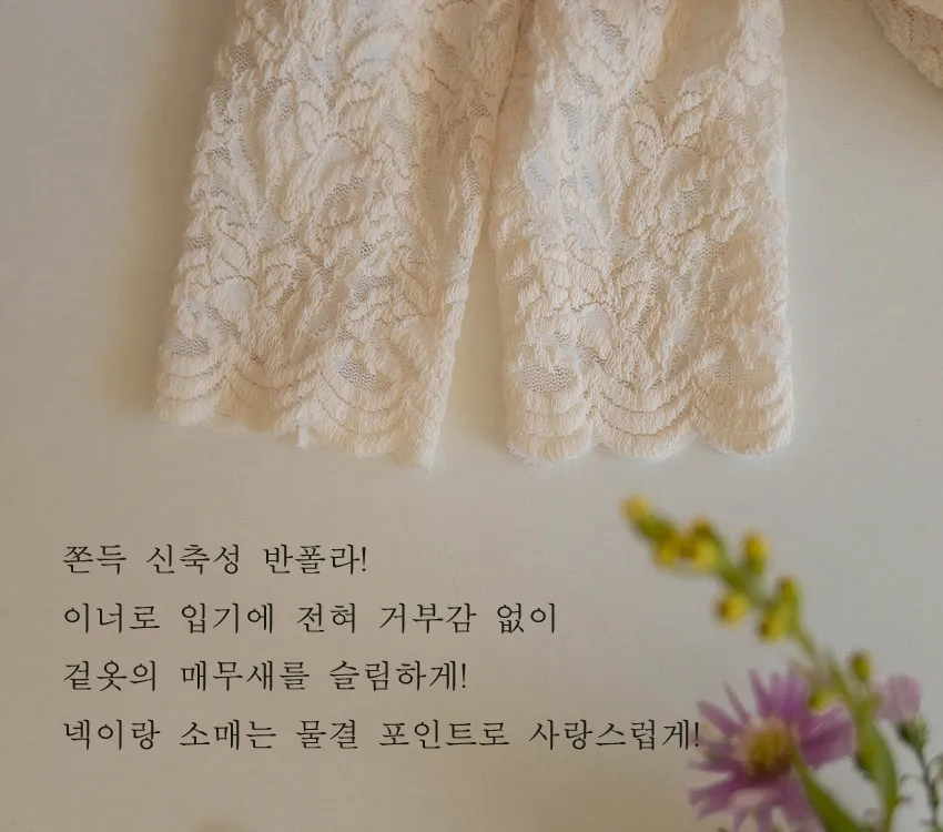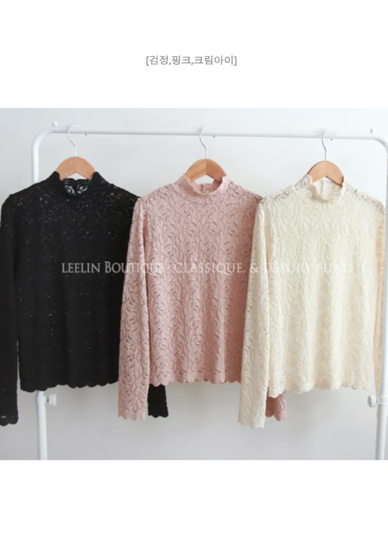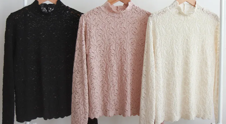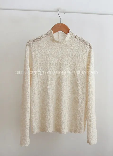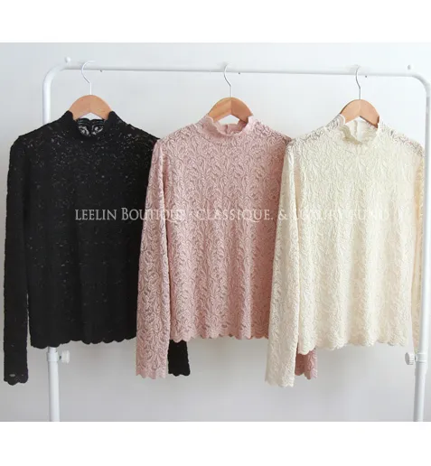 [半高領,5%氨綸製成的漂亮波浪領,不會起皺][與花朵圖案舒適搭配的最佳單品!且富有彈性的布料製成,舒適地適合任何外套或開襟衫! ][下擺和袖子的波浪形狀非常漂亮]