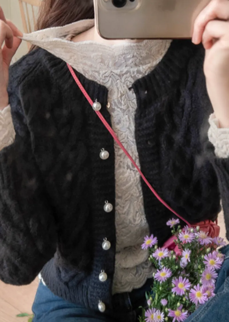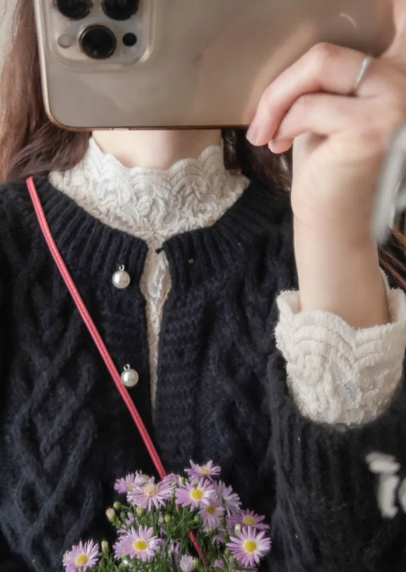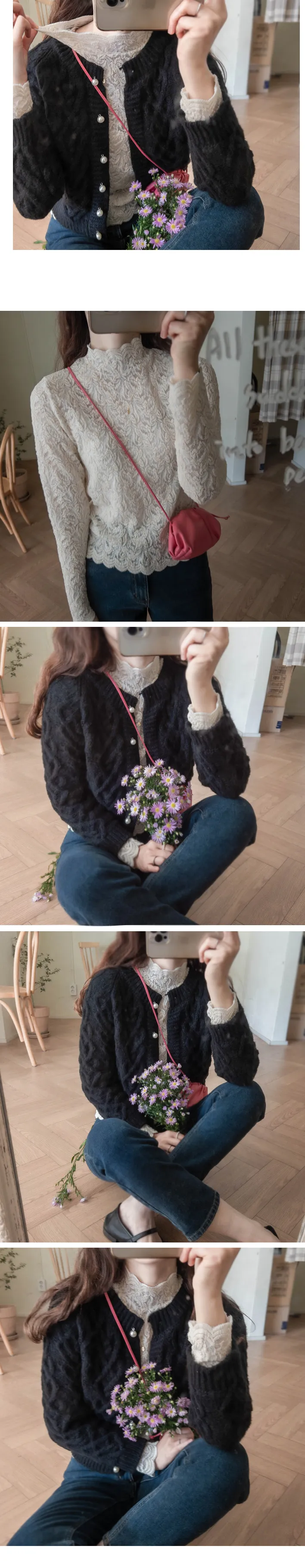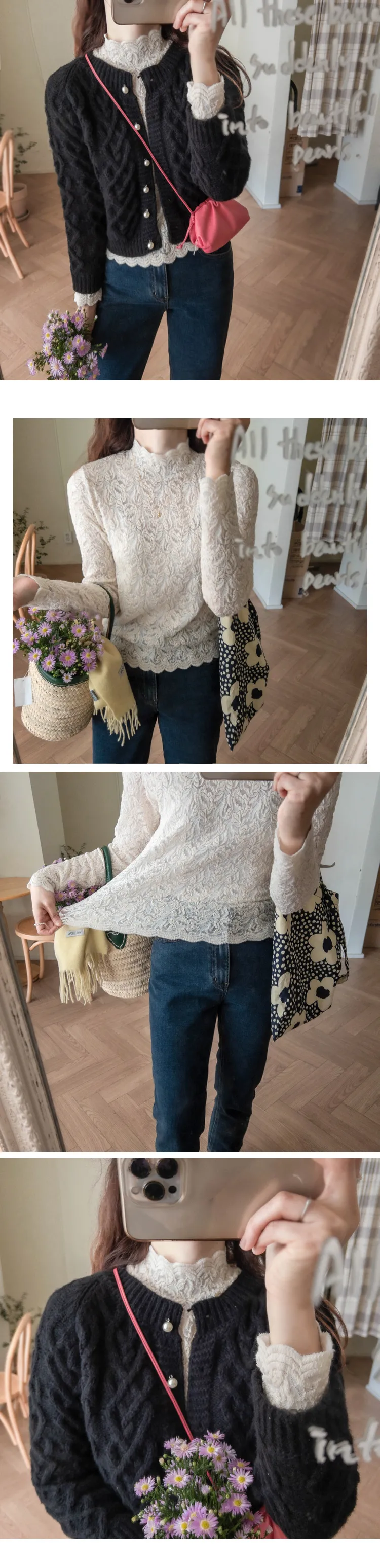 [半高領,5%氨綸製成的漂亮波浪領,不會起皺][與花朵圖案舒適搭配的最佳單品!且富有彈性的布料製成,舒適地適合任何外套或開襟衫! ][下擺和袖子的波浪形狀非常漂亮]