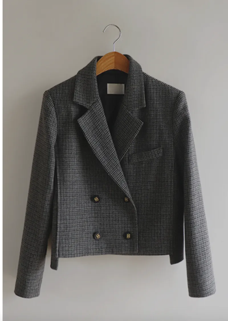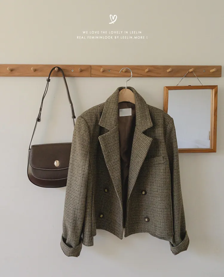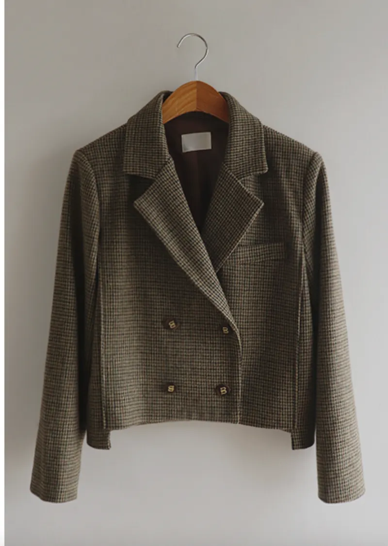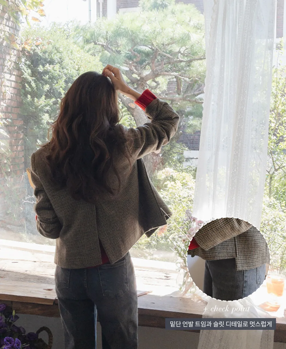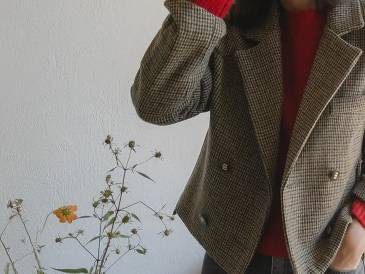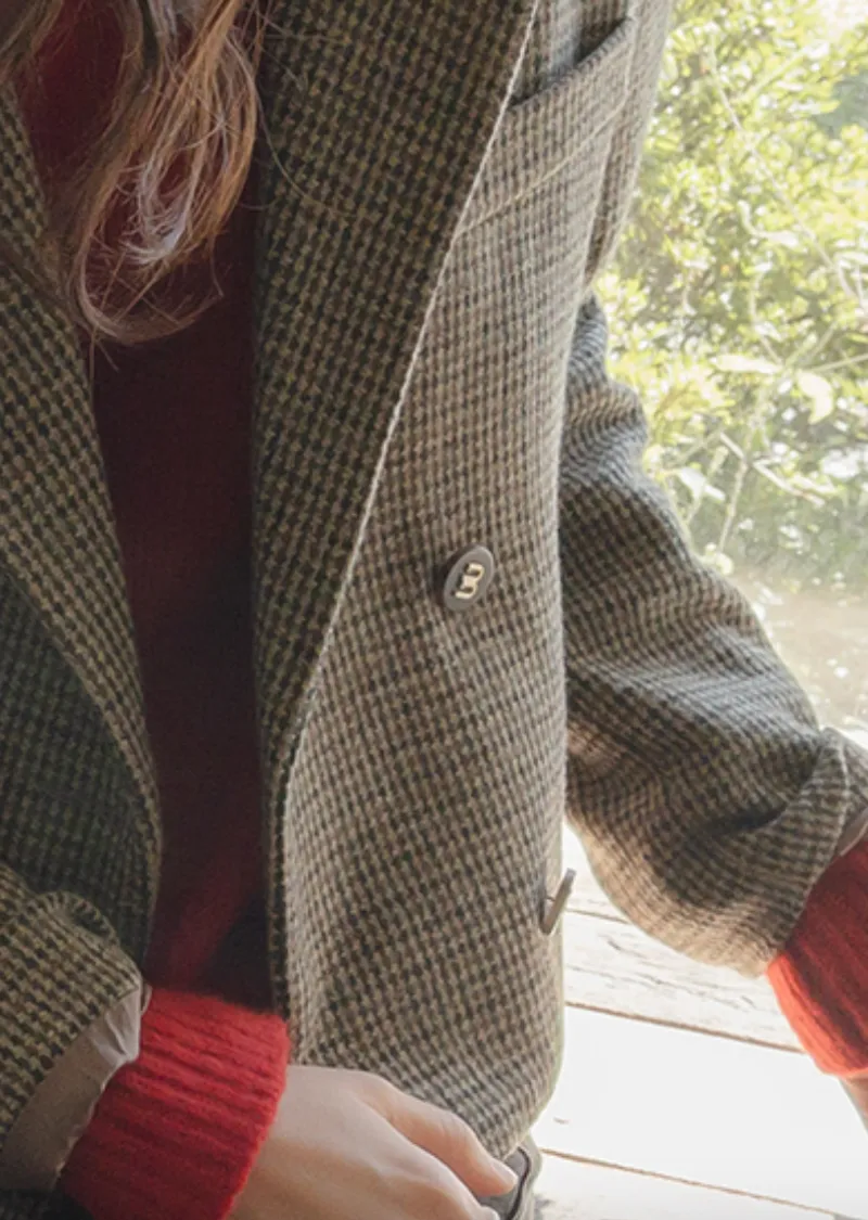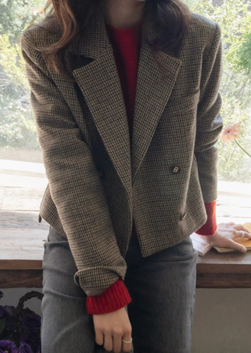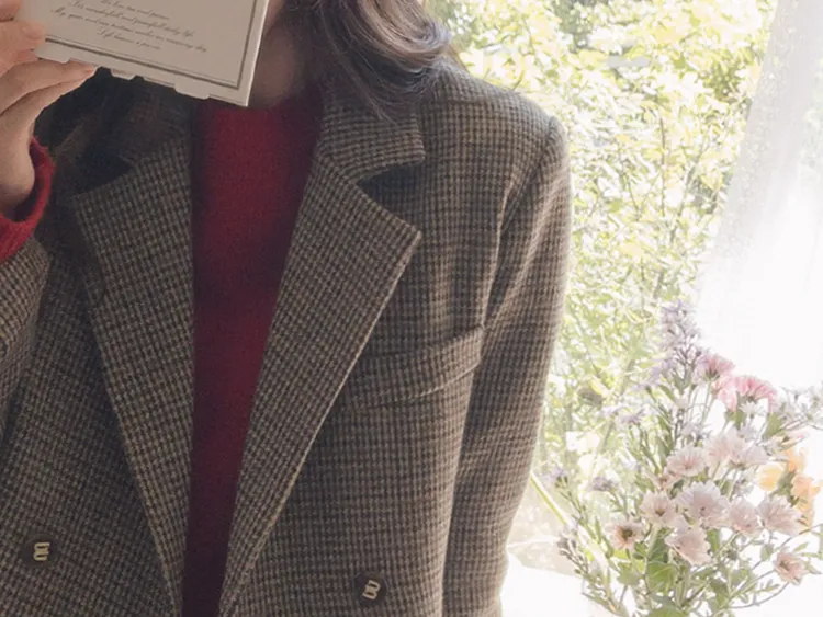 秋季氛圍雙扣下擺無痕開衩格紋外套