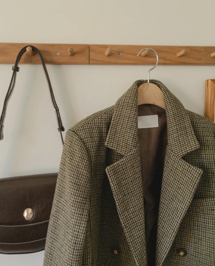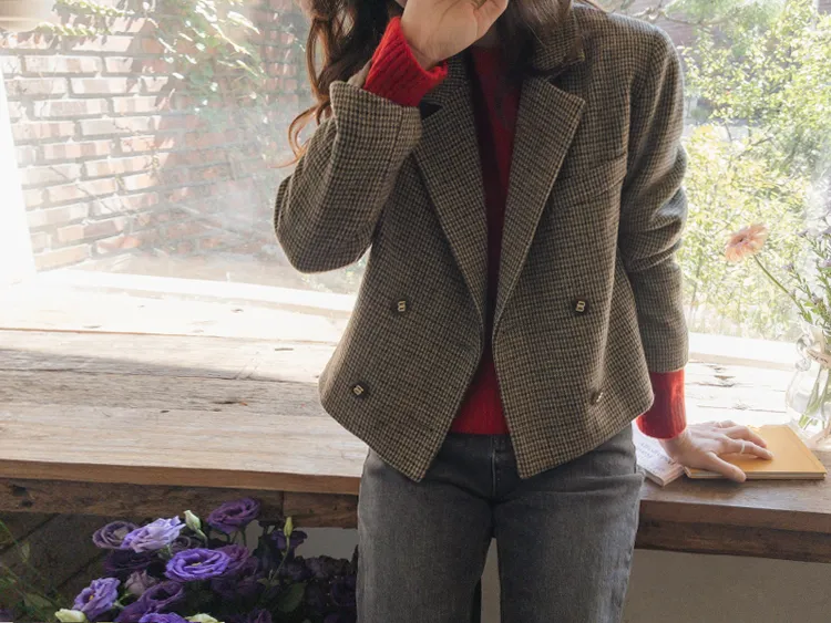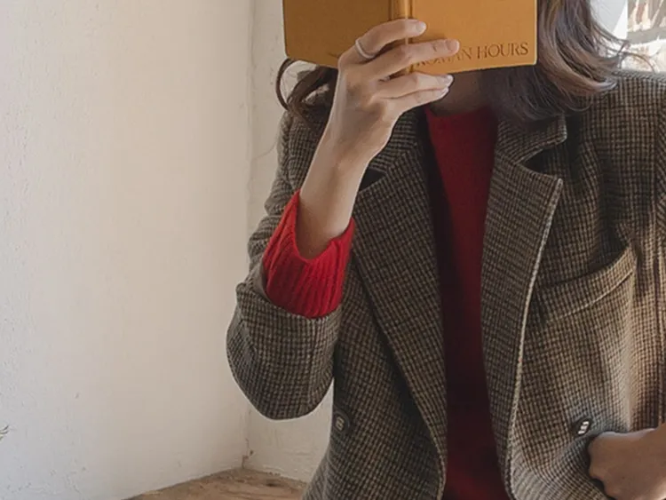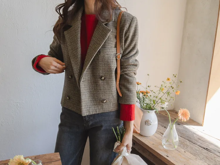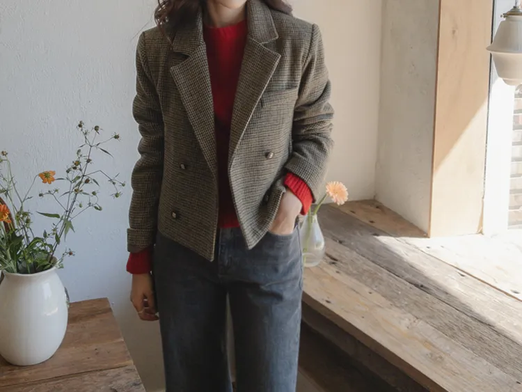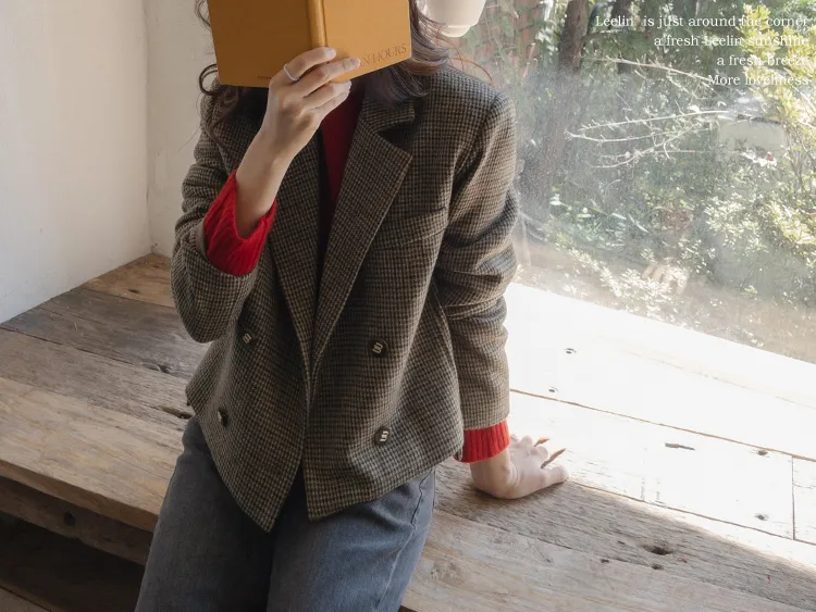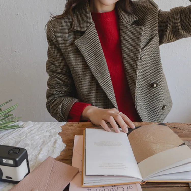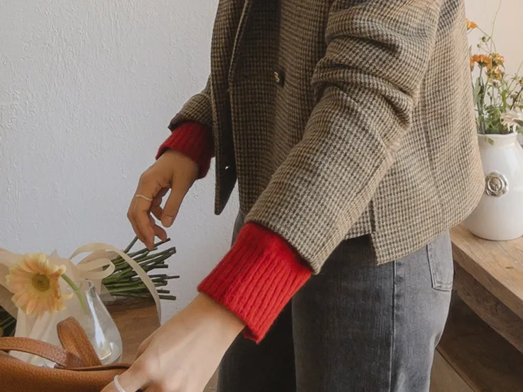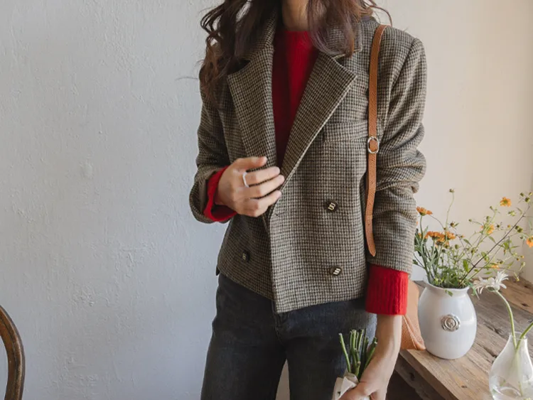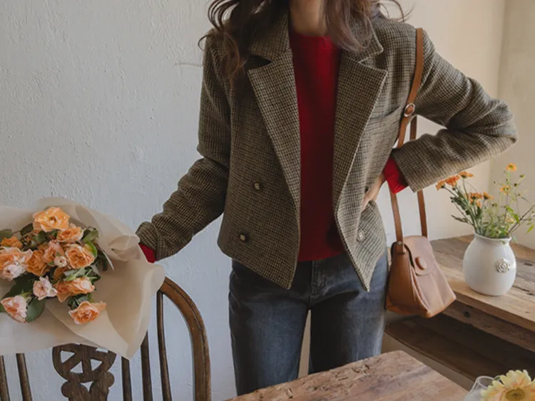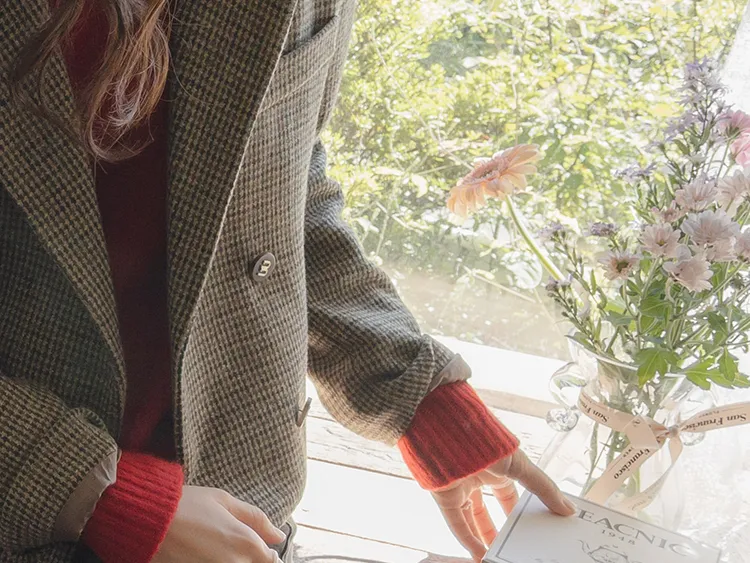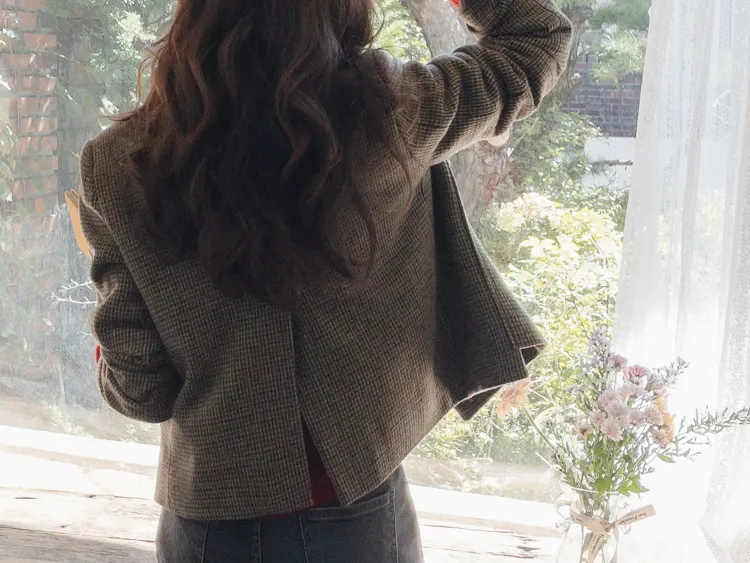 秋季氛圍雙扣下擺無痕開衩格紋外套