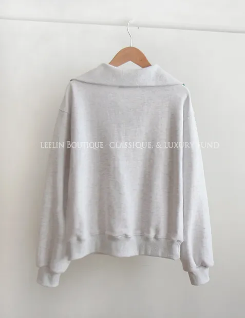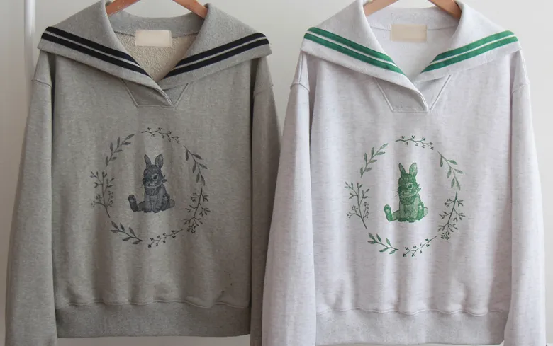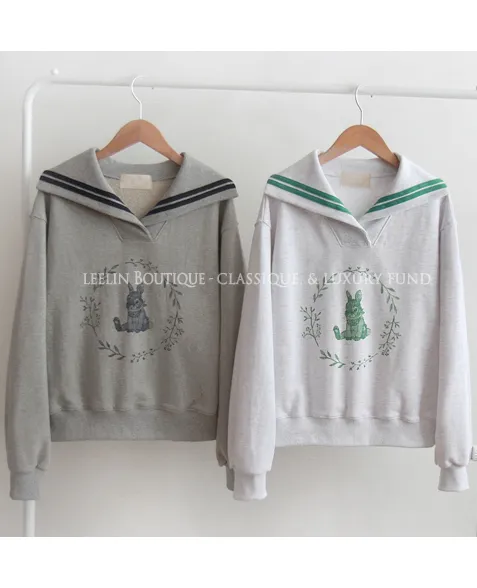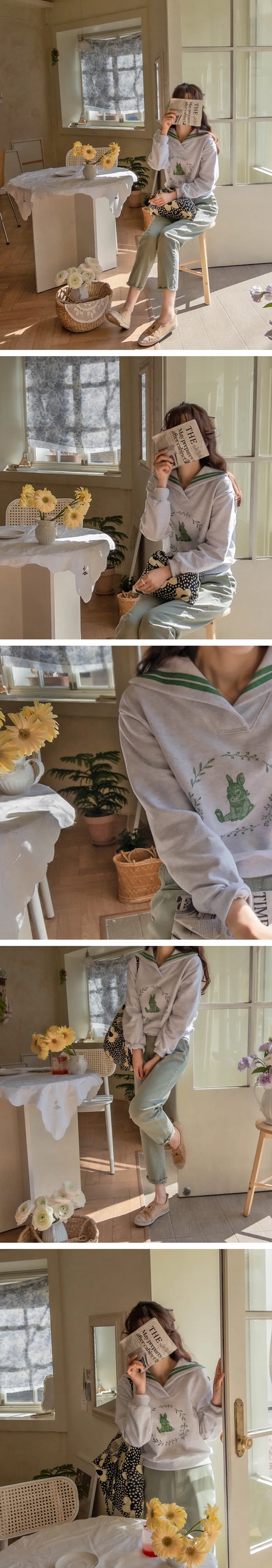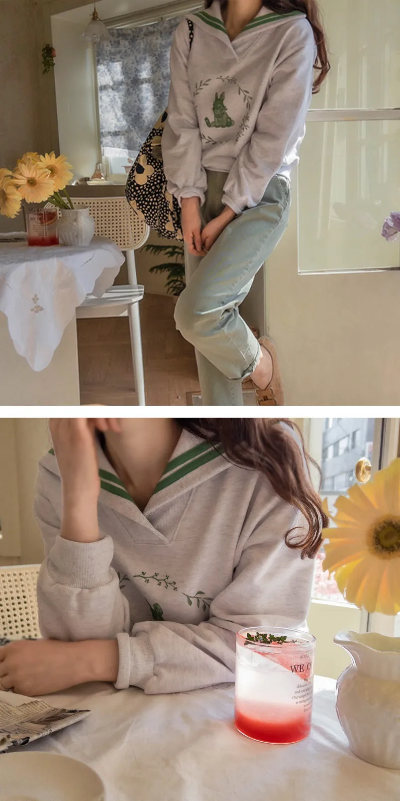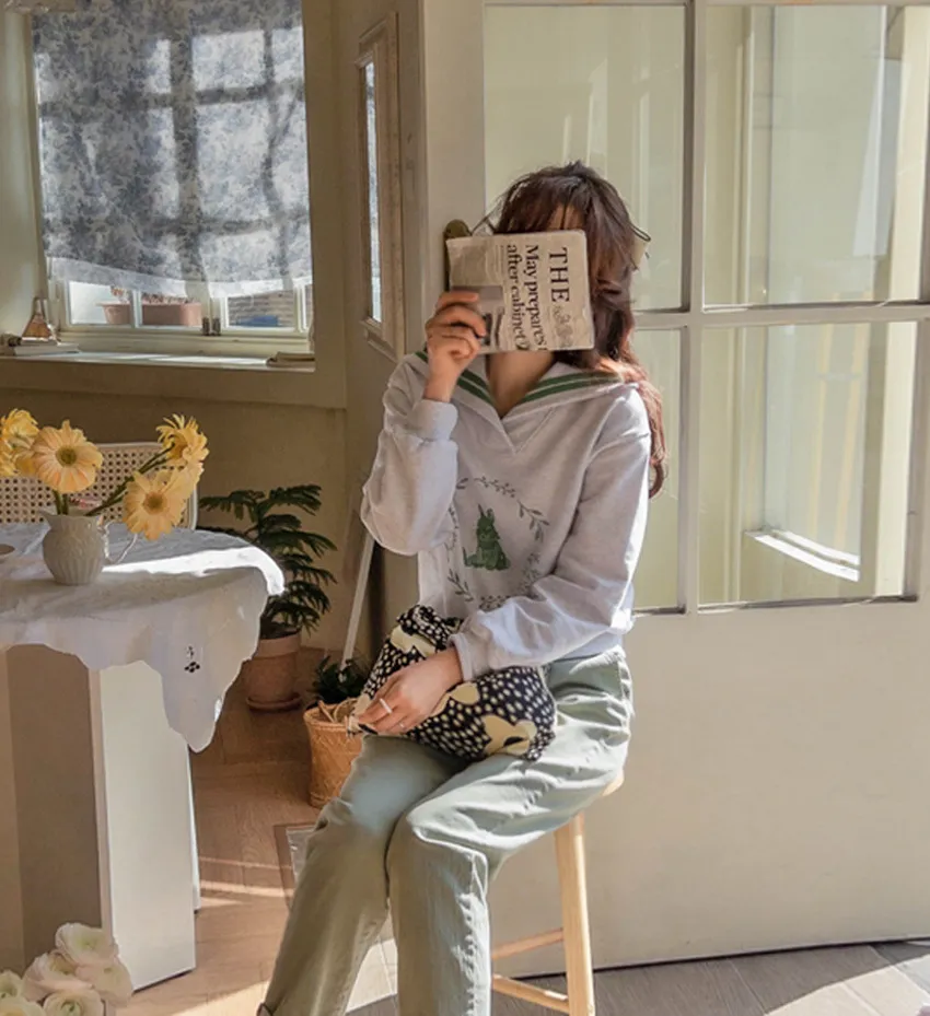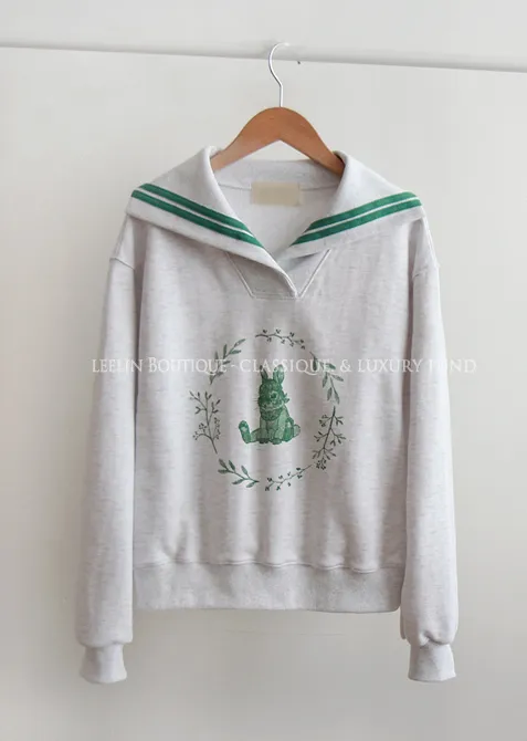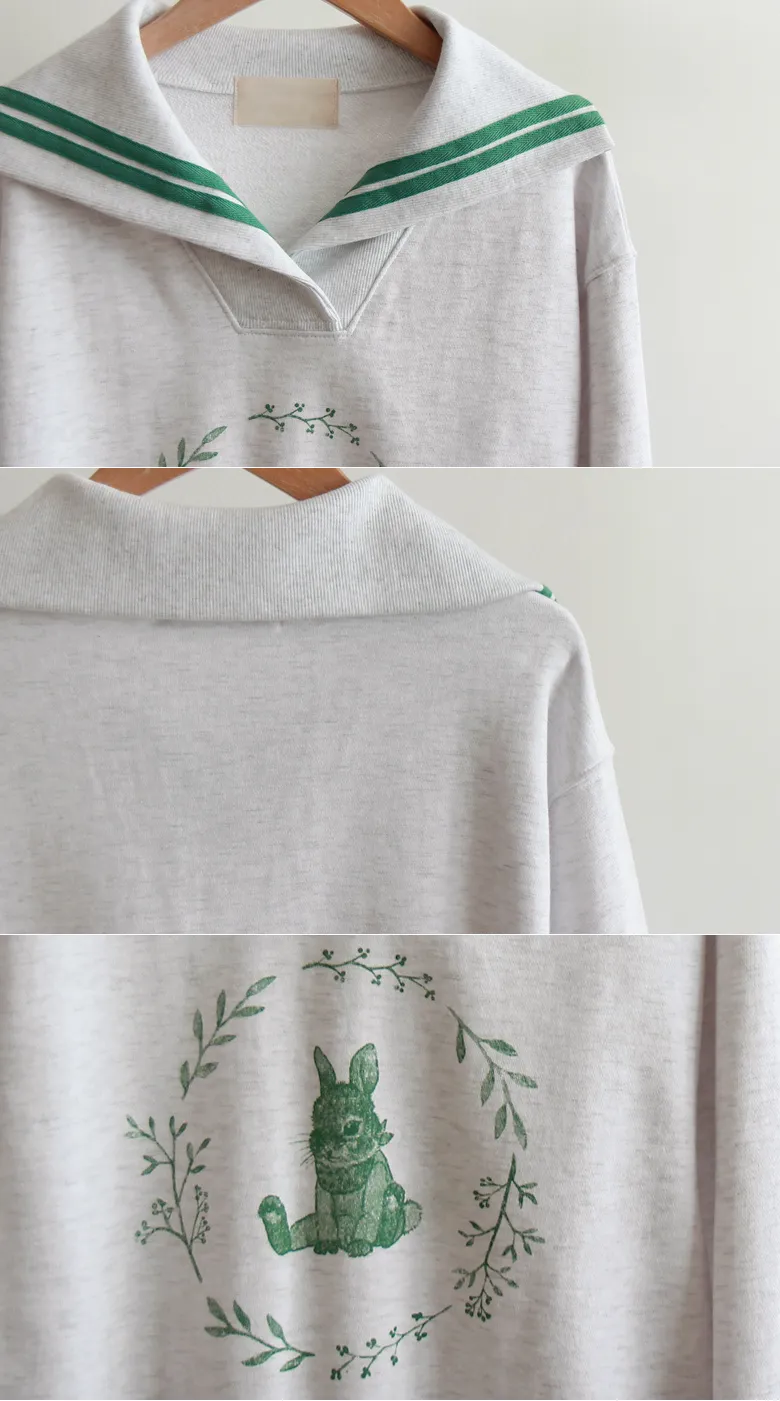 可愛跌坐小兔印花配色線條水手領棉質上衣 灰色穿搭照