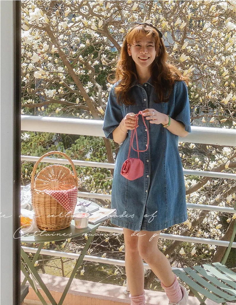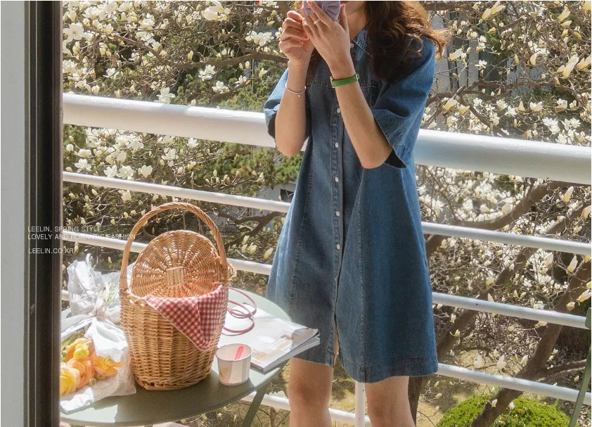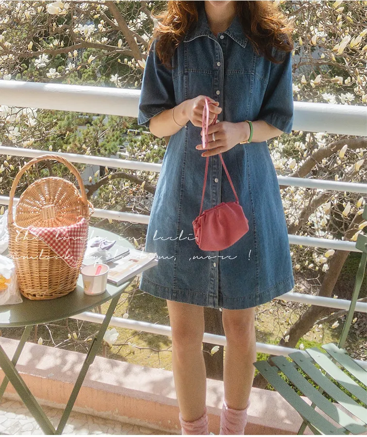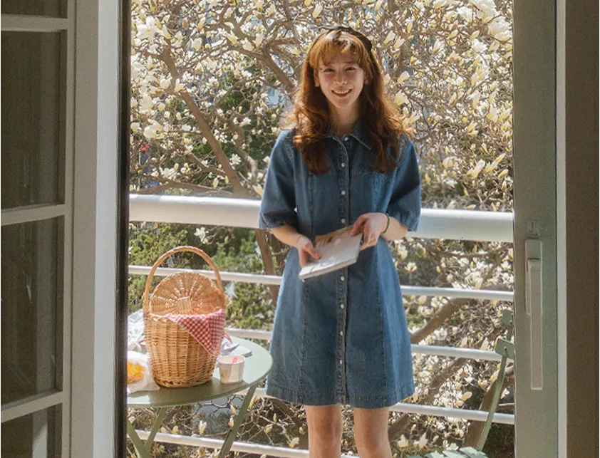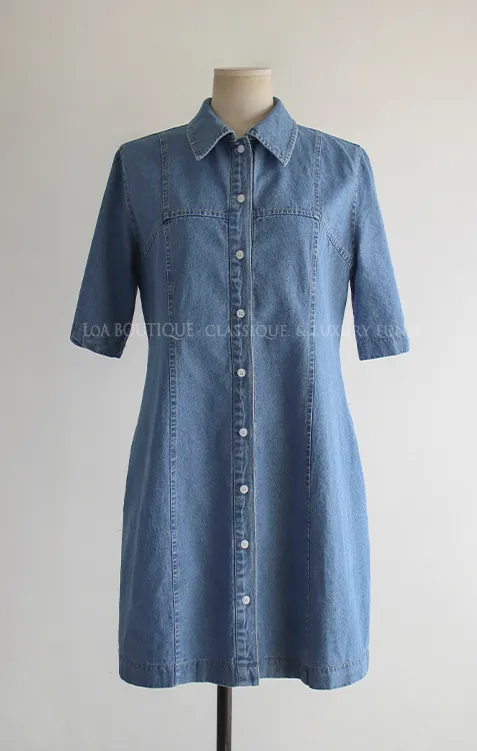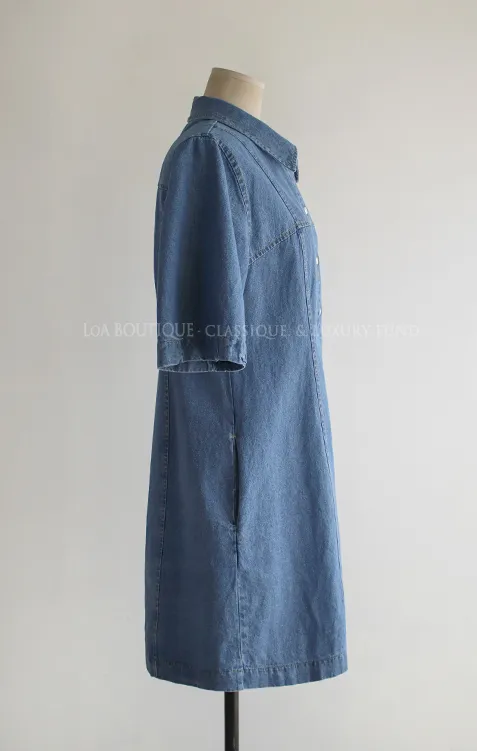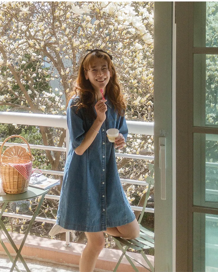 漂亮線條A字版型排扣短袖牛仔連身裙