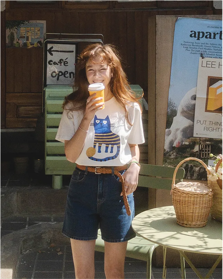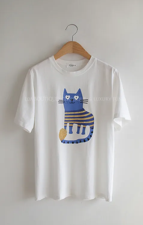 可愛心眼條紋貓咪印花柔軟棉質上衣