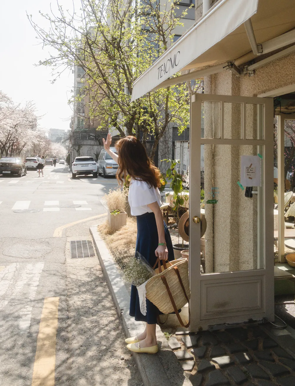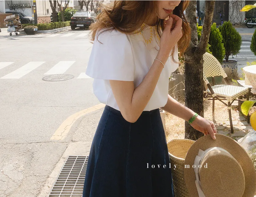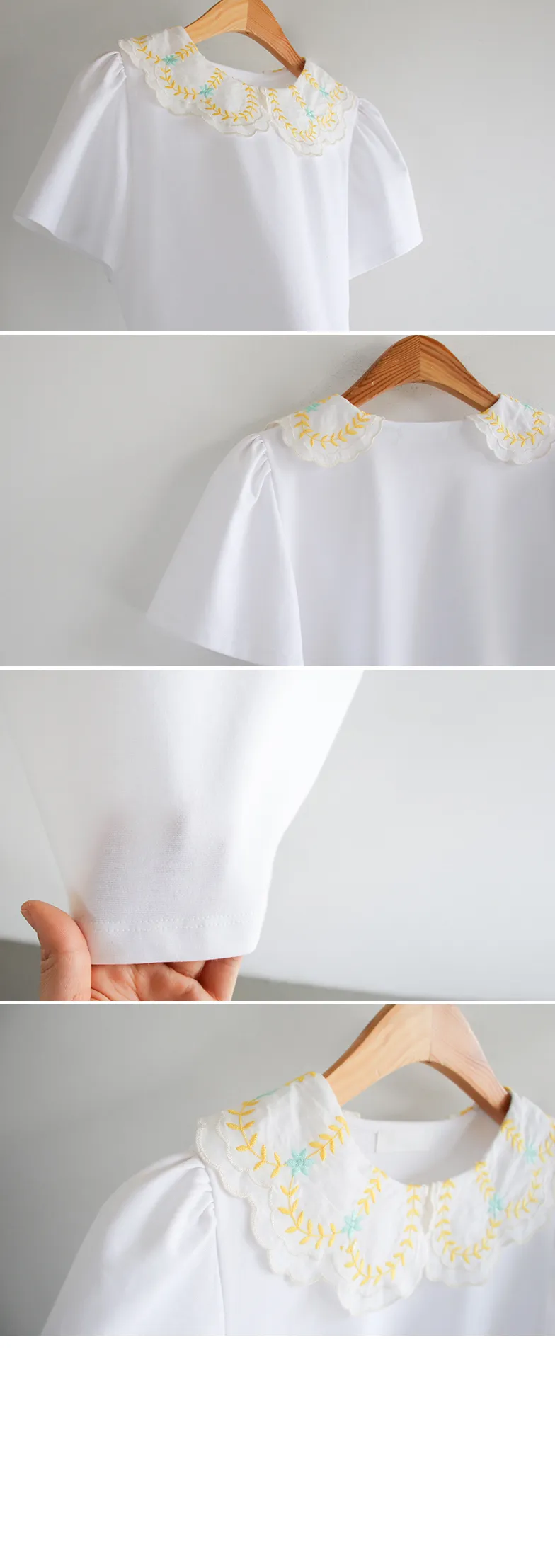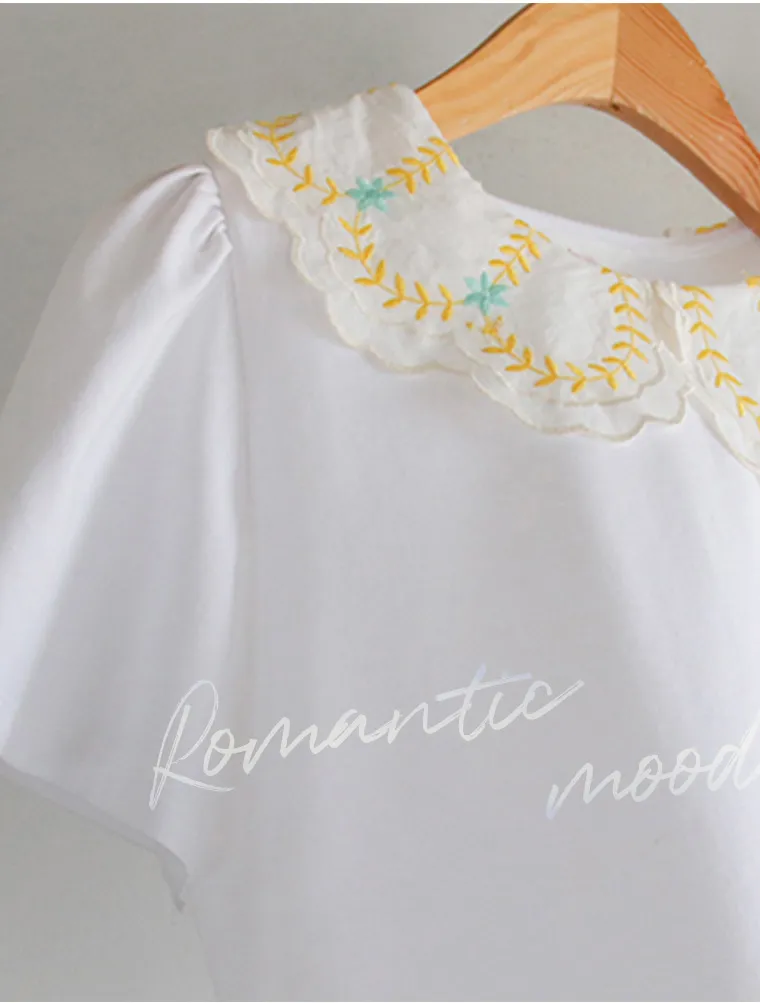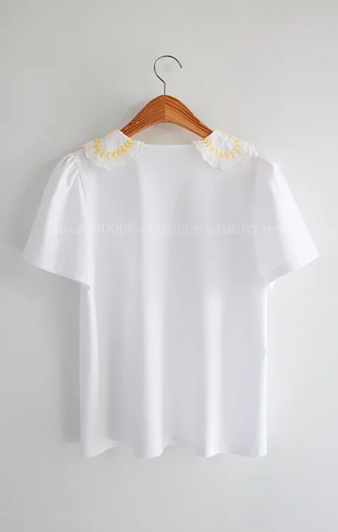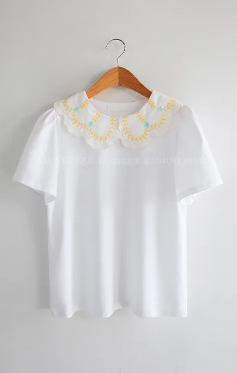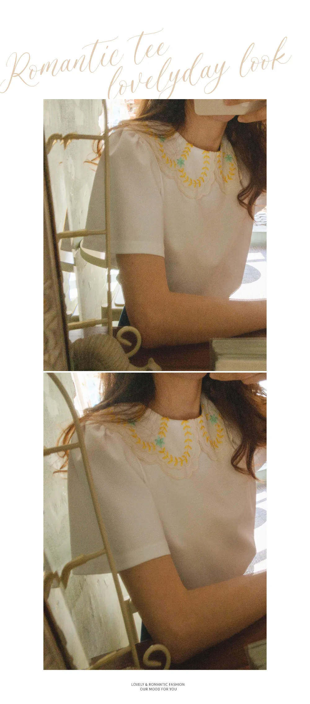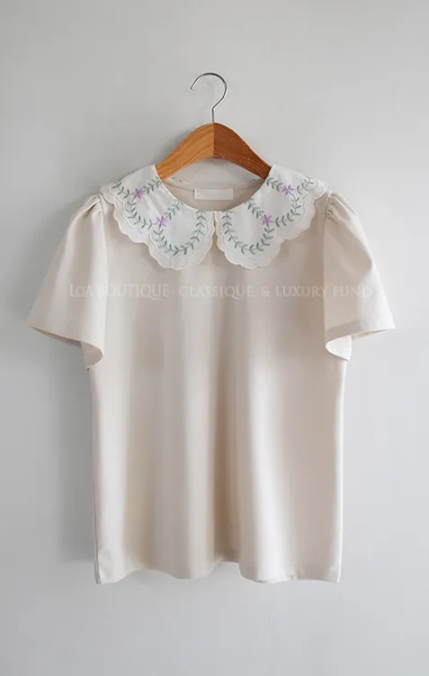 [清新季節的花瓣領上衣♡] [可愛的領線搭配奢華的花朵刺繡] [花蕾般的袖子]