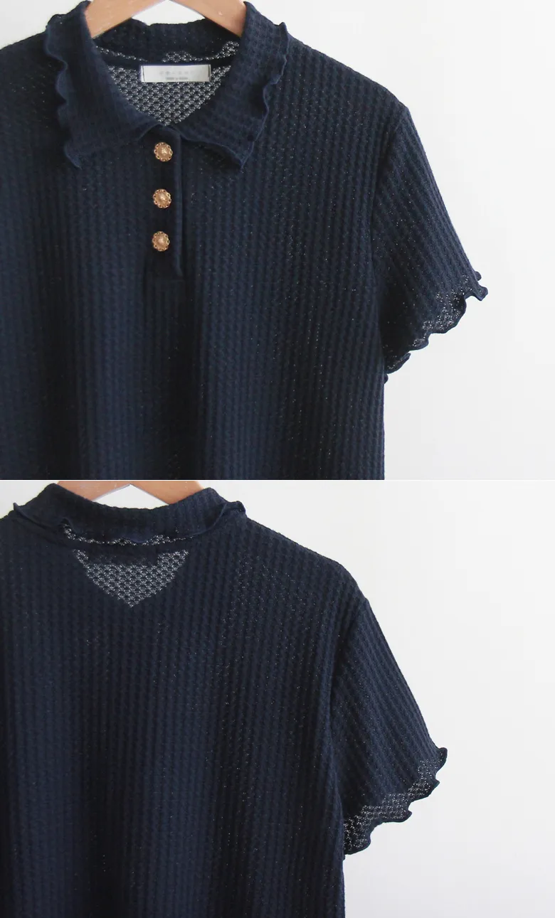 [可開閉鈕扣] [衣領末端有波浪,以金色鈕扣為點的T卹] [彈性舒適的面料] [獨特略帶華夫格圖案的商品] [波浪袖的時尚商品] [輕款、時尚的商品,非常適合日常穿著