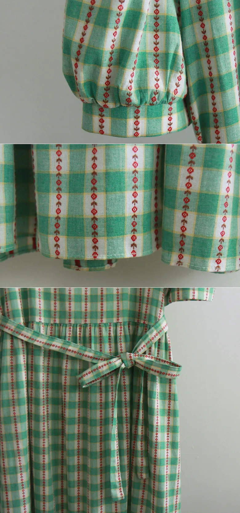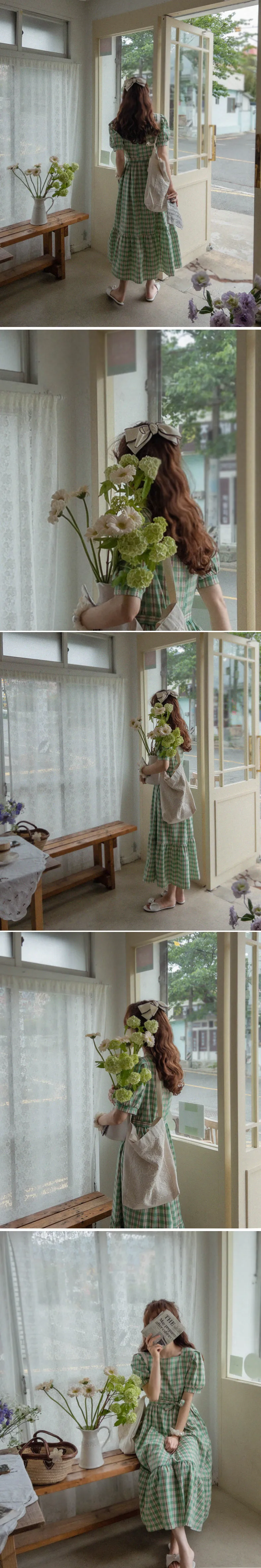 【後拉鍊配置】【繫帶腰帶,網布版型:可拆卸】【連體式格紋圖案,精緻的緹花迷你花朵】【泡泡袖,袖線漂亮,肩線剪裁】【給人精緻清新的感覺】