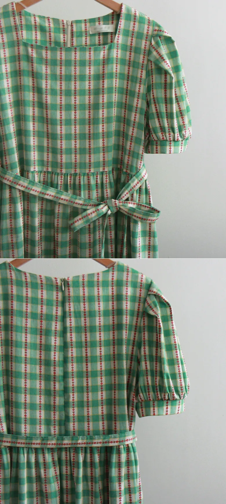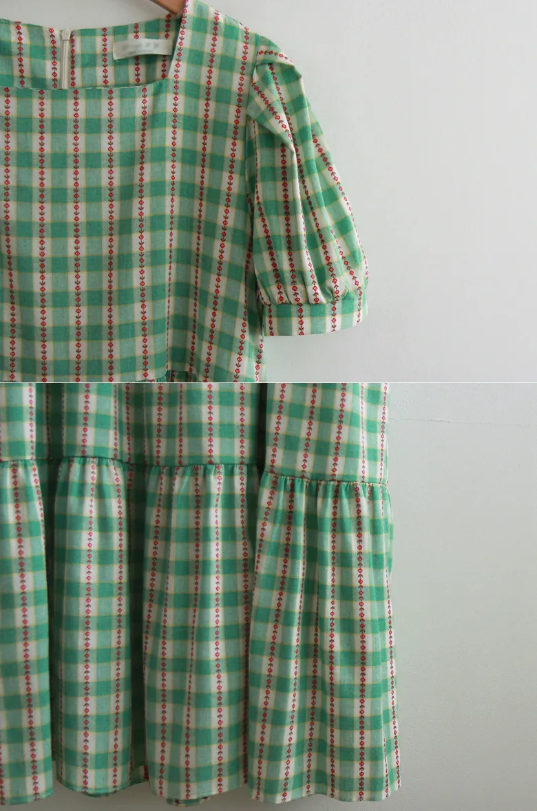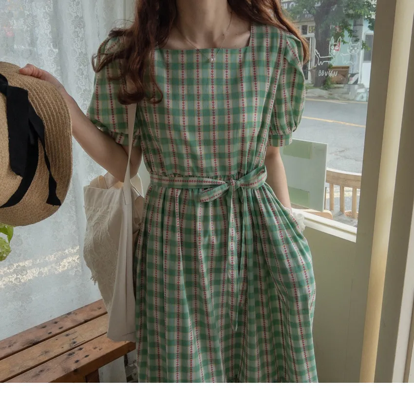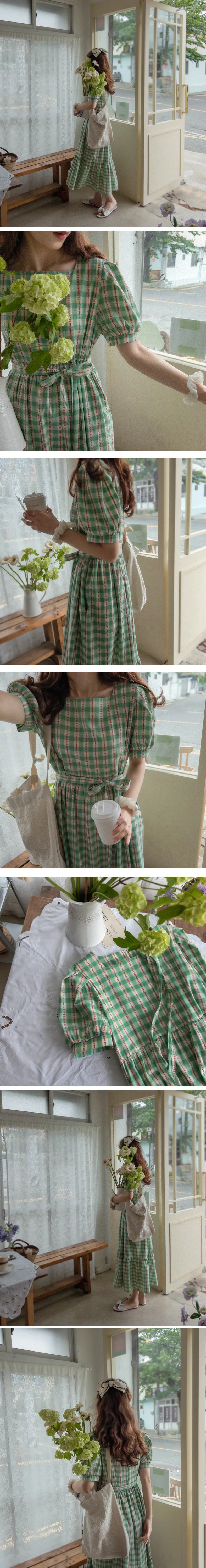 清新格紋迷你緹花泡泡袖附腰帶連身裙